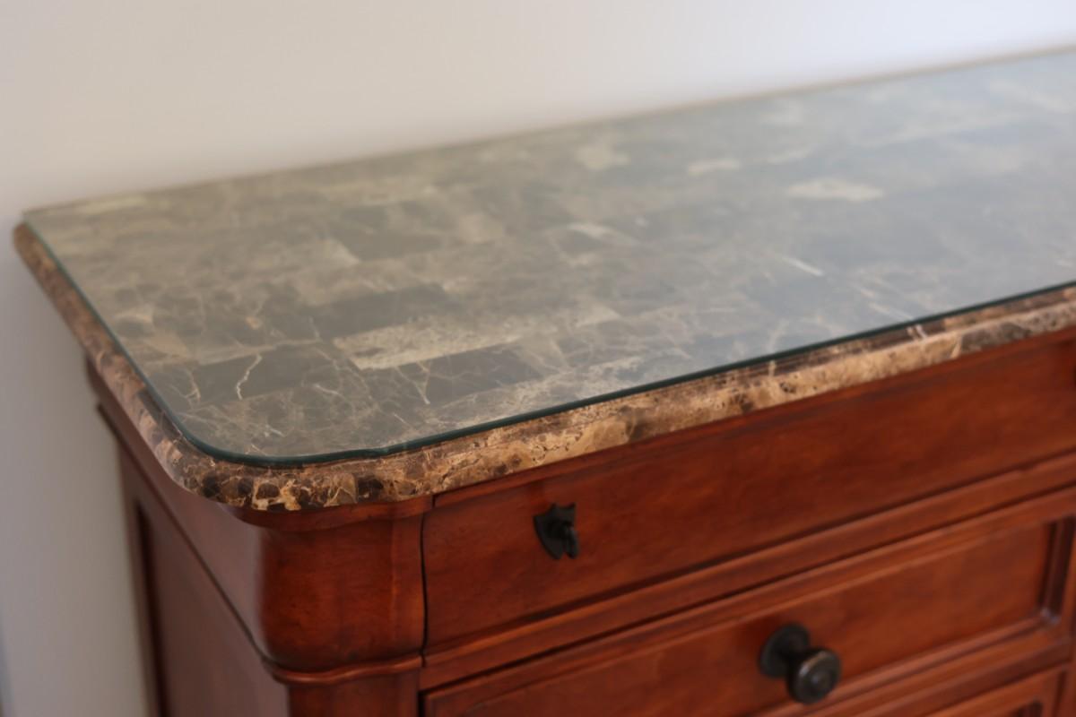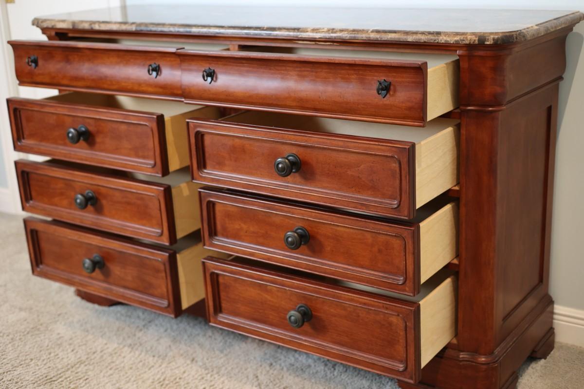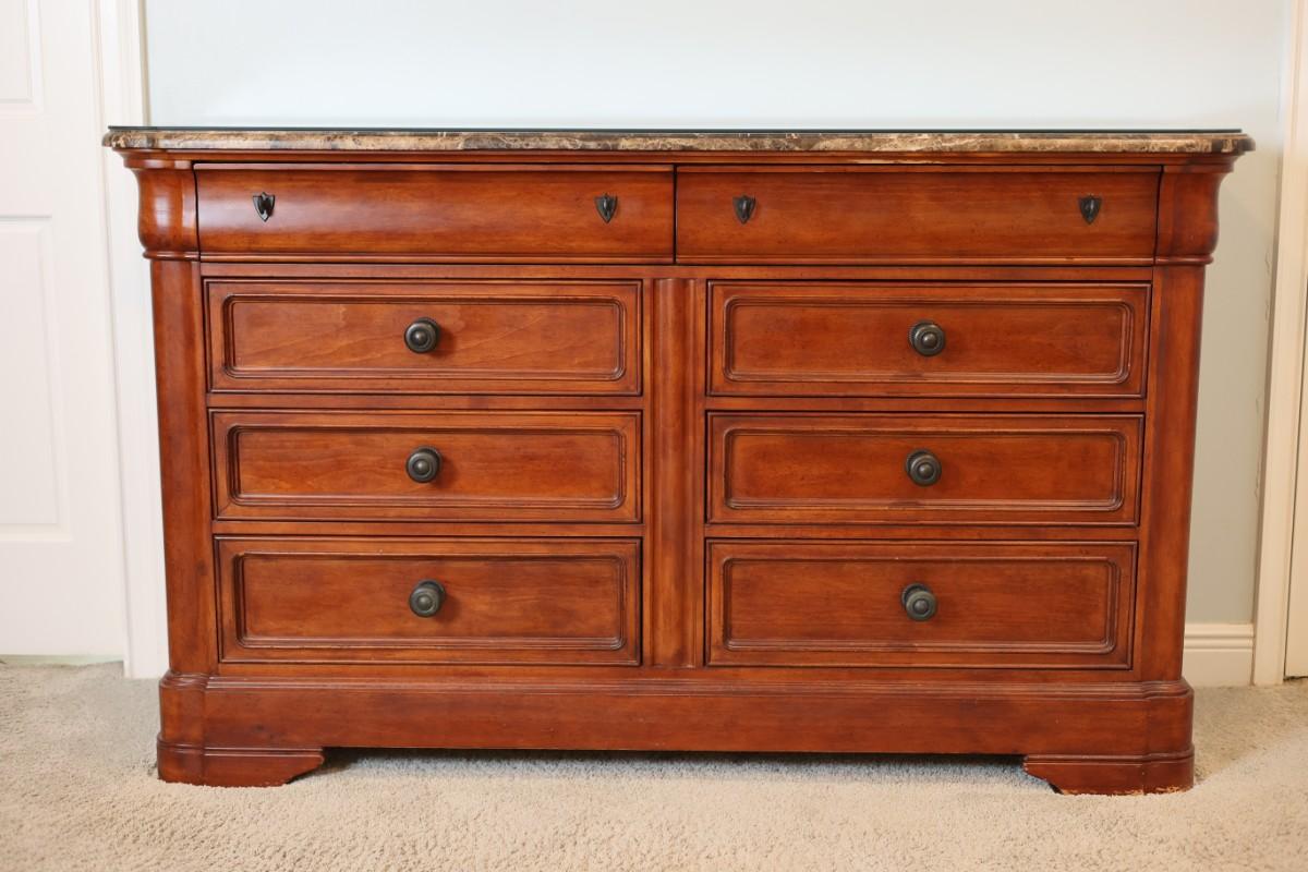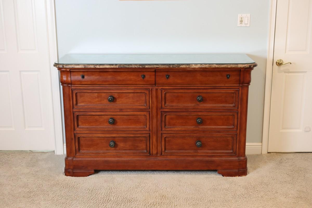 Cindy Crawford Home wood dresser featuring stone-look top with removable glass protector and eight drawers for storage, including two small top drawers and six larger drawers below. Traditional style with dark hardware.