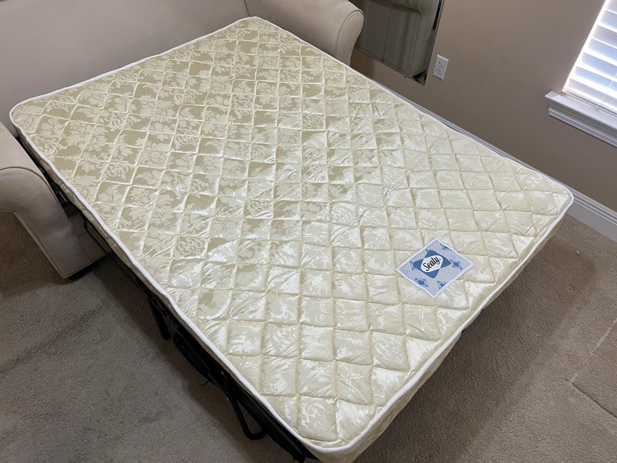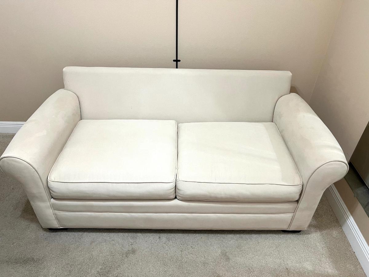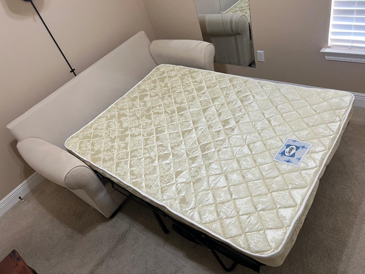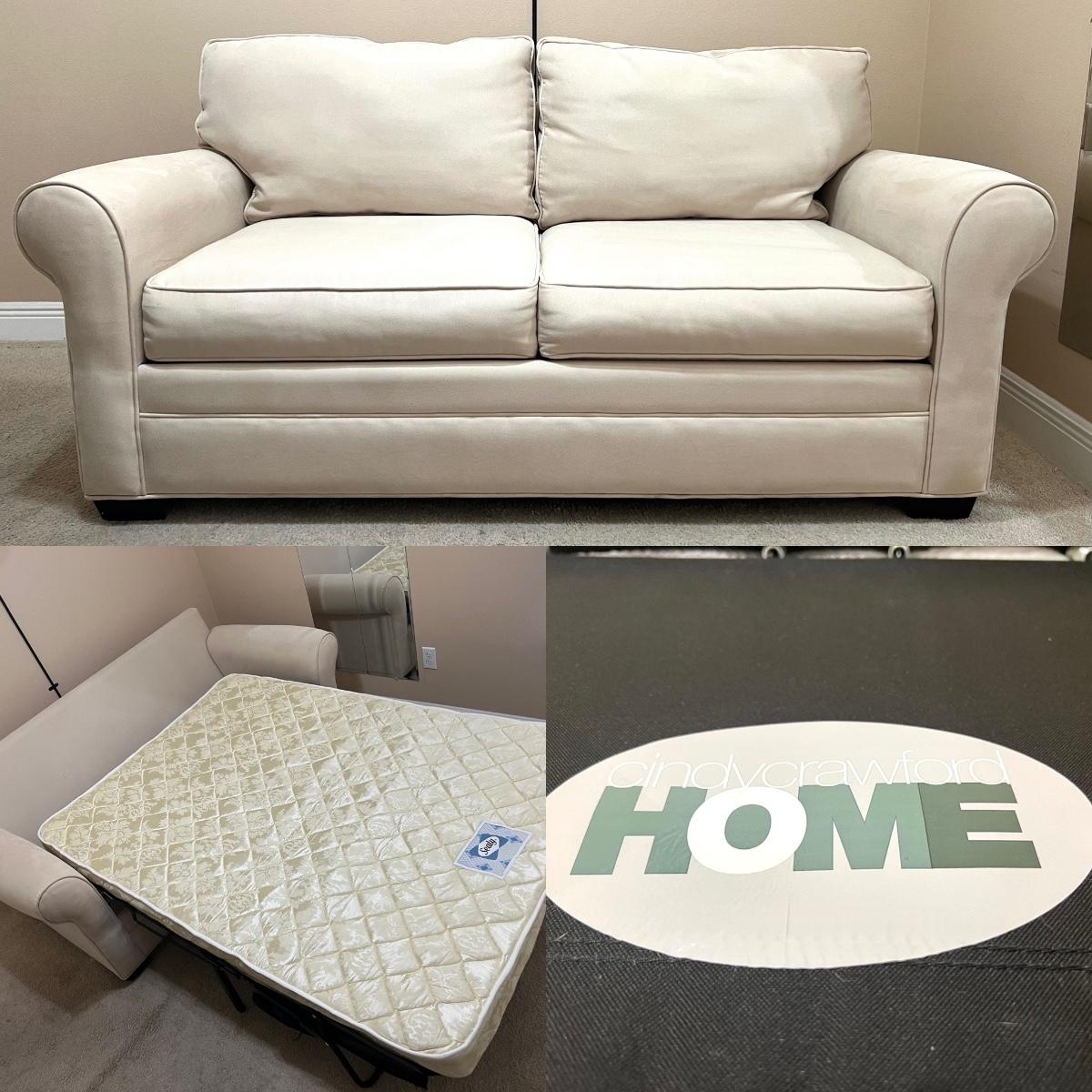 Cindy Crawford off white sleeper sofa. Converts to full size sleeper. Clean with just a few pen marks(see pictures with circles). Mattress is a Sealy and is very clean and had a mattress cover on it. Measures 72”W x 38”D x 35”T to top of cushions.