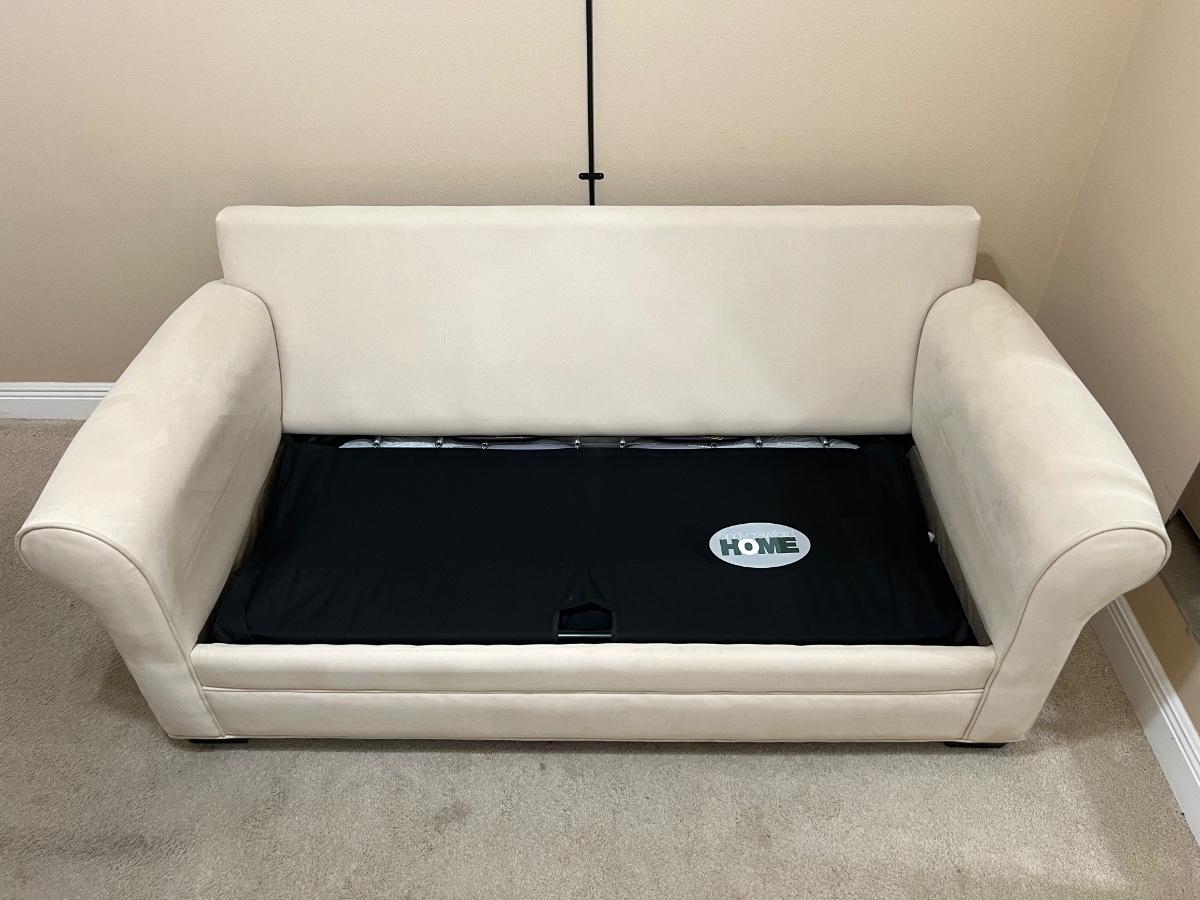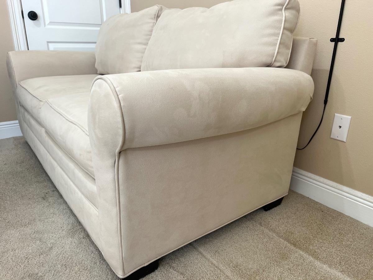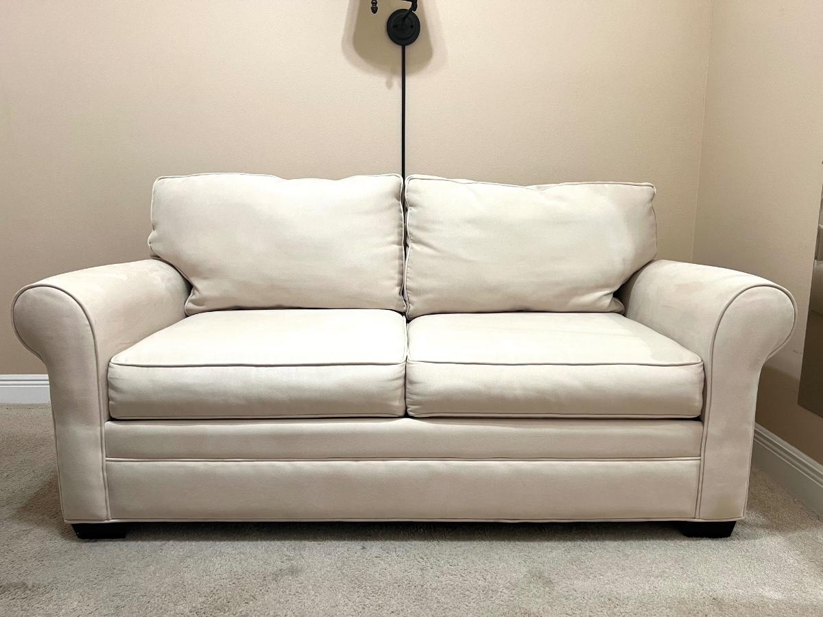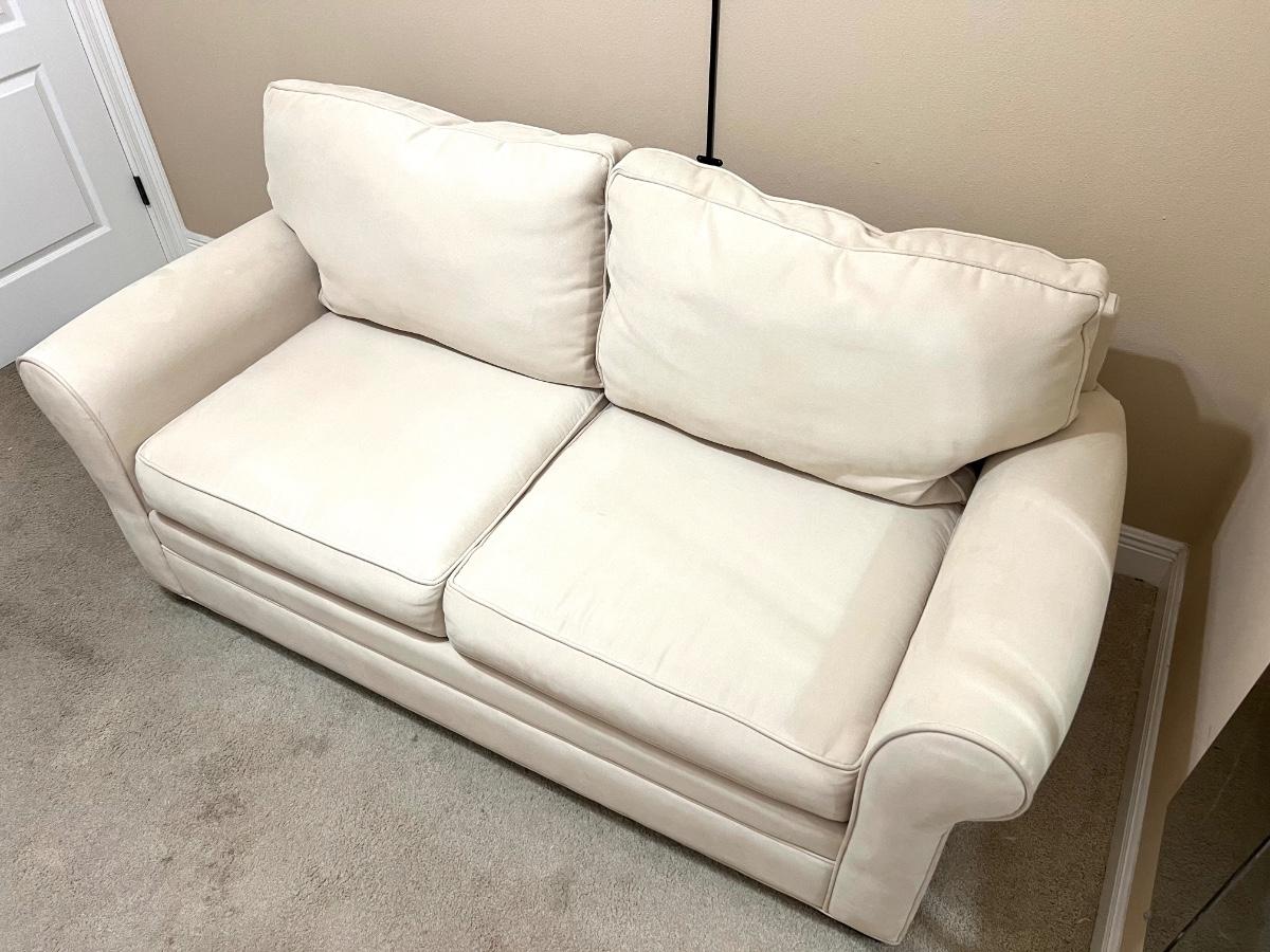 Cindy Crawford off white sleeper sofa. Converts to full size sleeper. Clean with just a few pen marks(see pictures with circles). Mattress is a Sealy and is very clean and had a mattress cover on it. Measures 72”W x 38”D x 35”T to top of cushions.