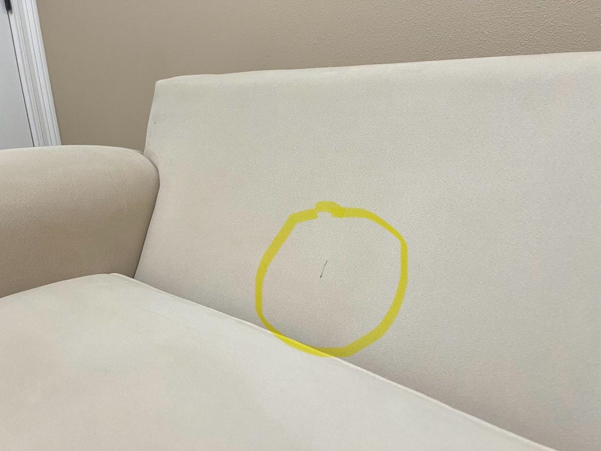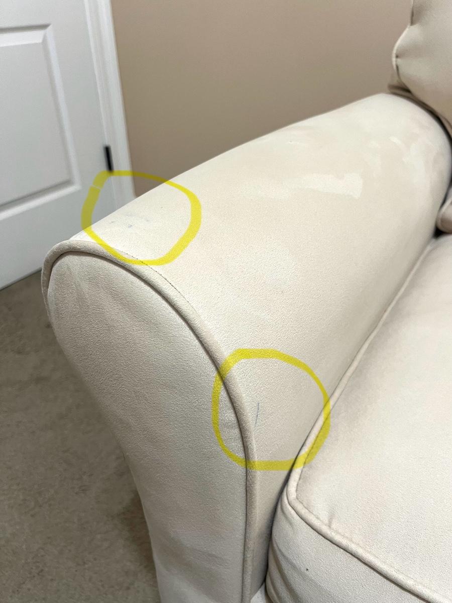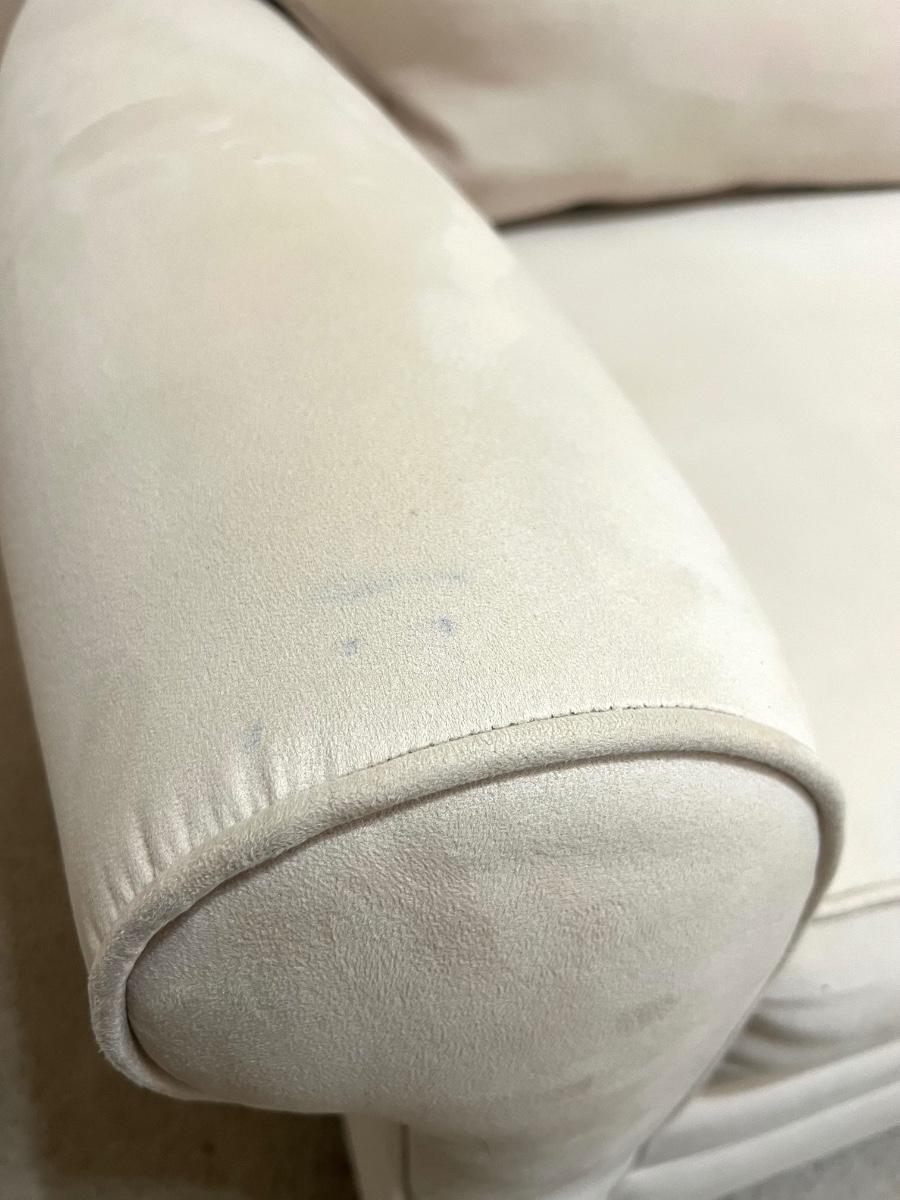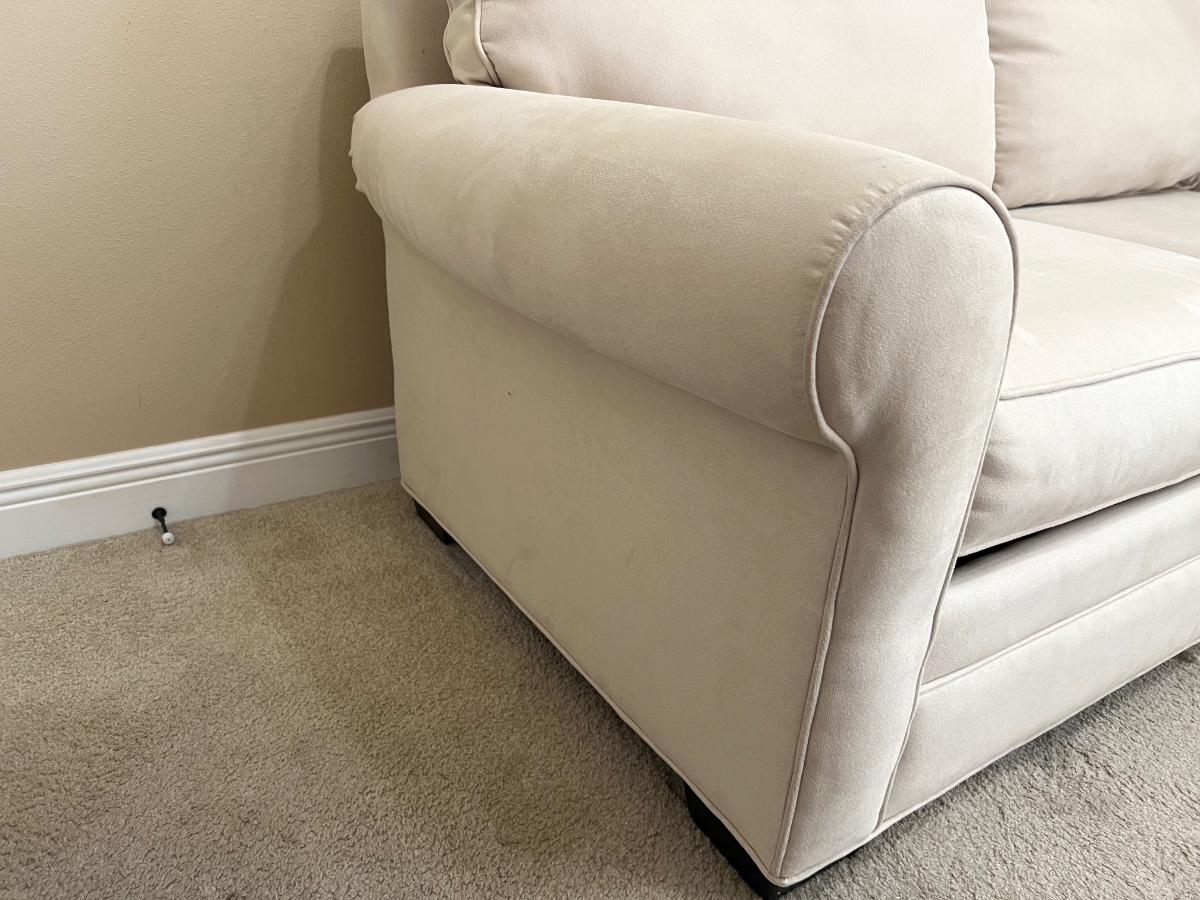 Cindy Crawford off white sleeper sofa. Converts to full size sleeper. Clean with just a few pen marks(see pictures with circles). Mattress is a Sealy and is very clean and had a mattress cover on it. Measures 72”W x 38”D x 35”T to top of cushions.