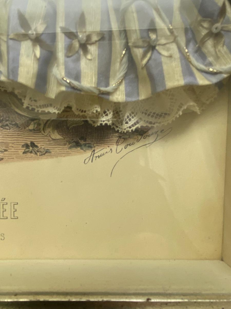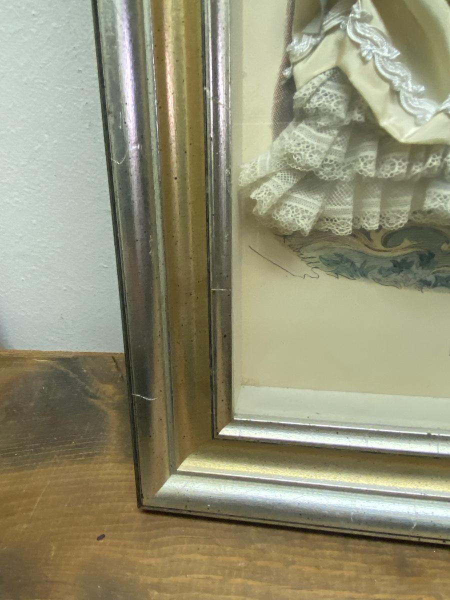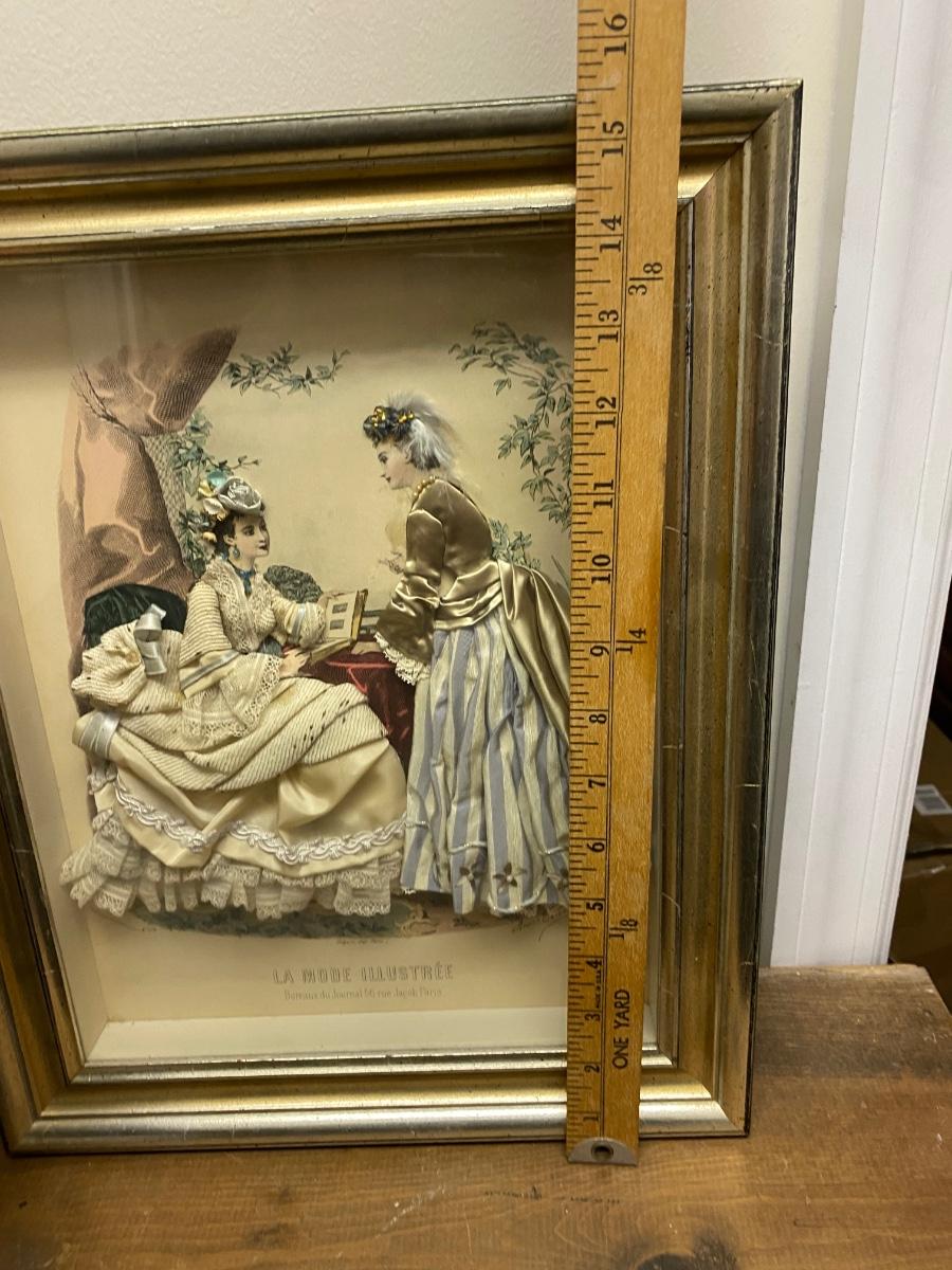 Circa 1870s La Mode Illustree Fabric Embellished Victorian 3D Shadow Box Dress Fashion Print in excellent condition