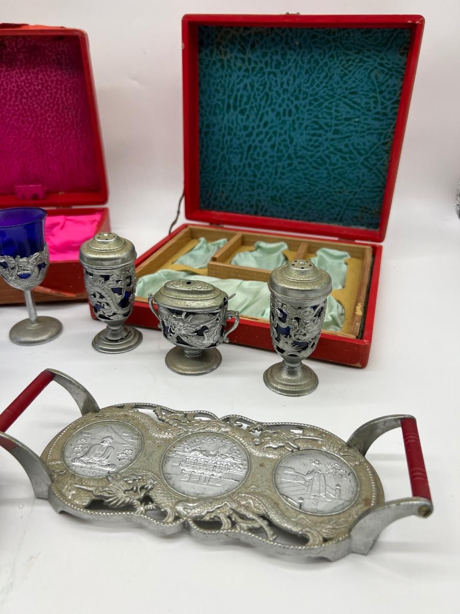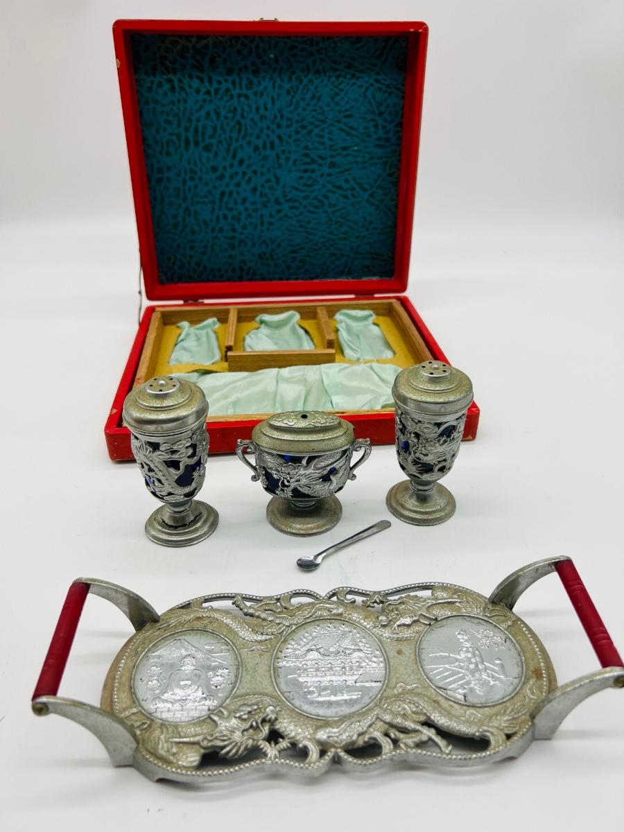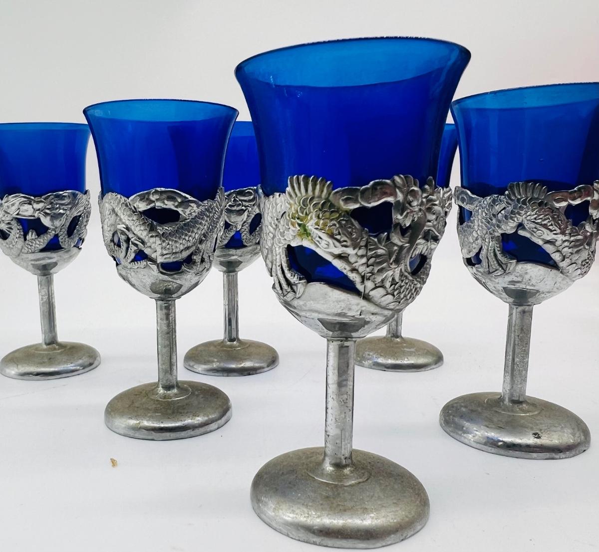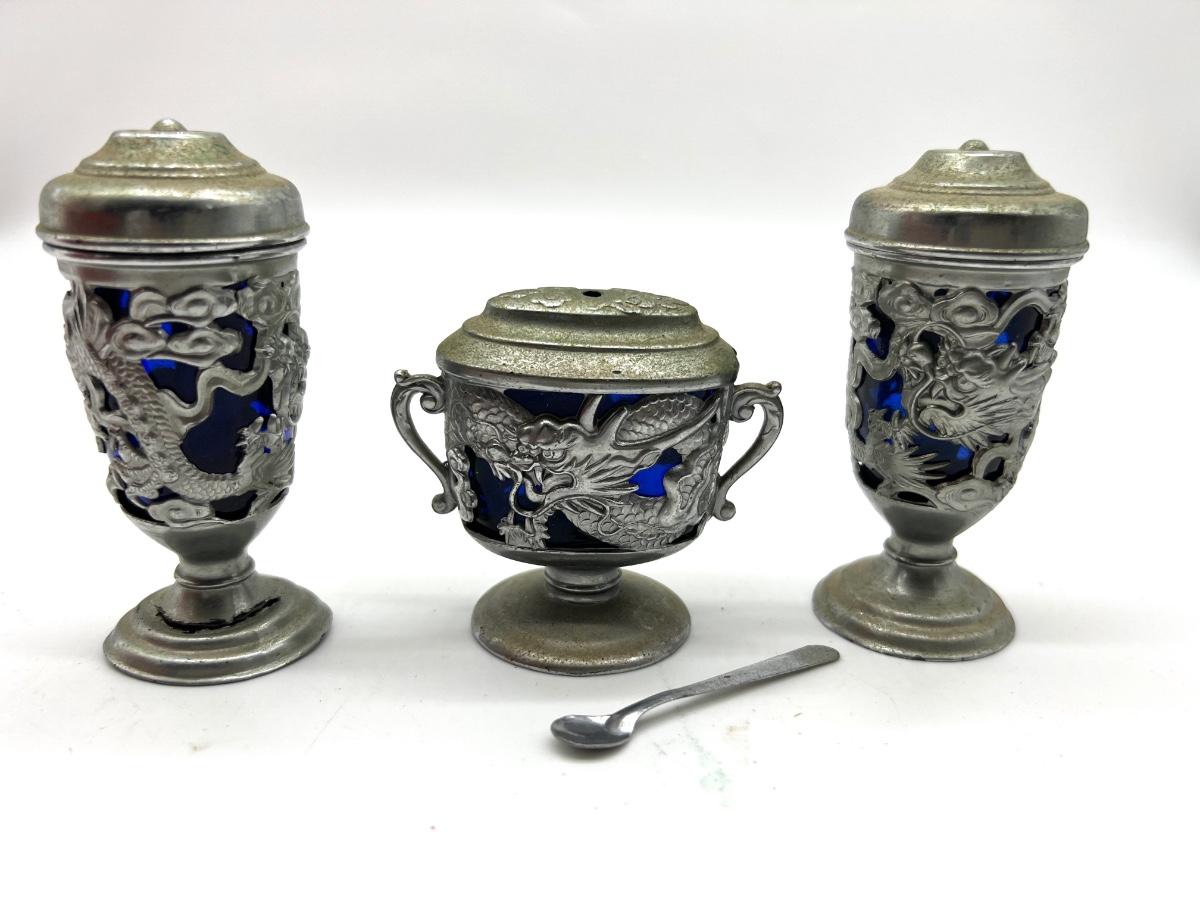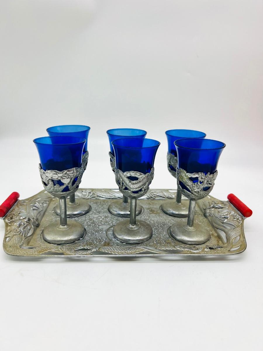 Circa 1900 Japanese Cobalt Blue Glass Silver Salt Mustard Set Dragon. Salt & Pepper measure 3 inches tall, Mustard dish 2 1/2 inches tall, and tray measures 8 1/2 inches long. & 1950s Nikko Silver Japanese Saki Set With Tray, Cobalt Blue Cups. Cups measure 3 1/2 inches tall and Tray measures 10 1/2 inches long.. Could use some polish. Great attic find!