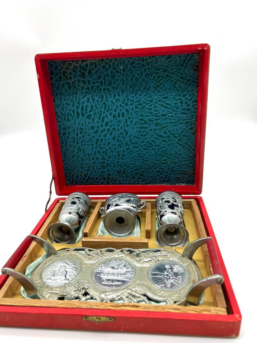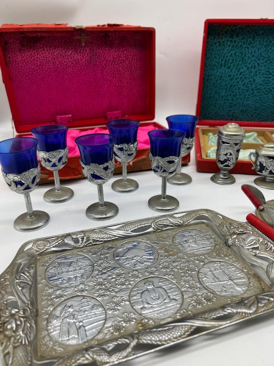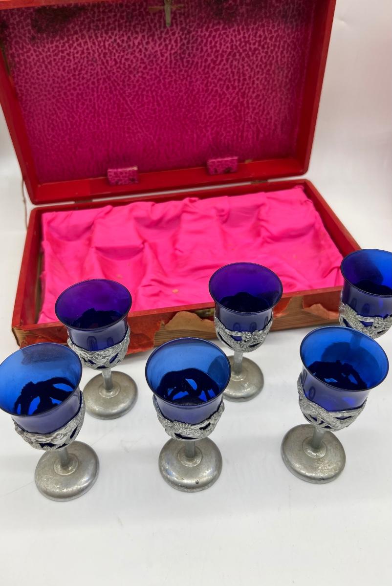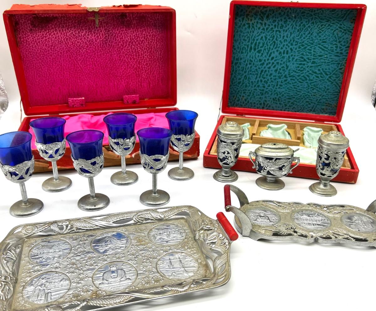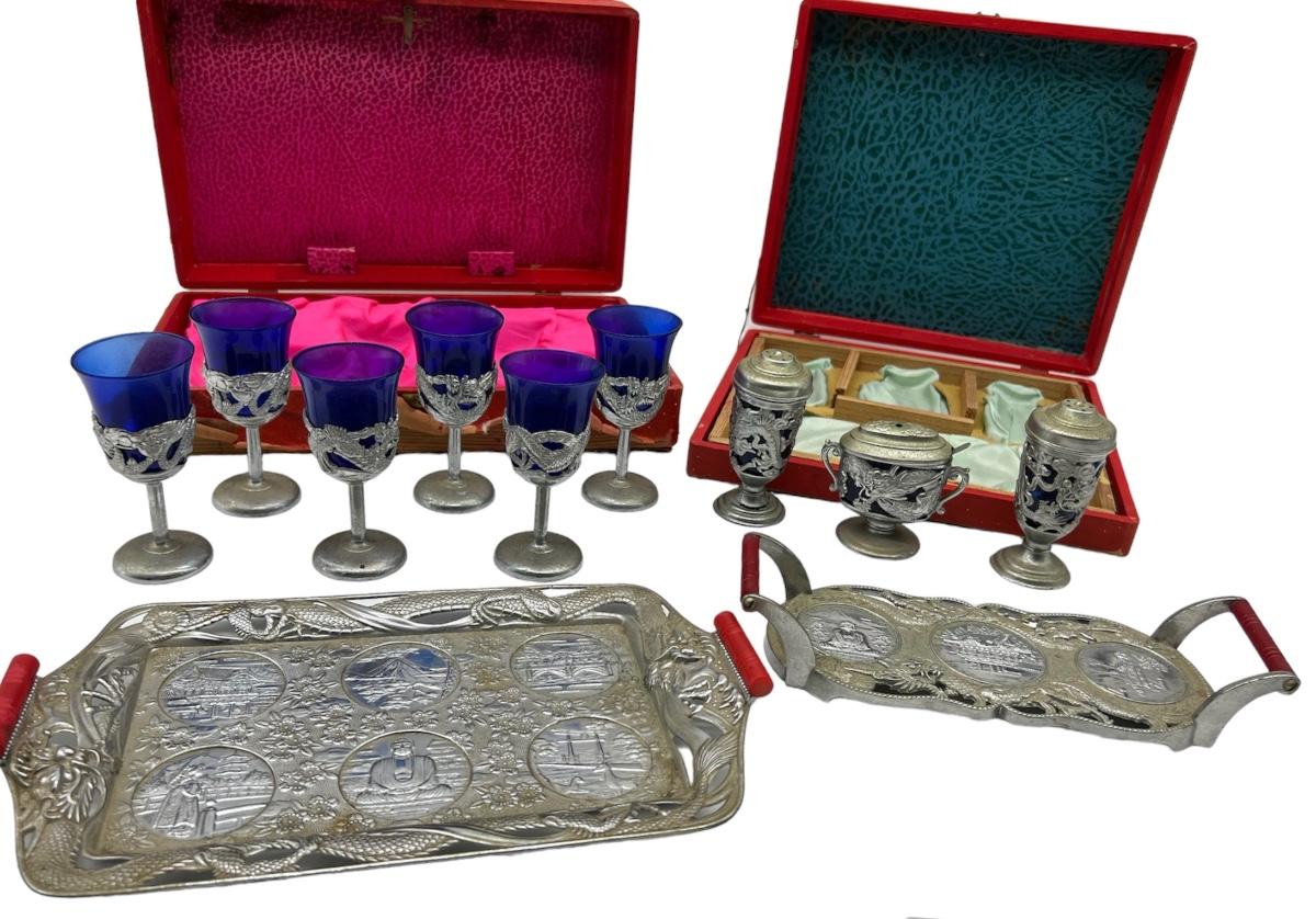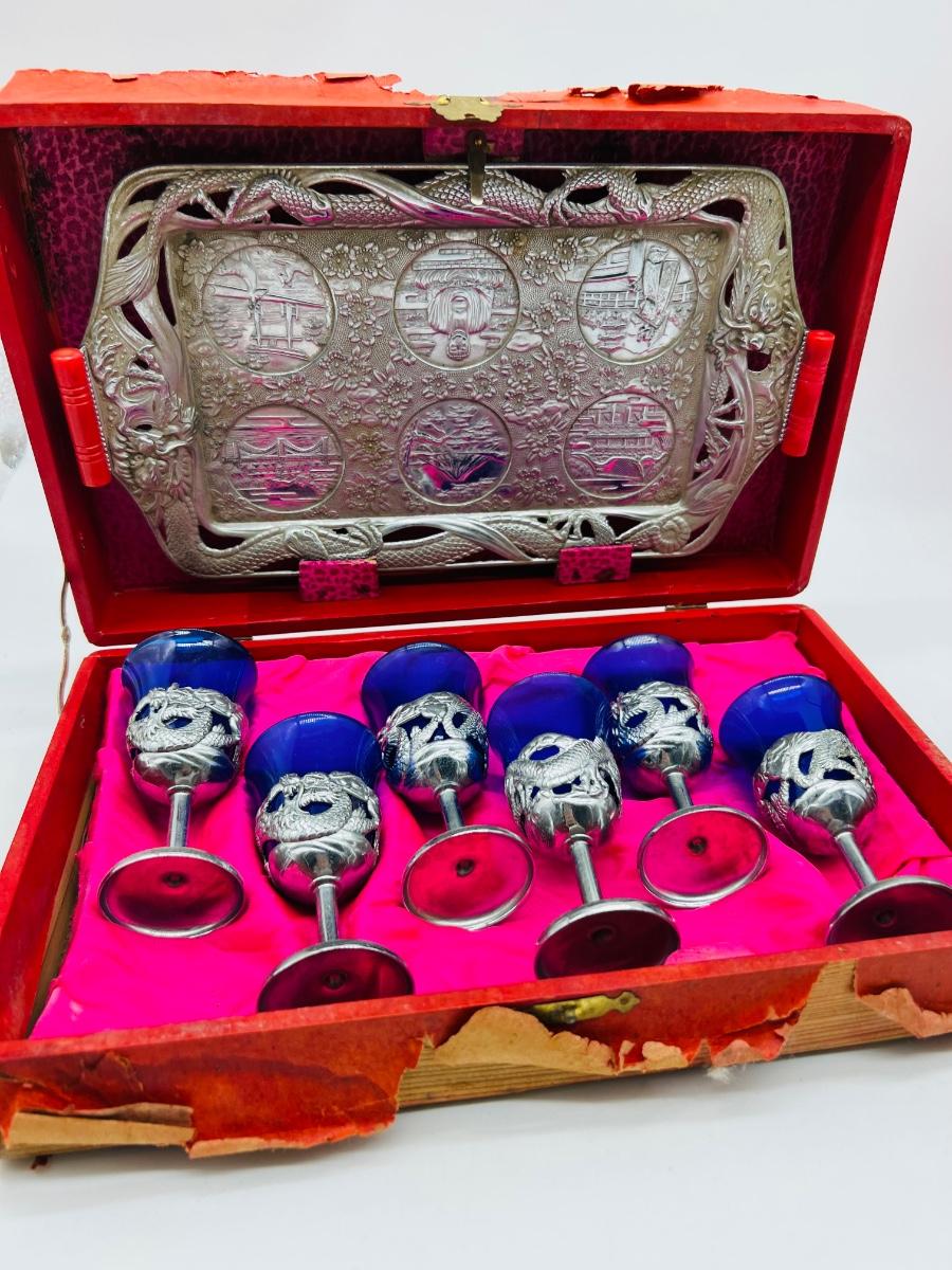 Circa 1900 Japanese Cobalt Blue Glass Silver Salt Mustard Set Dragon. Salt & Pepper measure 3 inches tall, Mustard dish 2 1/2 inches tall, and tray measures 8 1/2 inches long. & 1950s Nikko Silver Japanese Saki Set With Tray, Cobalt Blue Cups. Cups measure 3 1/2 inches tall and Tray measures 10 1/2 inches long.. Could use some polish. Great attic find!