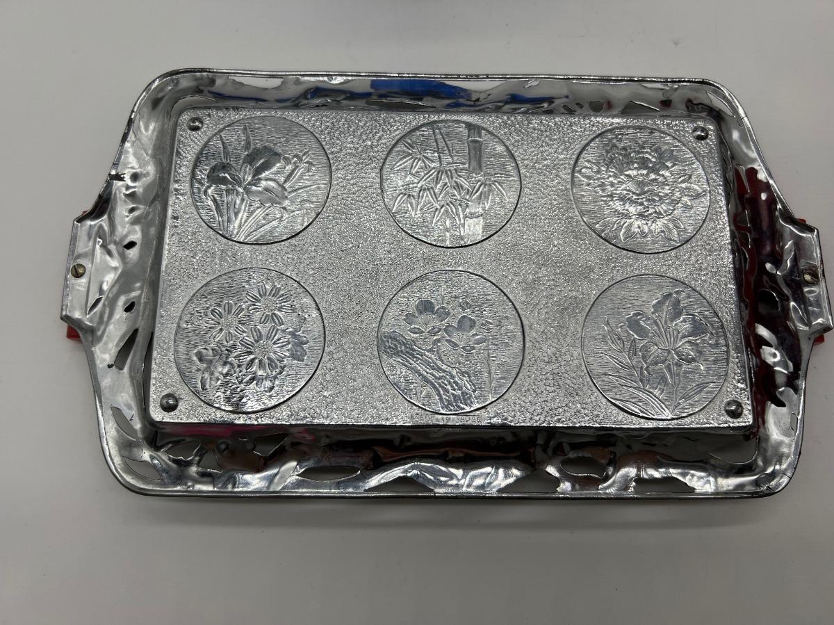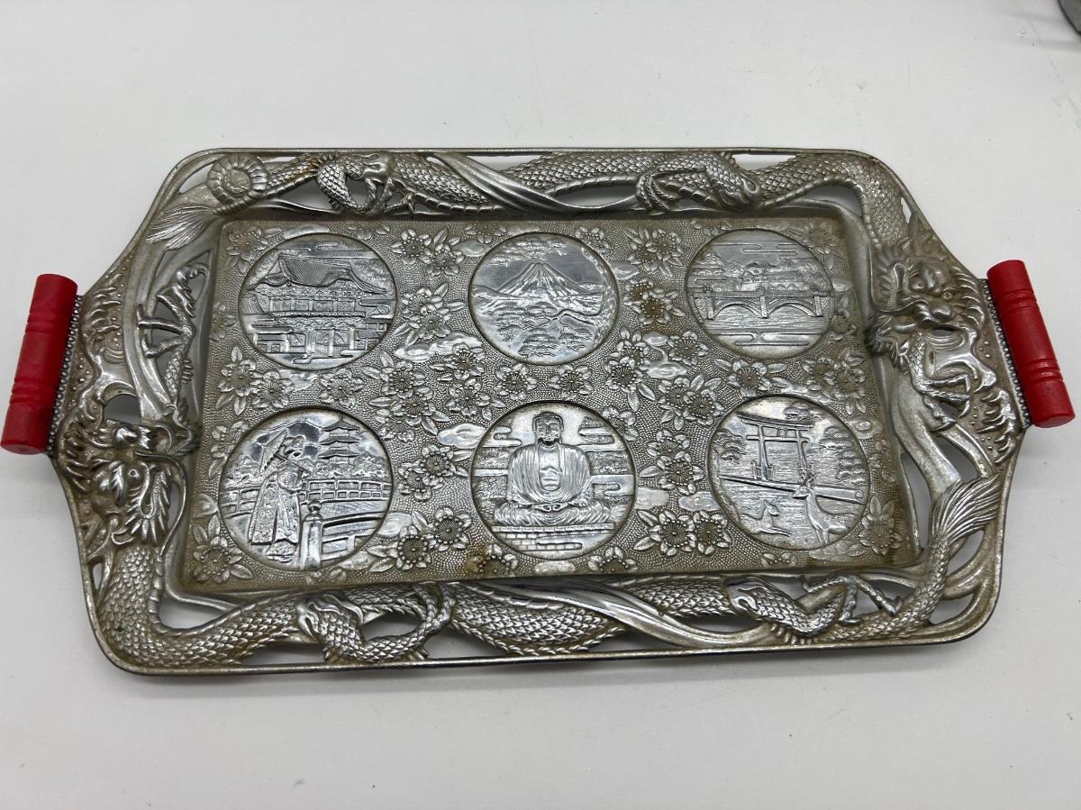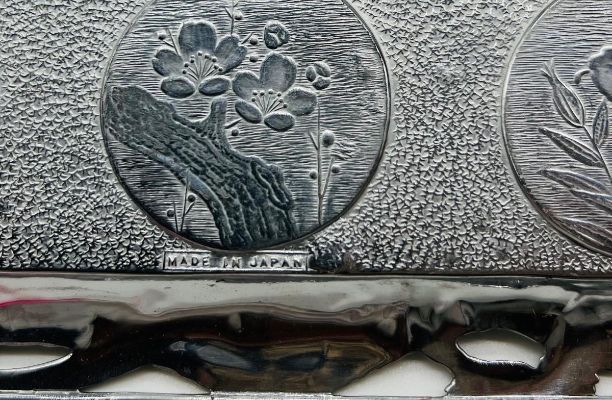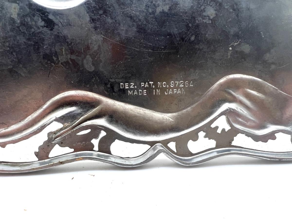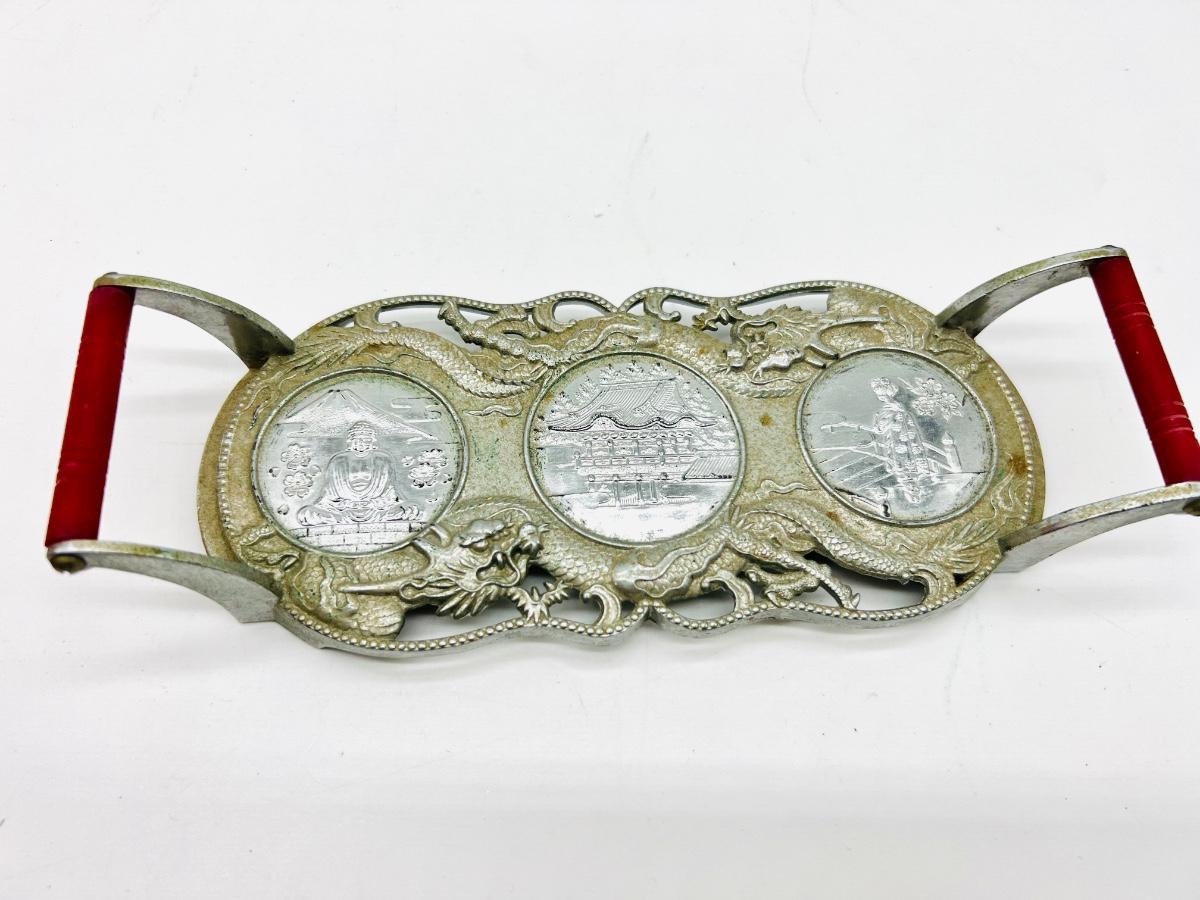 Circa 1900 Japanese Cobalt Blue Glass Silver Salt Mustard Set Dragon. Salt & Pepper measure 3 inches tall, Mustard dish 2 1/2 inches tall, and tray measures 8 1/2 inches long. & 1950s Nikko Silver Japanese Saki Set With Tray, Cobalt Blue Cups. Cups measure 3 1/2 inches tall and Tray measures 10 1/2 inches long.. Could use some polish. Great attic find!