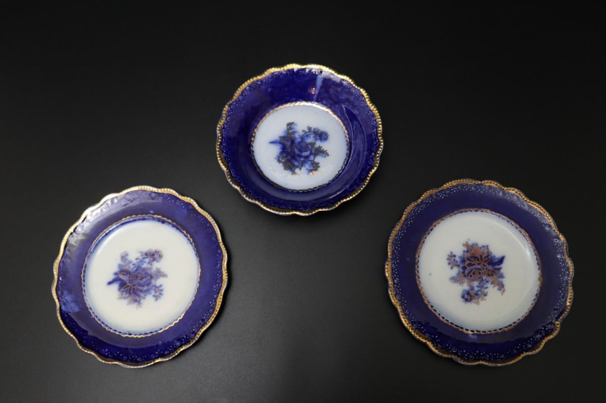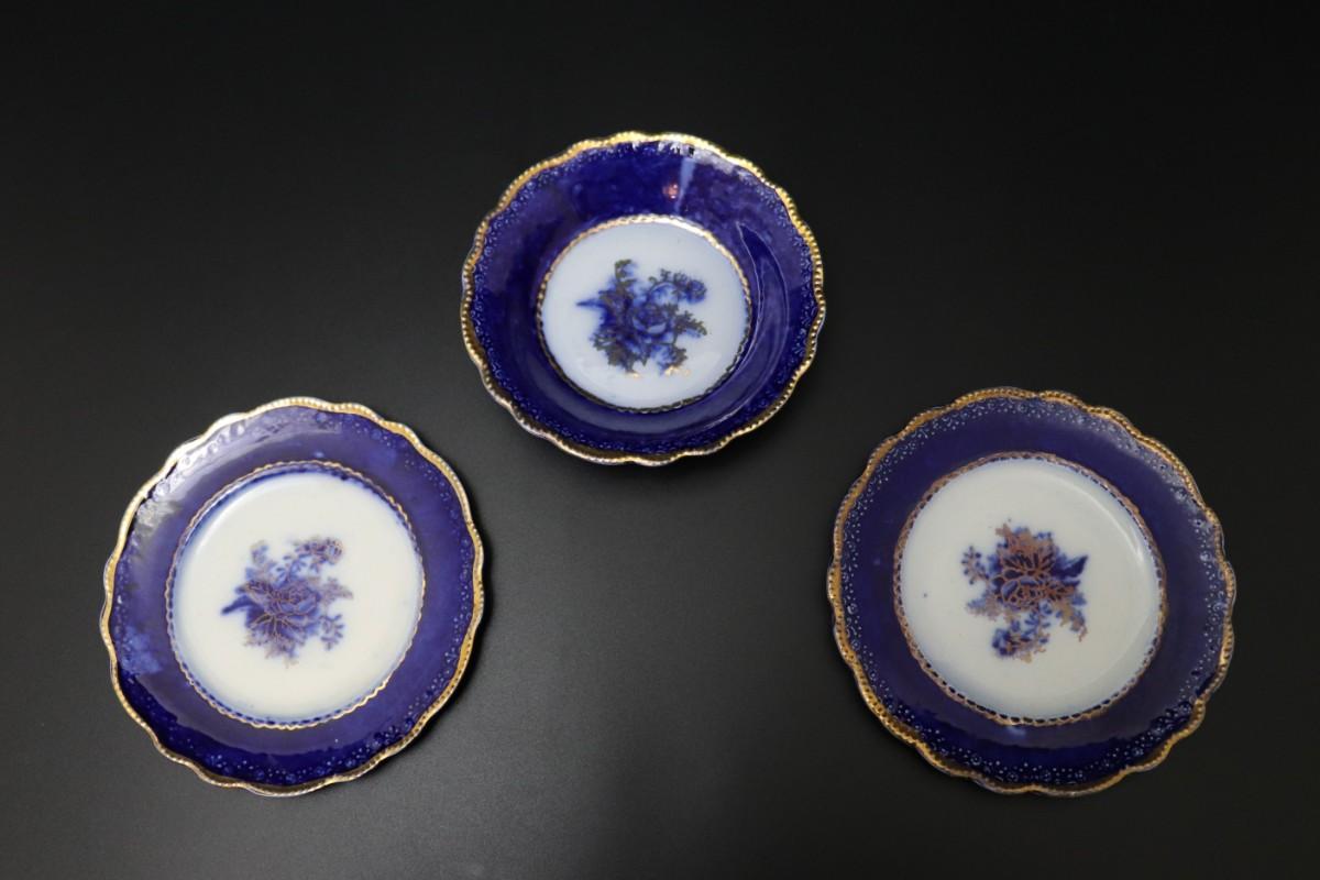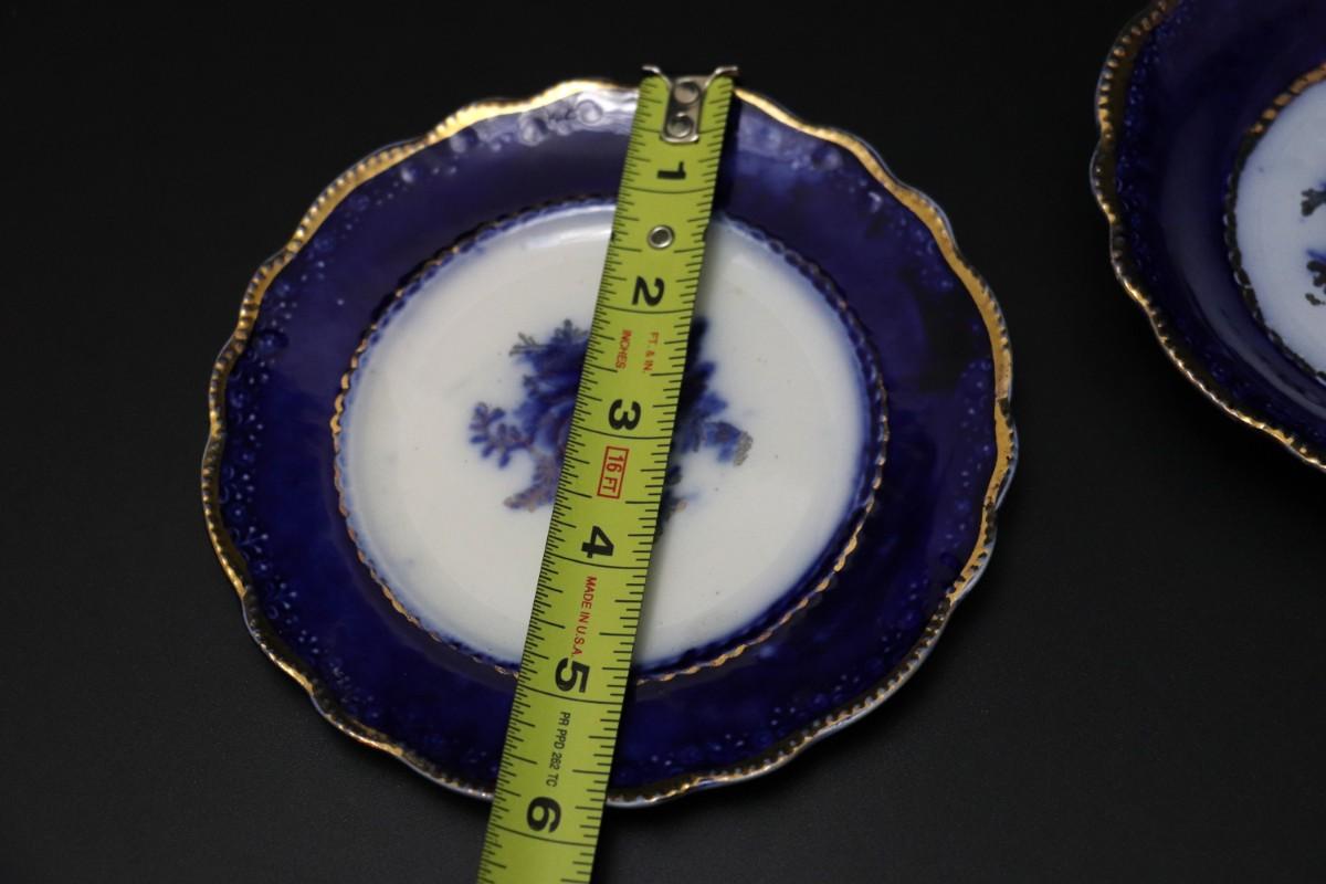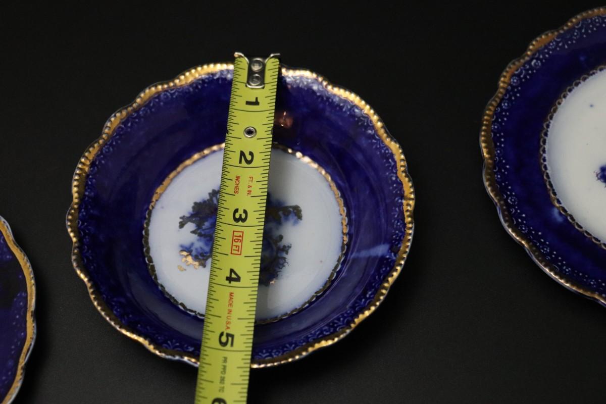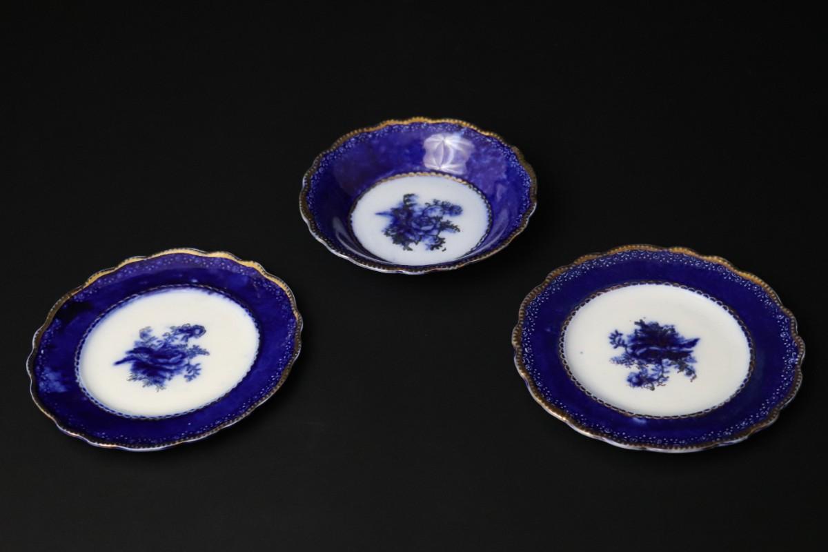 Lot of 3 (2 dessert plates and 1 bowl) of Blue Flow and Gold China. Stamp associated to Arthur J Wilkinson for Royal Staffordshire Pottery Burslem England circa 1907. Good condition; no visible cracks or chips. Please review images carefully and reach out with any questions.