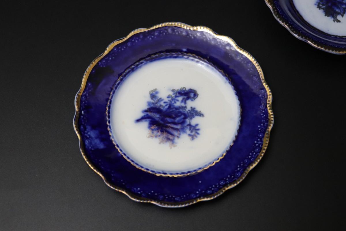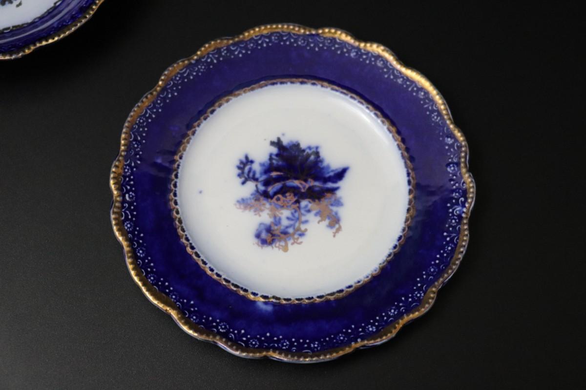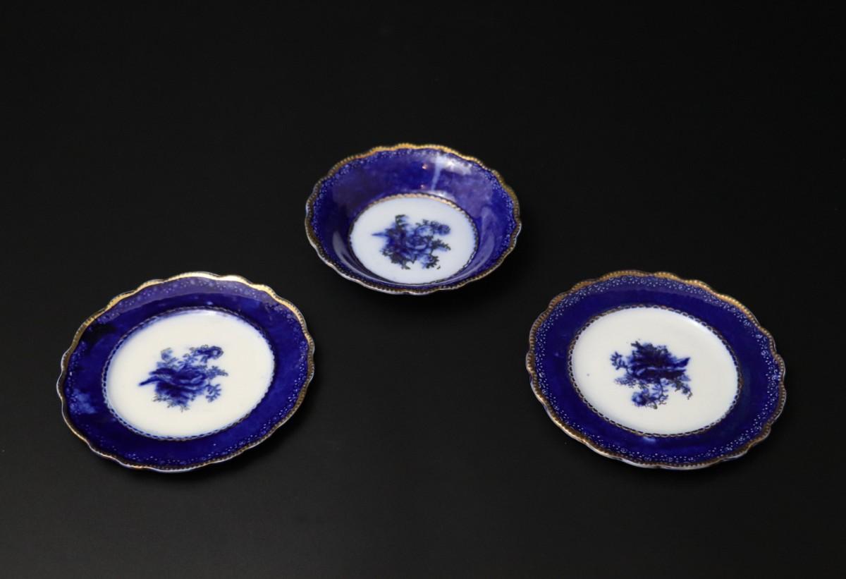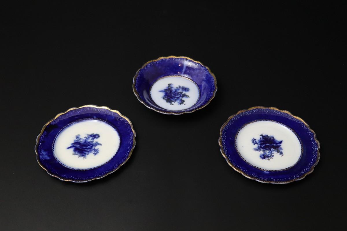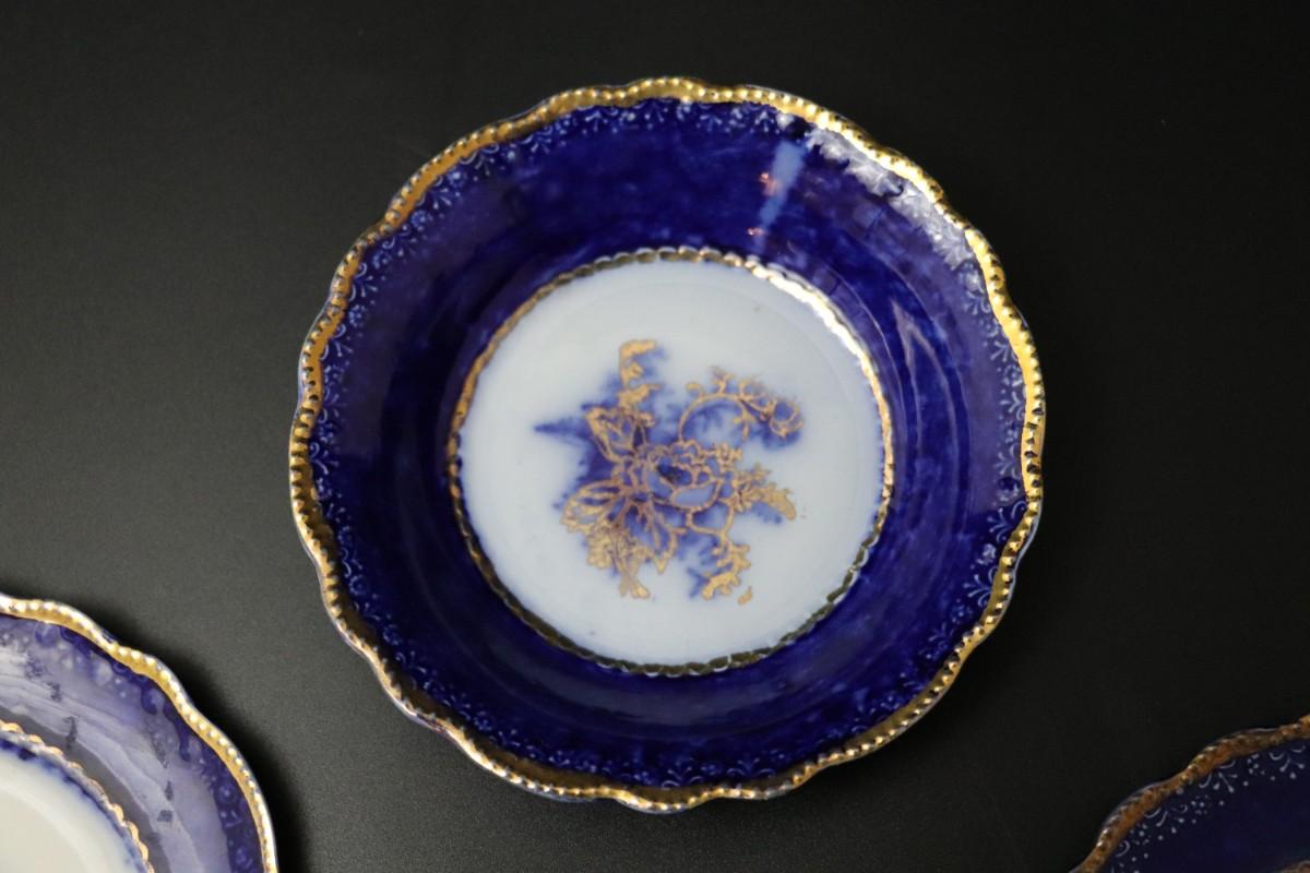 Lot of 3 (2 dessert plates and 1 bowl) of Blue Flow and Gold China. Stamp associated to Arthur J Wilkinson for Royal Staffordshire Pottery Burslem England circa 1907. Good condition; no visible cracks or chips. Please review images carefully and reach out with any questions.