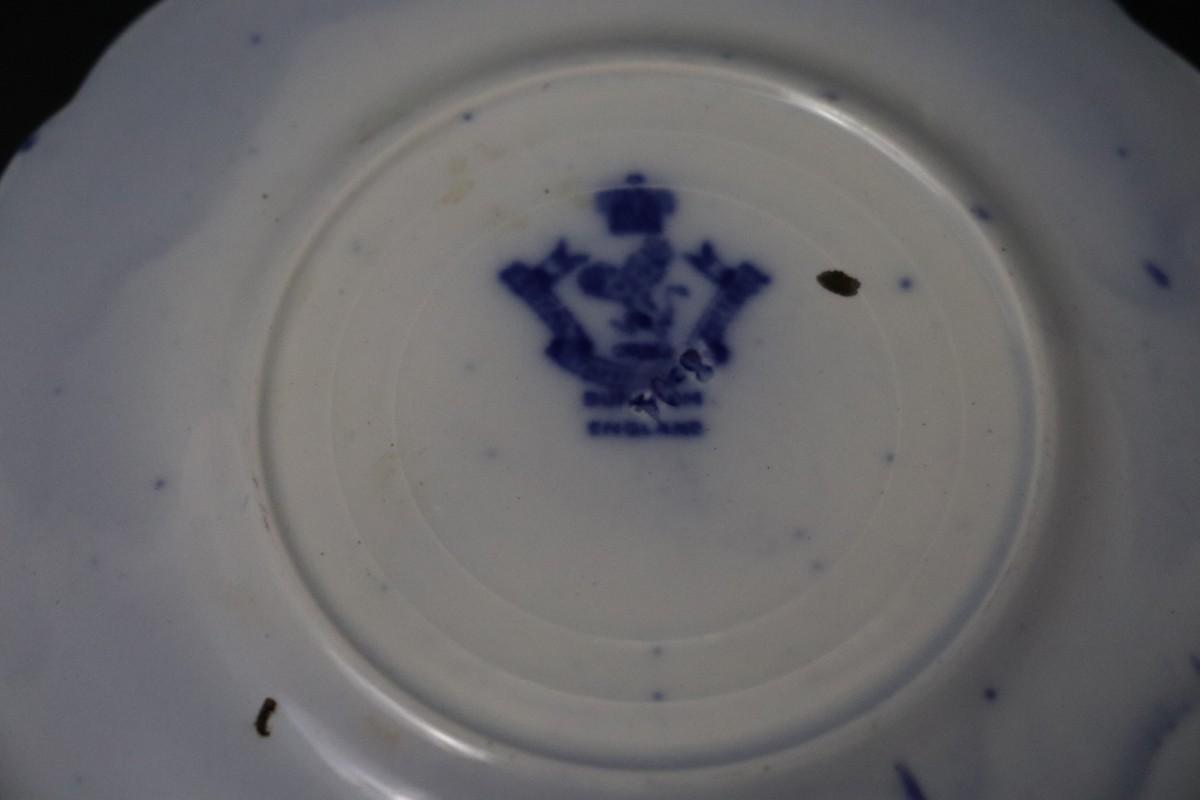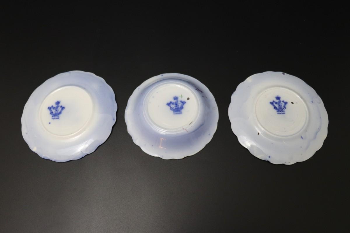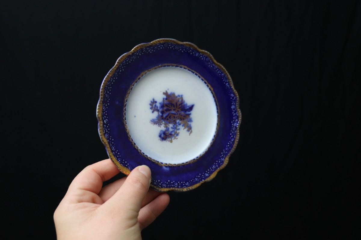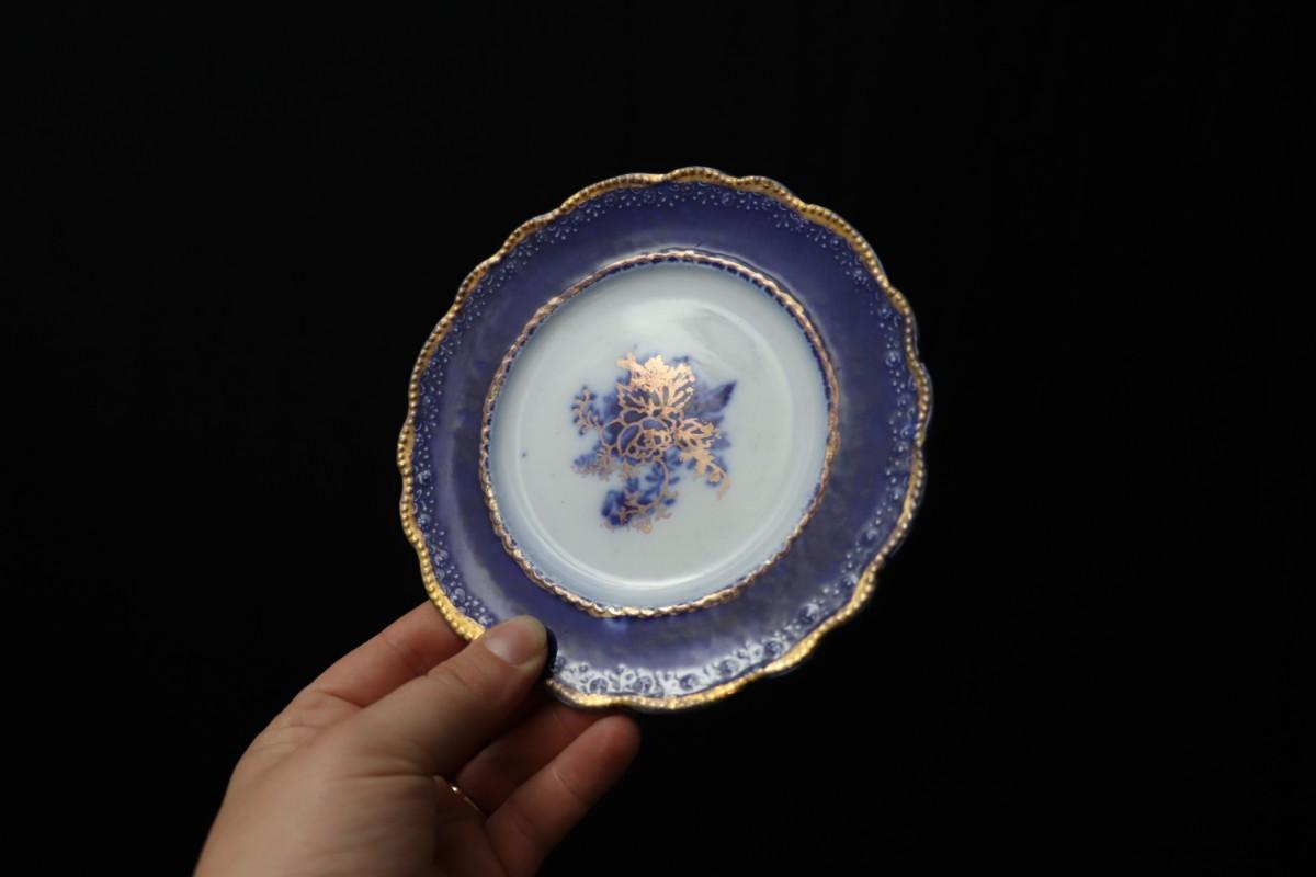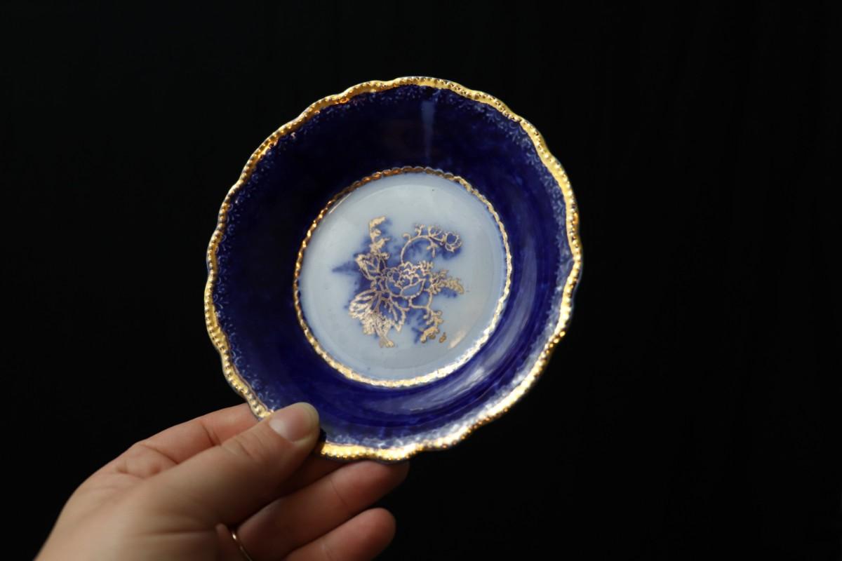 Lot of 3 (2 dessert plates and 1 bowl) of Blue Flow and Gold China. Stamp associated to Arthur J Wilkinson for Royal Staffordshire Pottery Burslem England circa 1907. Good condition; no visible cracks or chips. Please review images carefully and reach out with any questions.