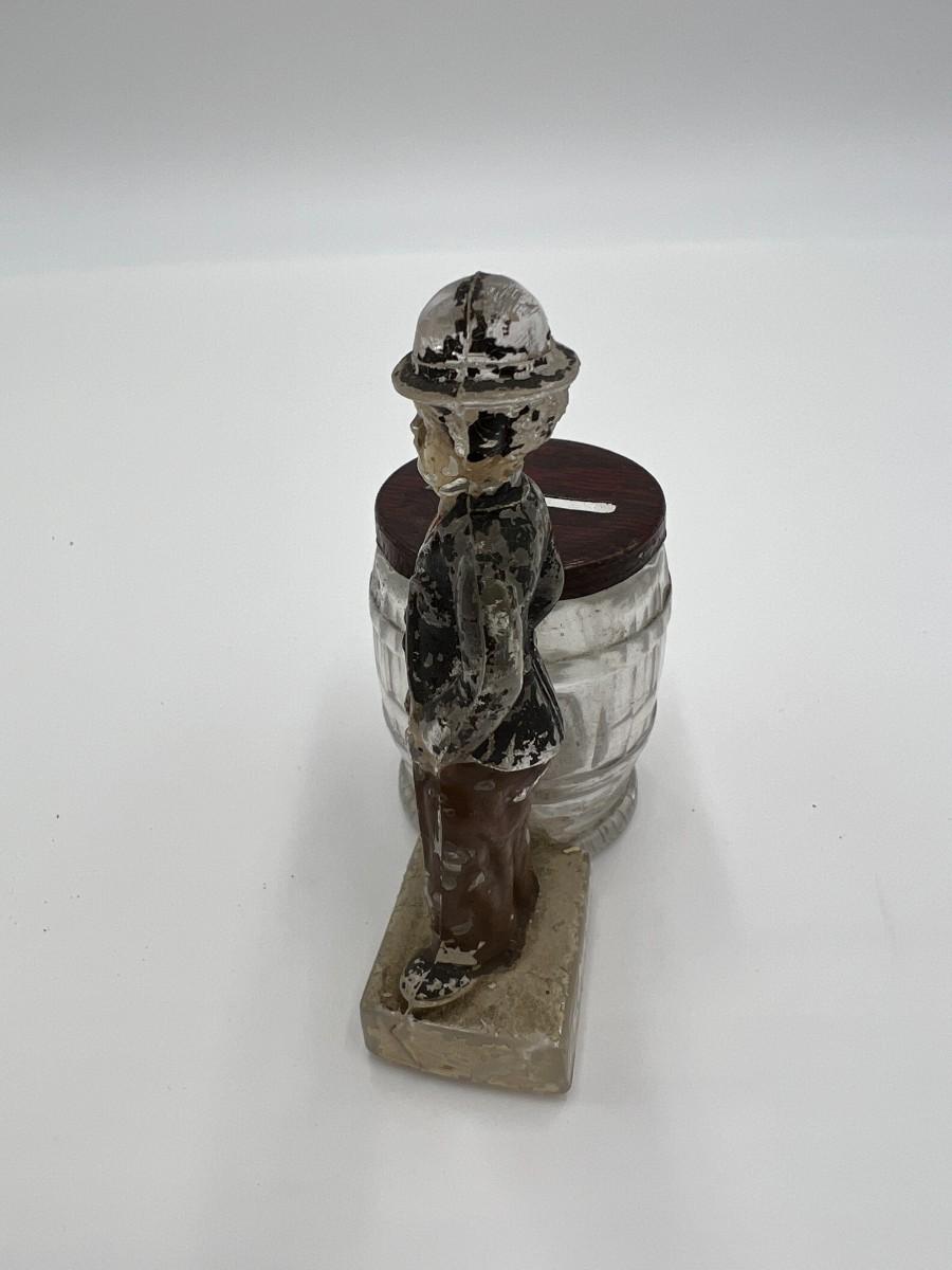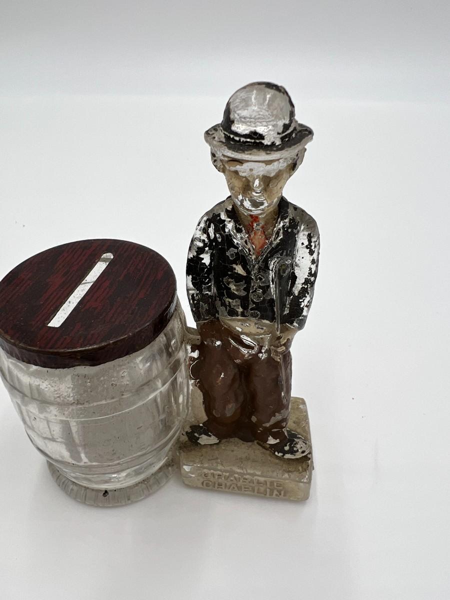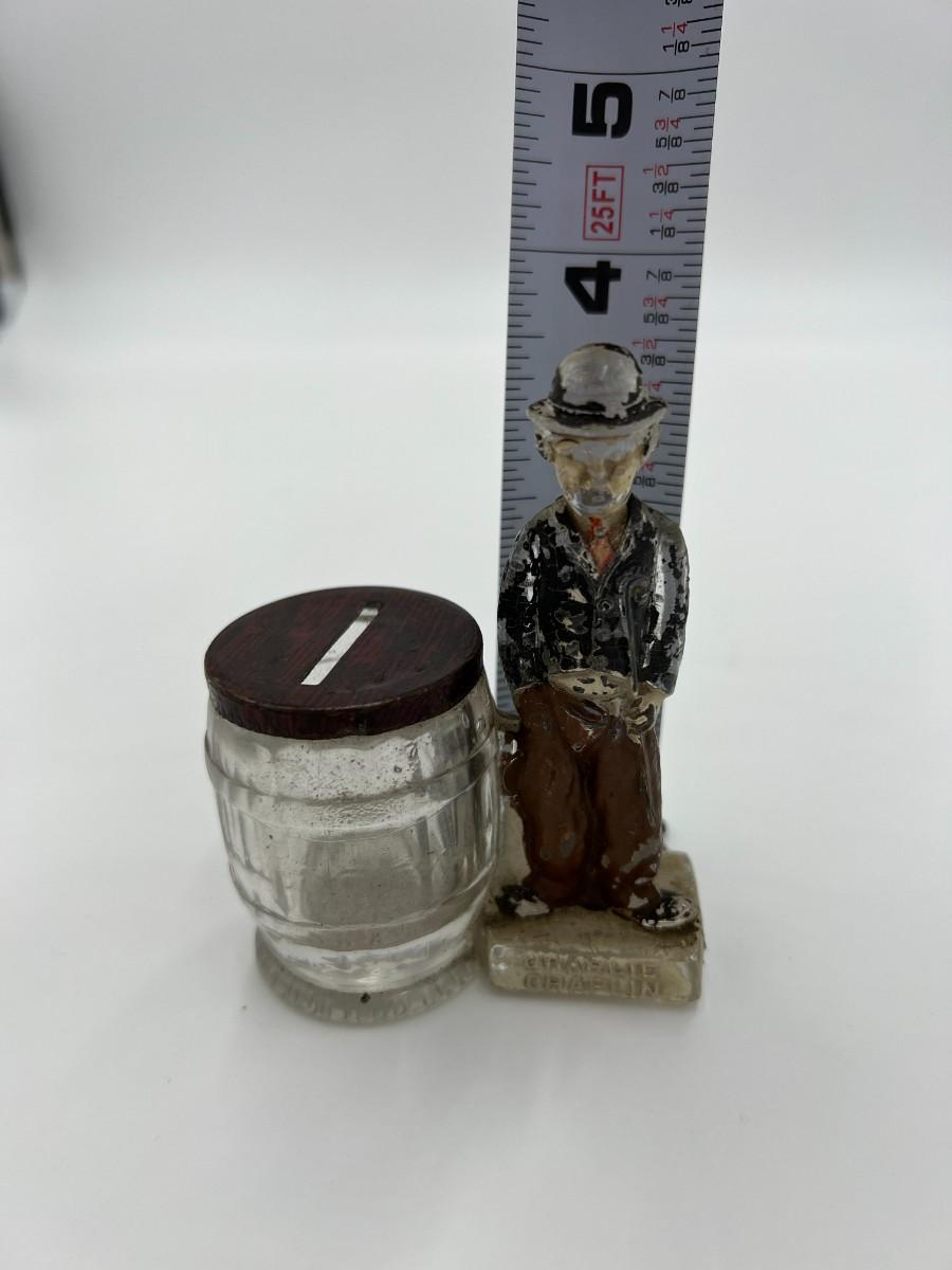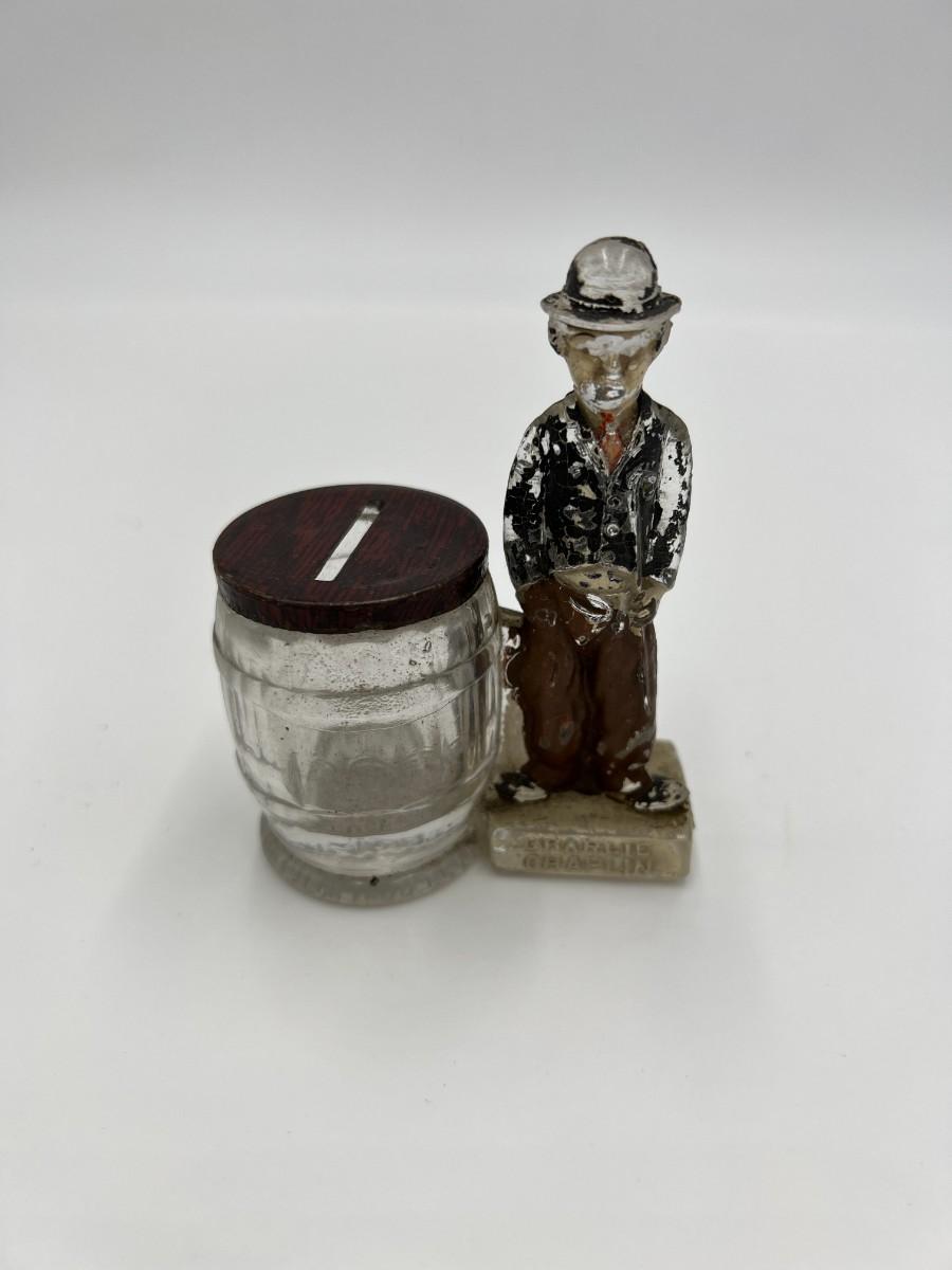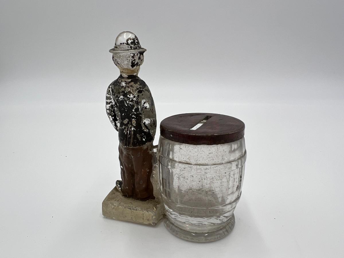 Circa 1910 Antique Charlie Chaplin and Barrel Glass Coin Bank. Condition as shown.