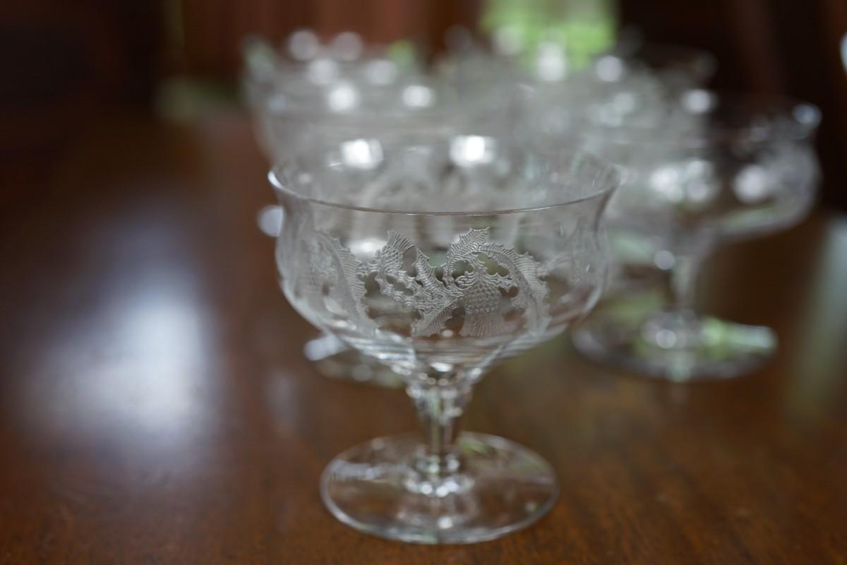 very good condition. low style sherbets of deep engravings. Thistle pattern