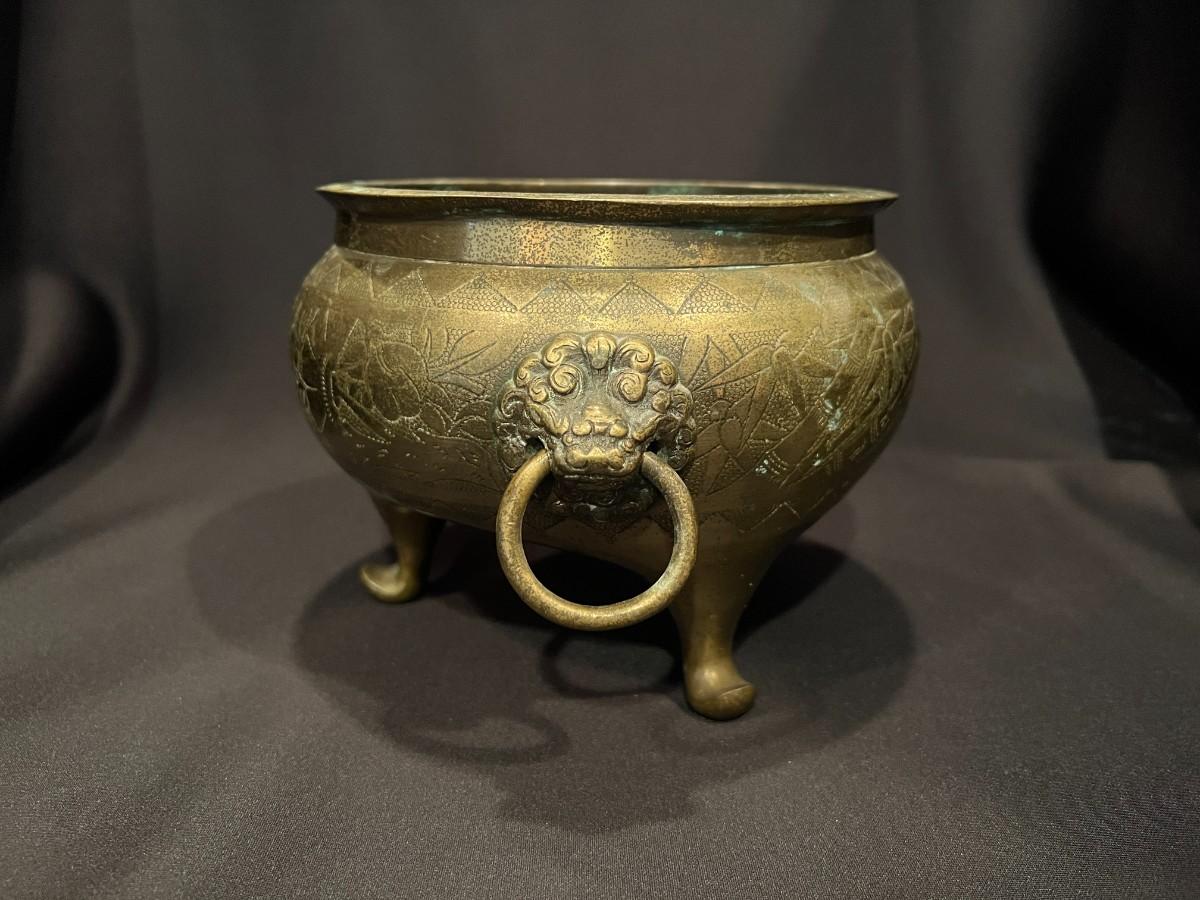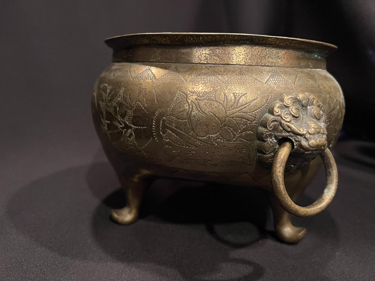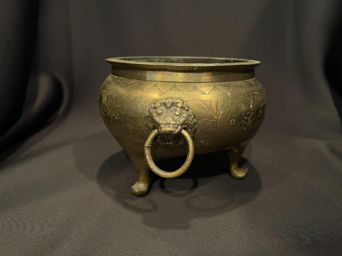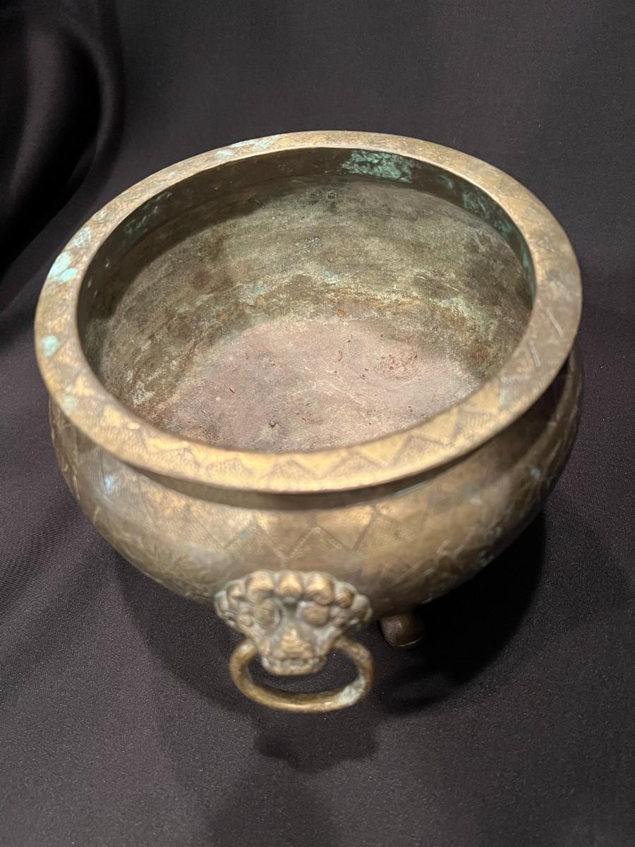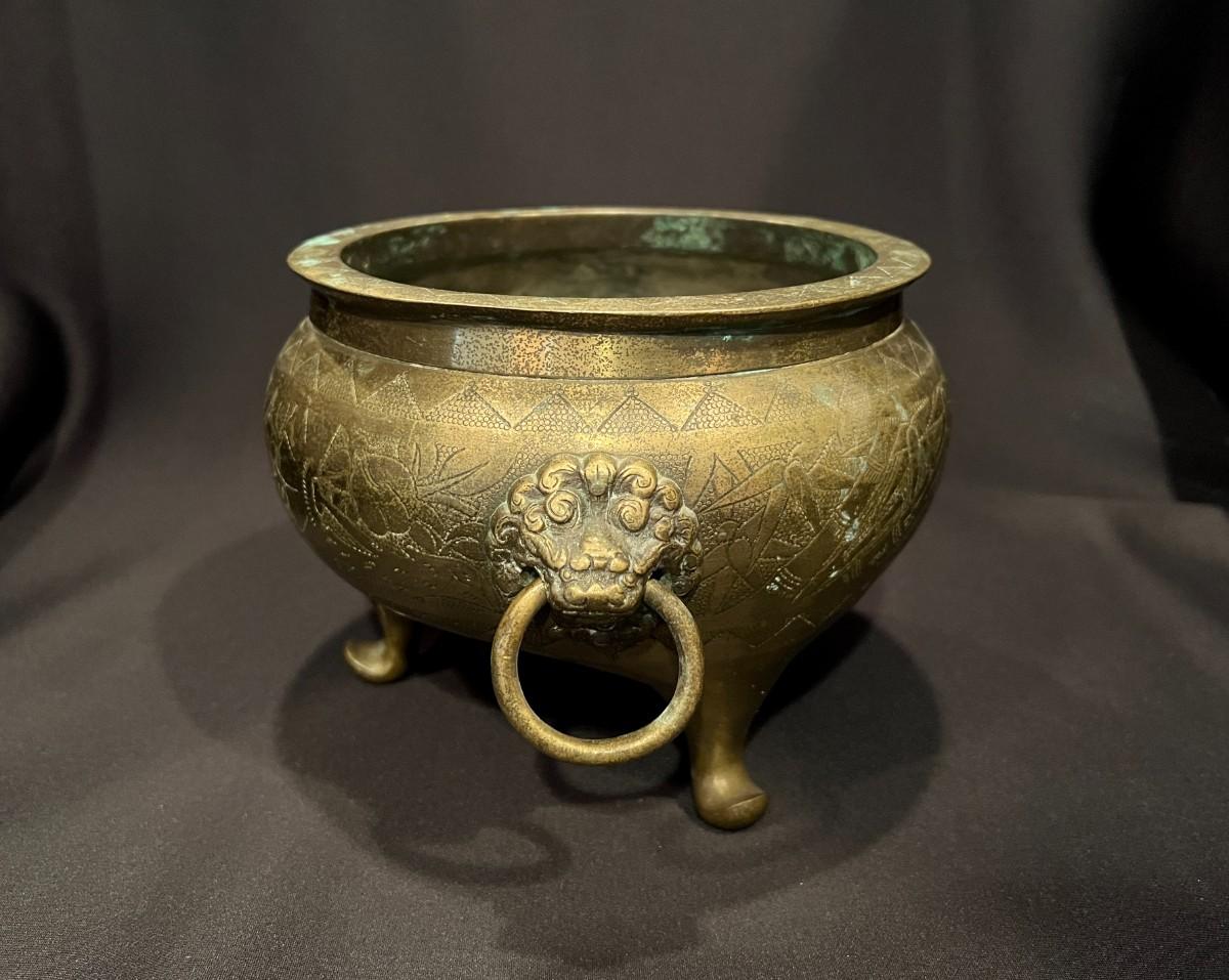 Antique brass Chinese planter (stamp indicates Ming dynasty), featuring engraved designs and two lions heads holding the handles. Condition as shown.