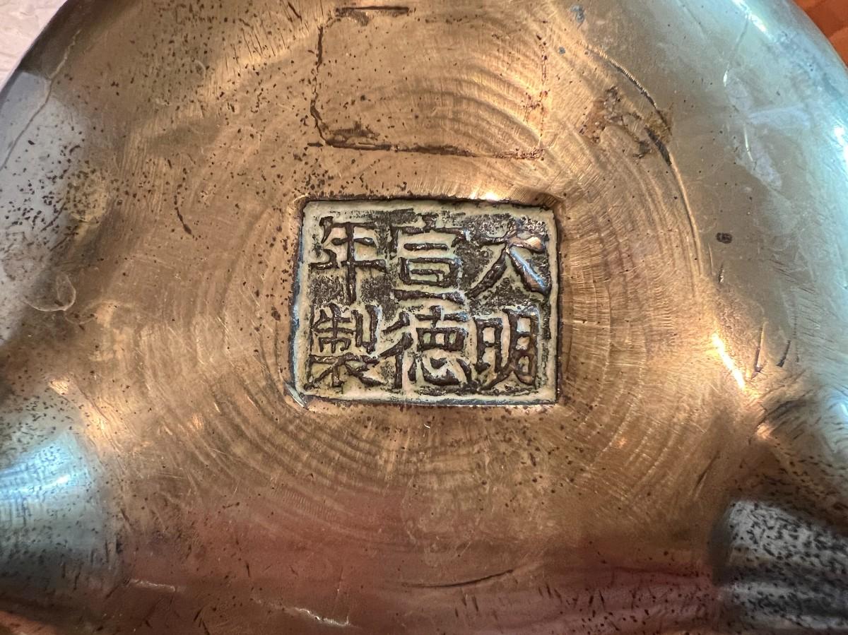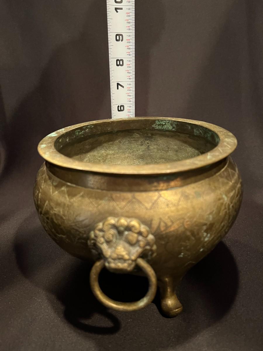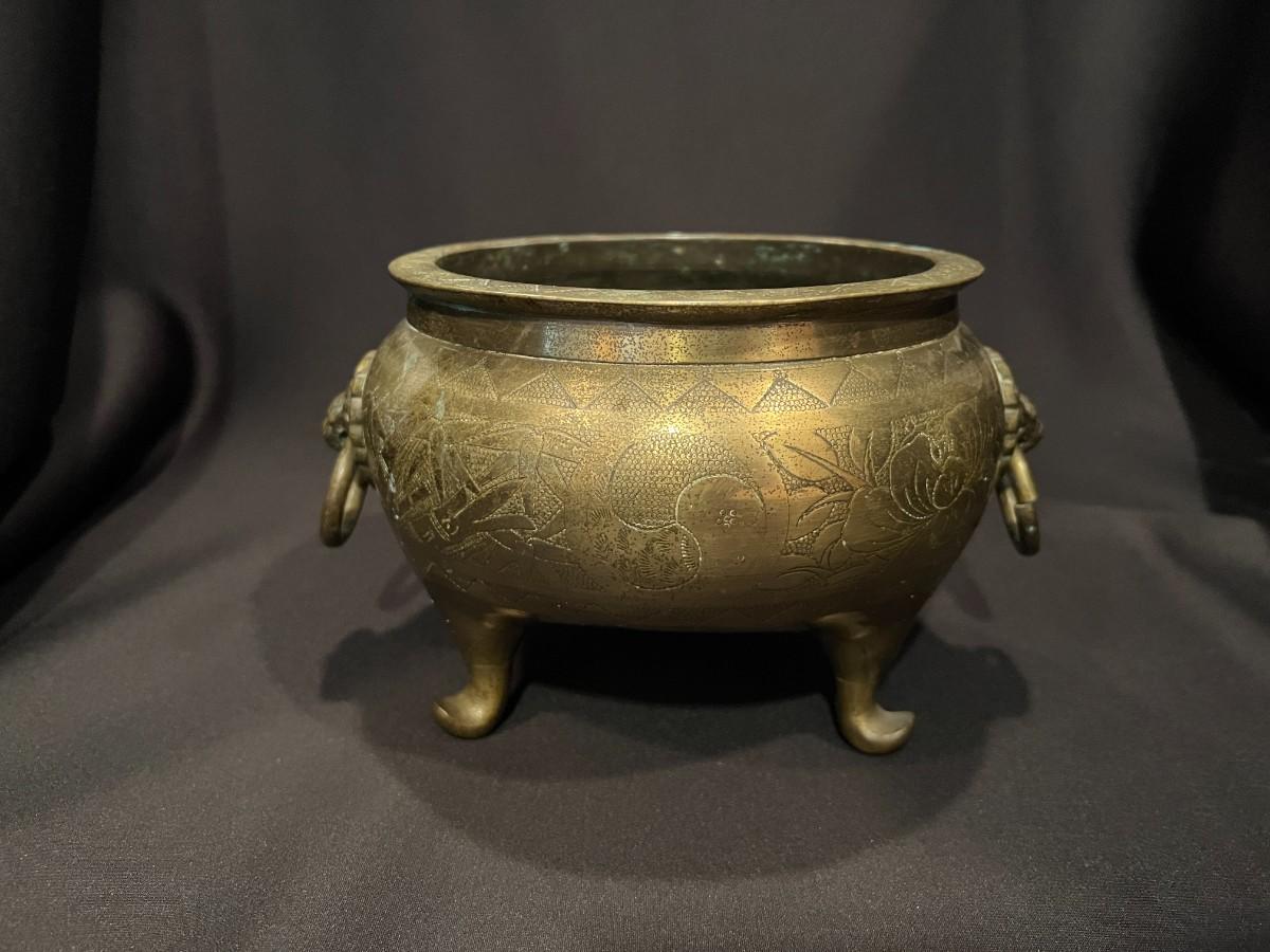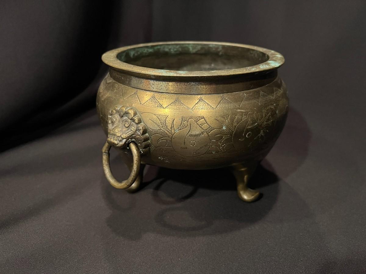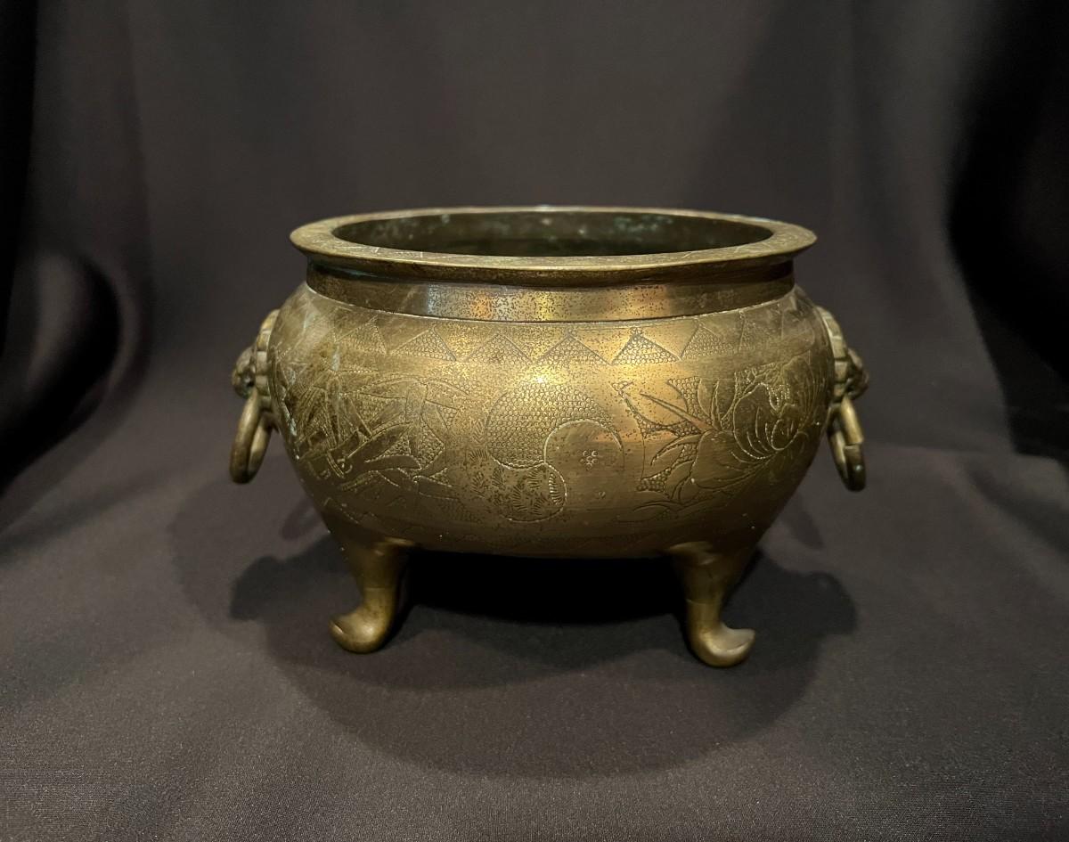 Antique brass Chinese planter (stamp indicates Ming dynasty), featuring engraved designs and two lions heads holding the handles. Condition as shown.