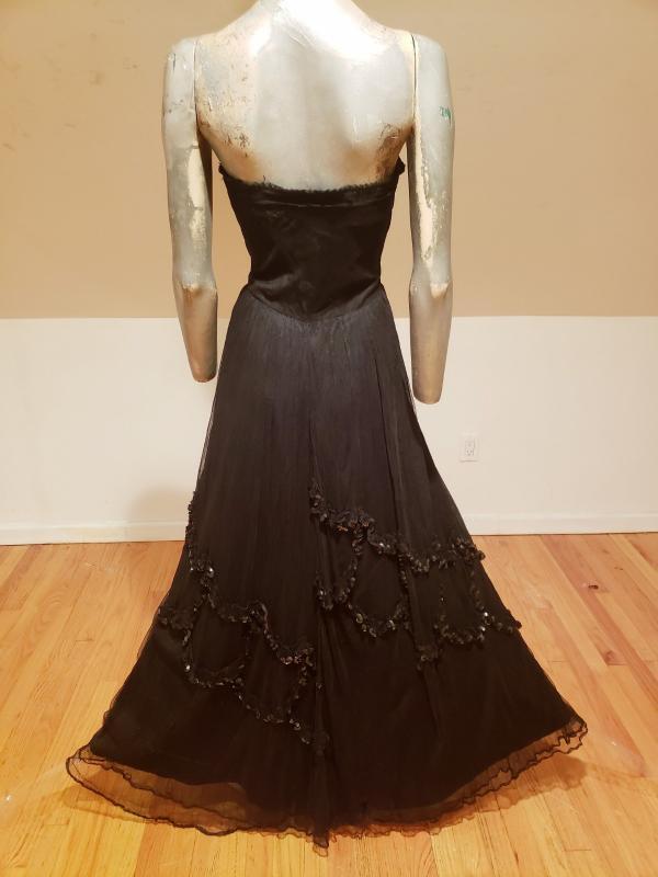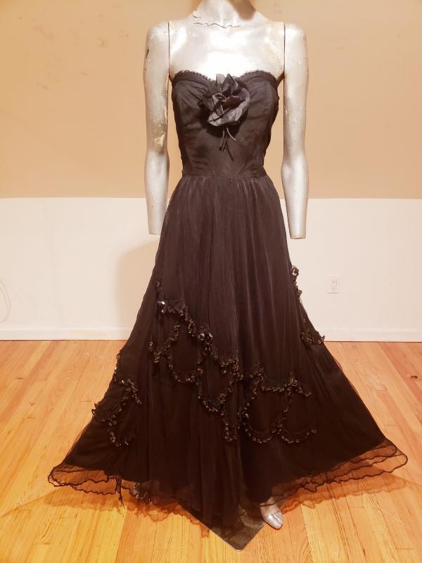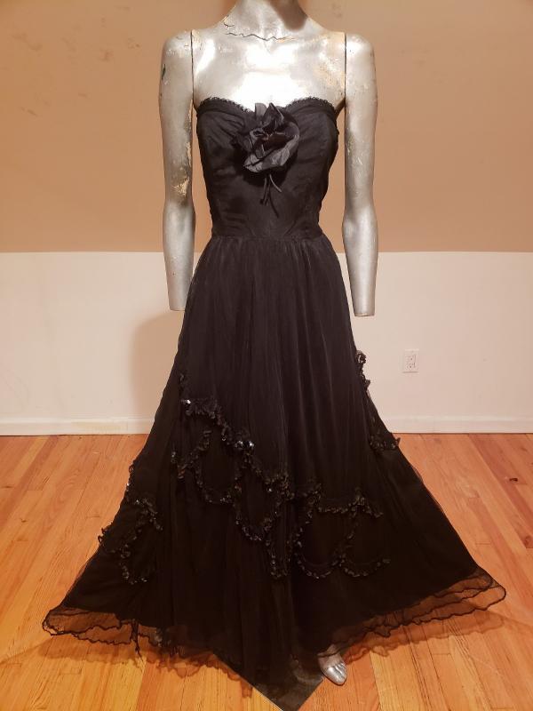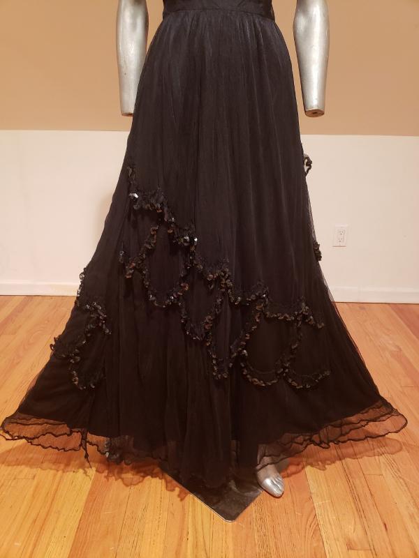 Amazing gown from the roaring 20's-30"s. Layers of tulles with lac embroidery of sequins throughout front and back. Under layer of satin and bones at bustier strapless bodice which is adorned with a black maggie rose.. side metal zipper. A stunning wearable art.