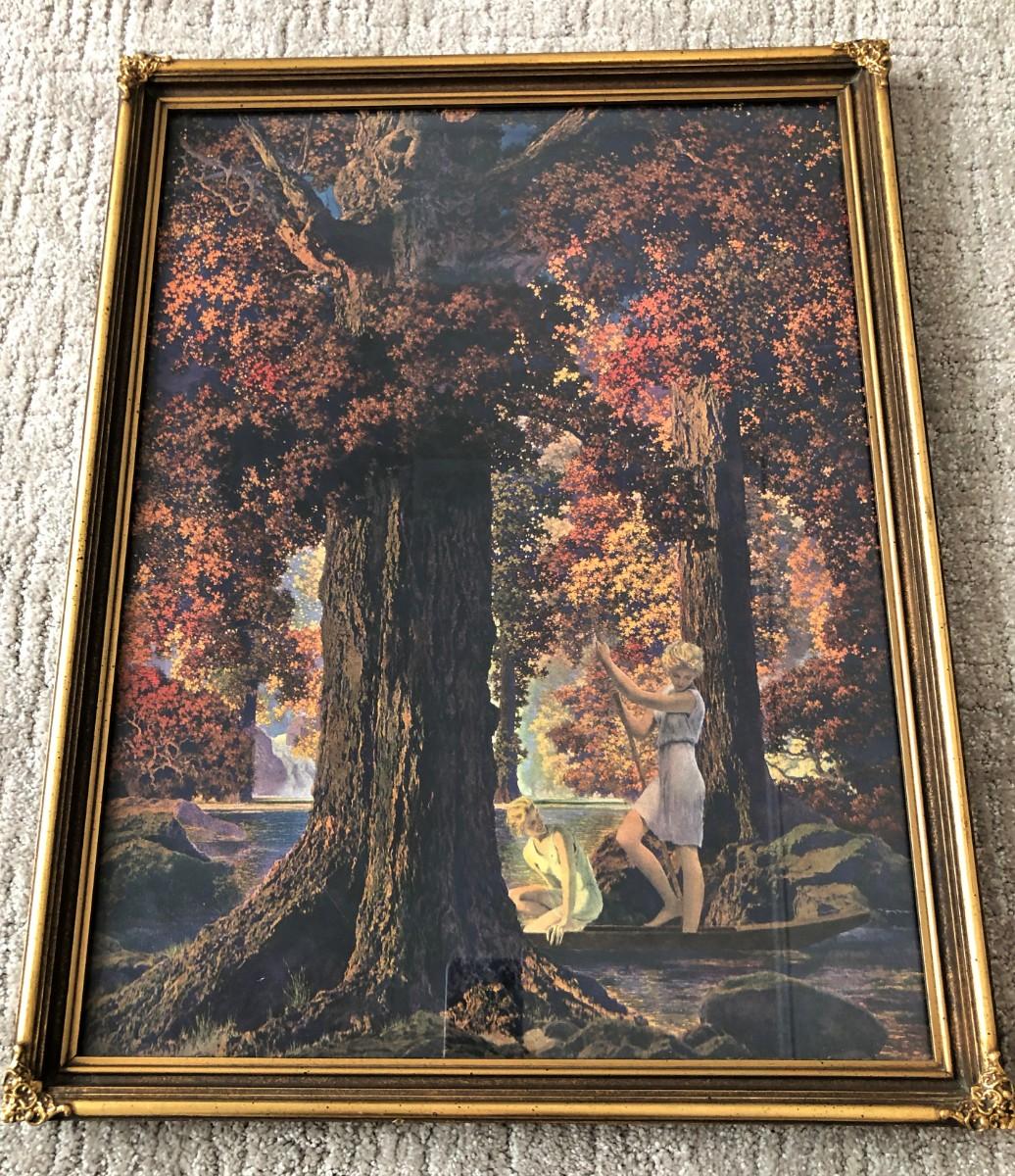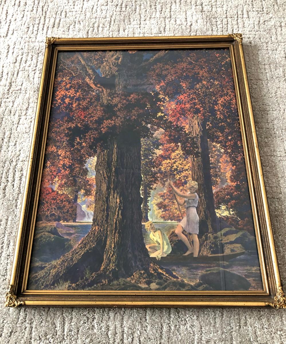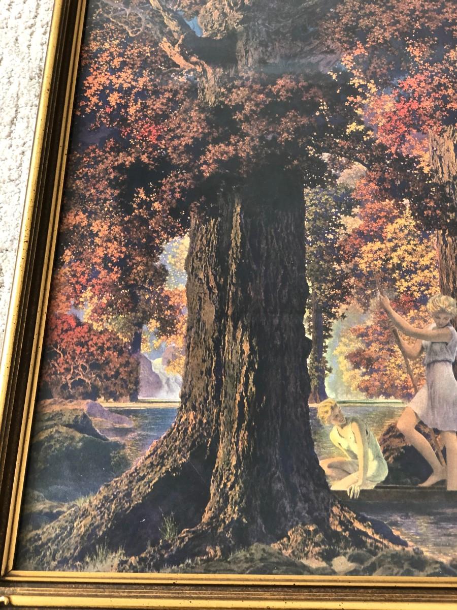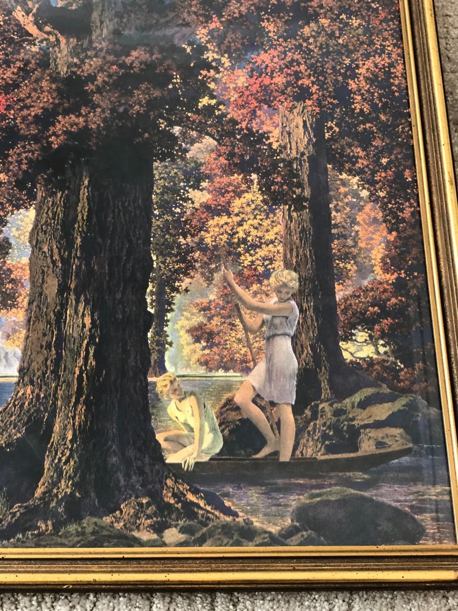 Framed lithograph of "Golden Hours", antique circa 1927, by Maxfield Parrish. In very good condition, with some light rippling (shown in photos).