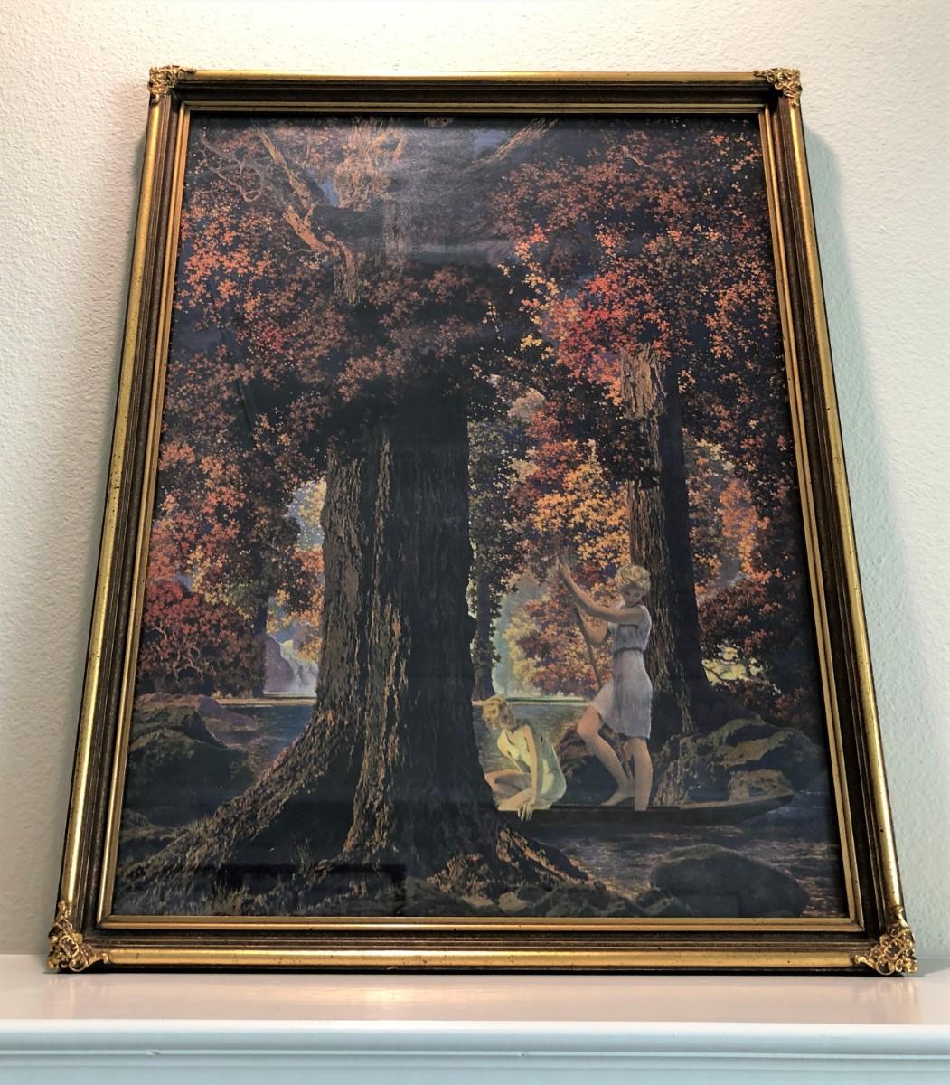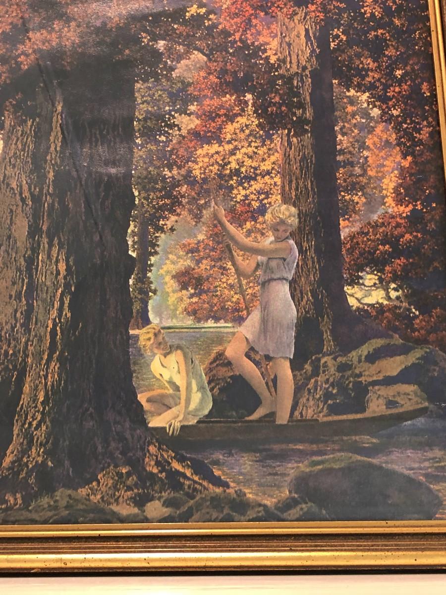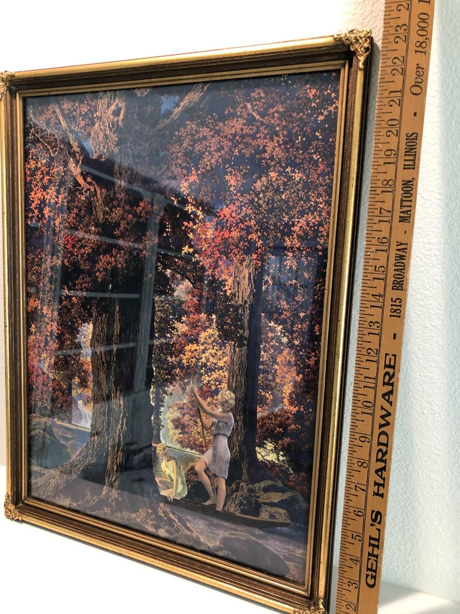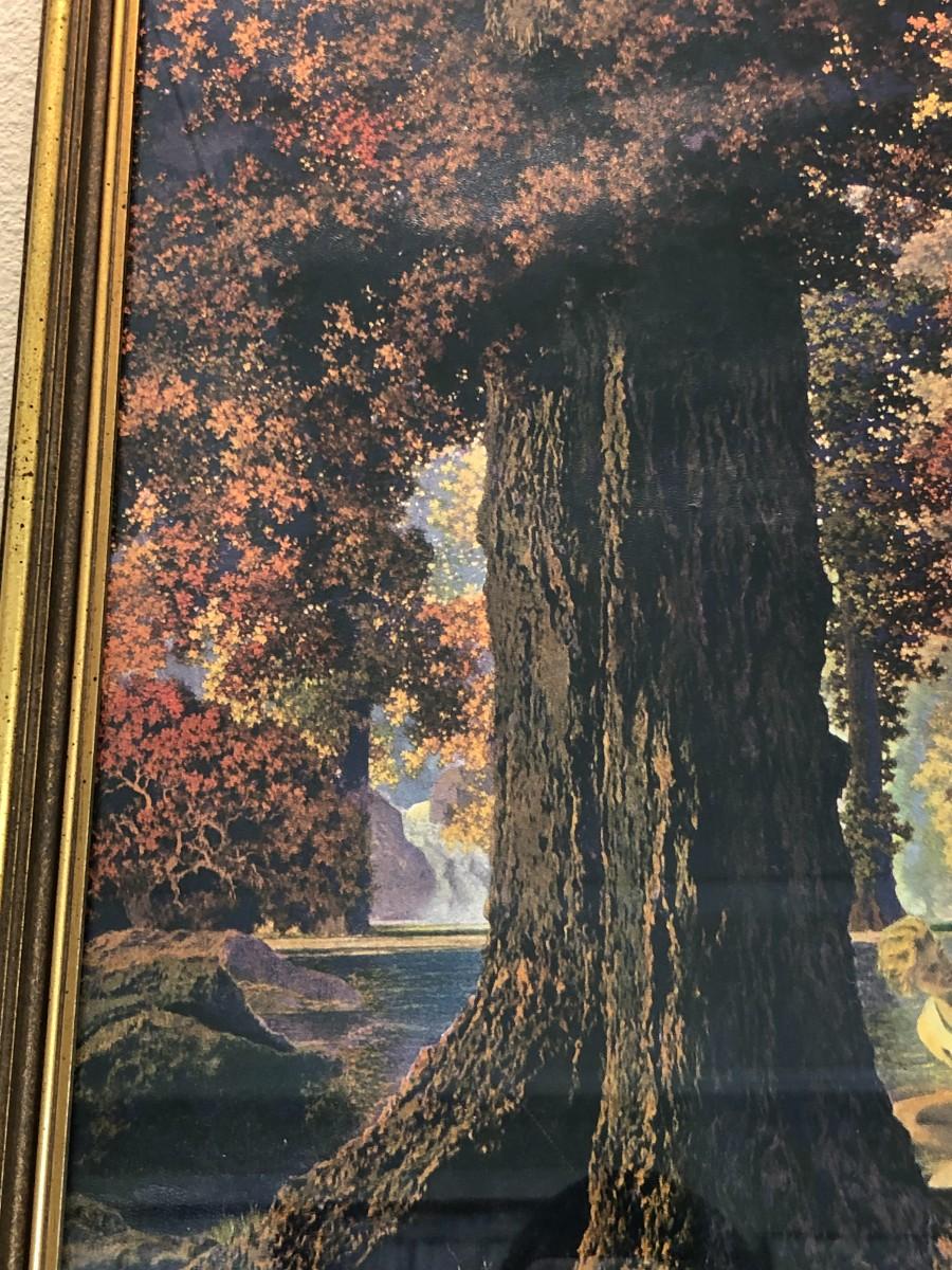 Framed lithograph of "Golden Hours", antique circa 1927, by Maxfield Parrish. In very good condition, with some light rippling (shown in photos).