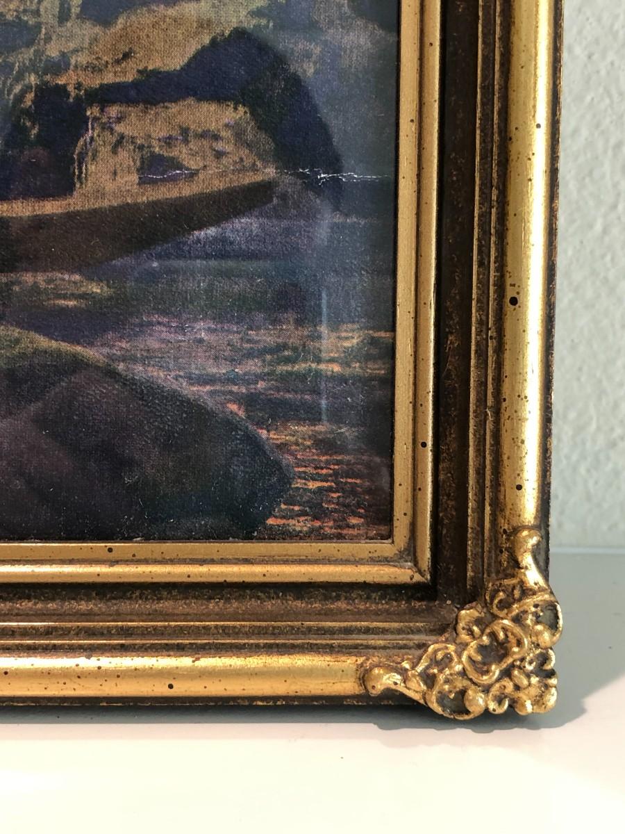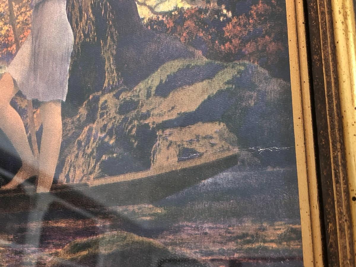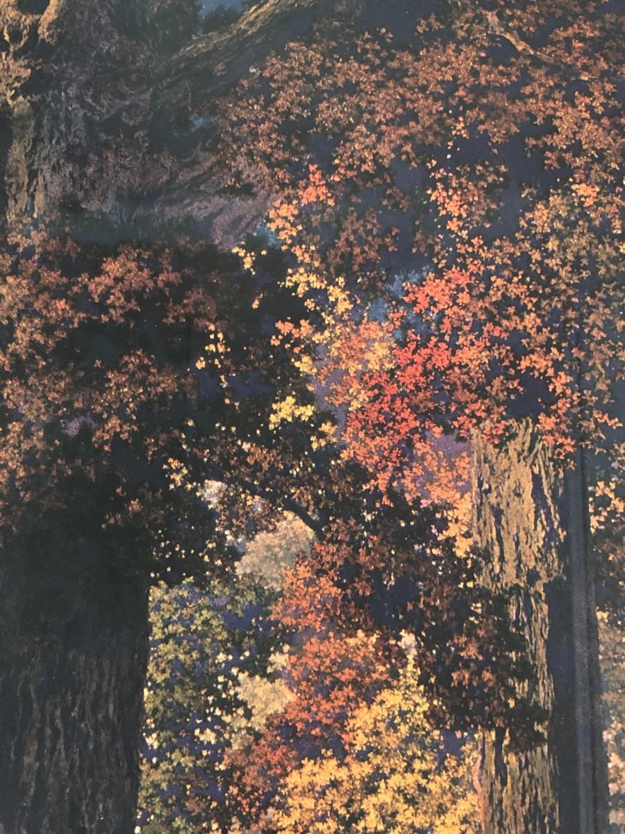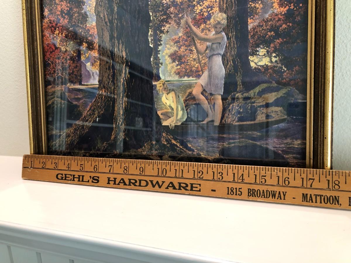Framed lithograph of "Golden Hours", antique circa 1927, by Maxfield Parrish. In very good condition, with some light rippling (shown in photos).