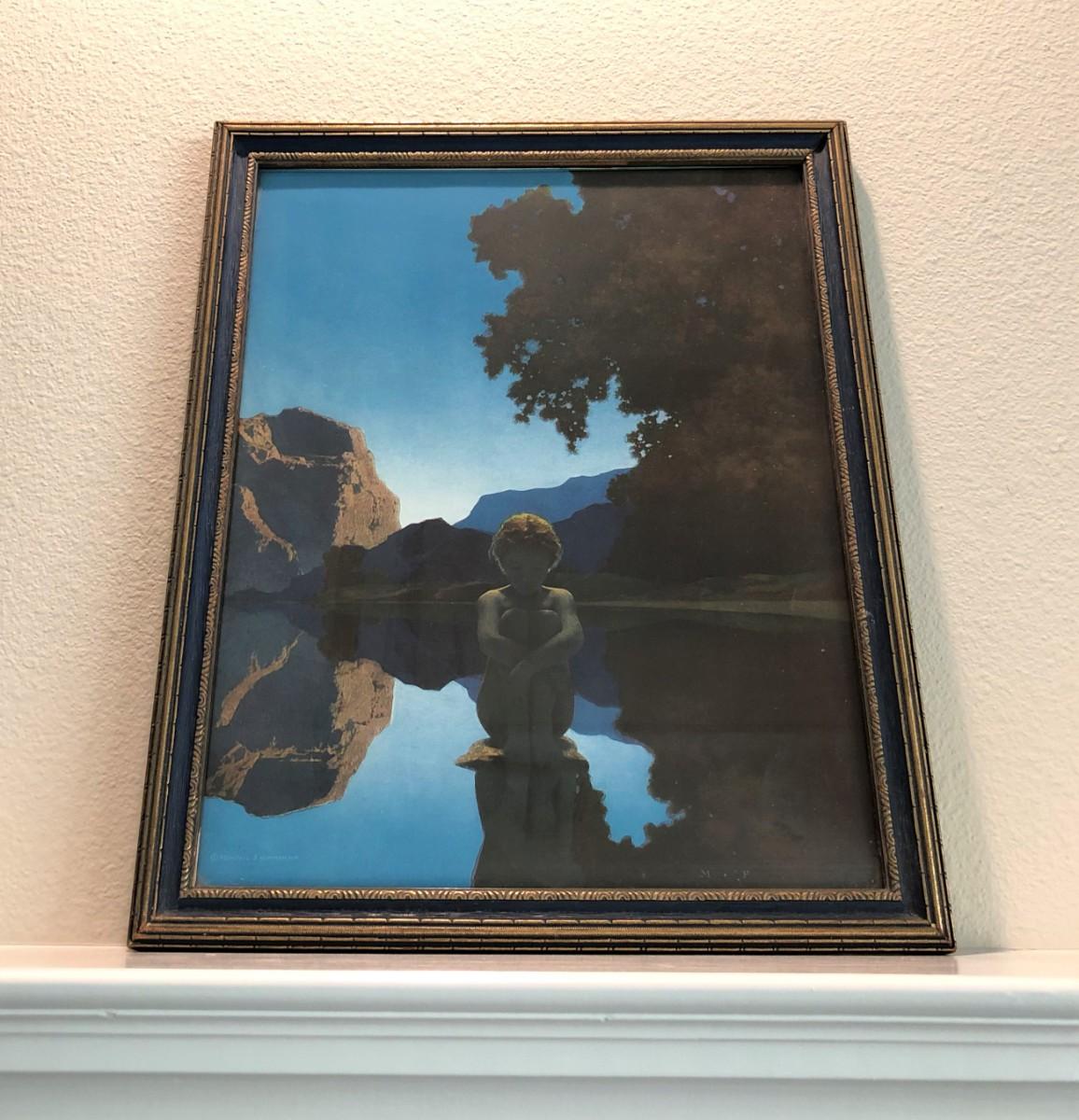 Circa 1927 Original Framed Antique Print of Evening by Maxfield Parrish. Beautiful antique art deco nouveau style frame. Copyright Reinthal & Newman, NY. M.P. In very good condition. We removed from frame to take additional photos of the print.