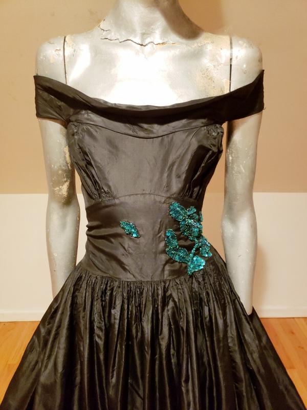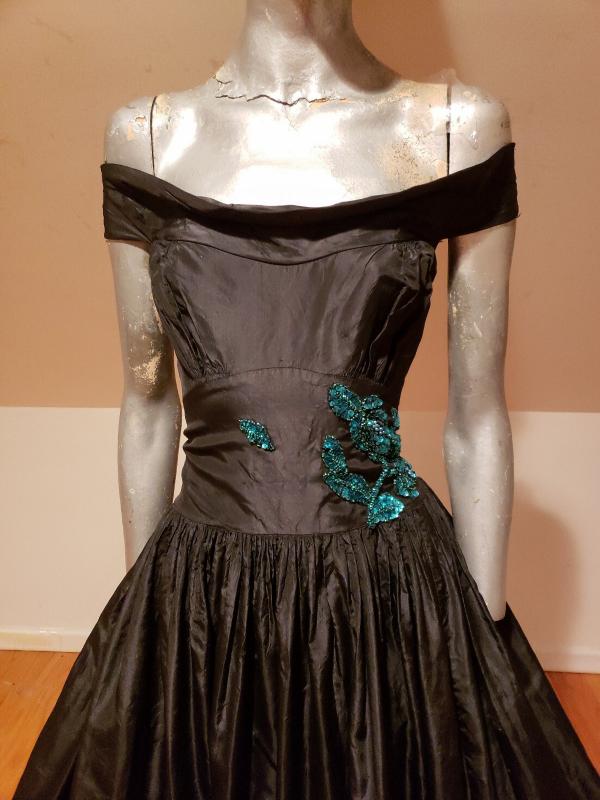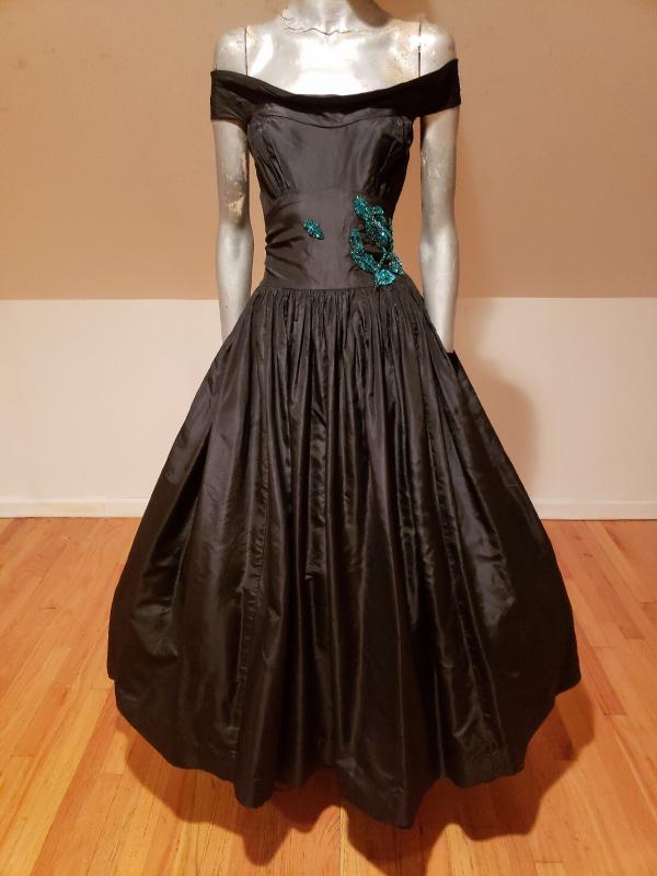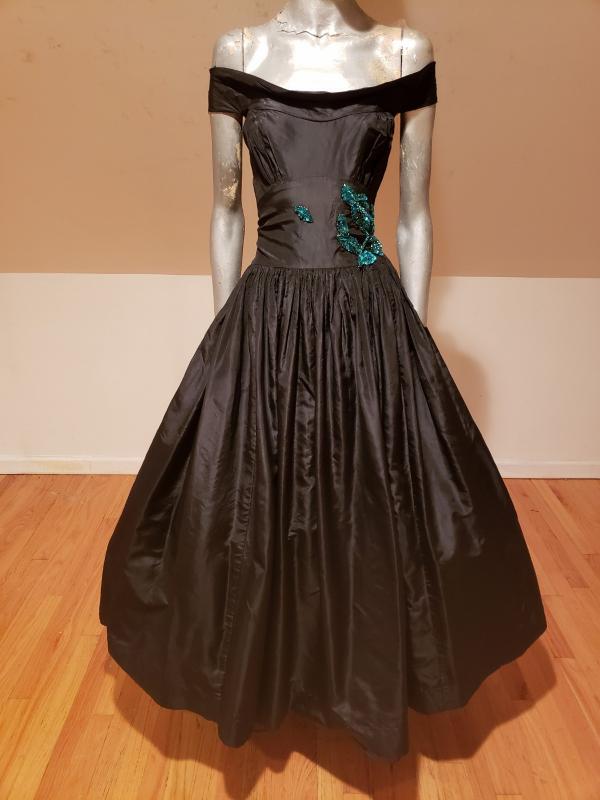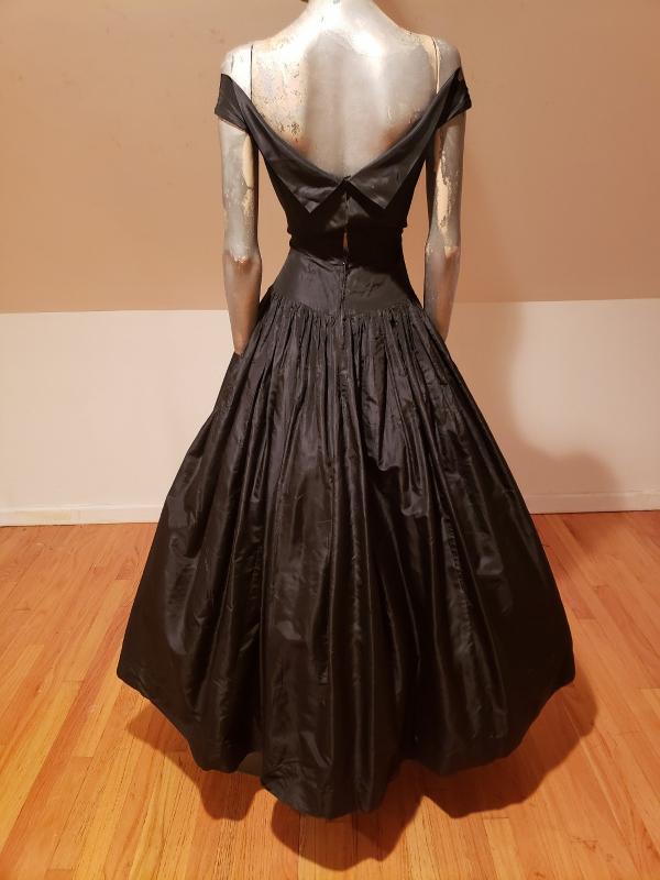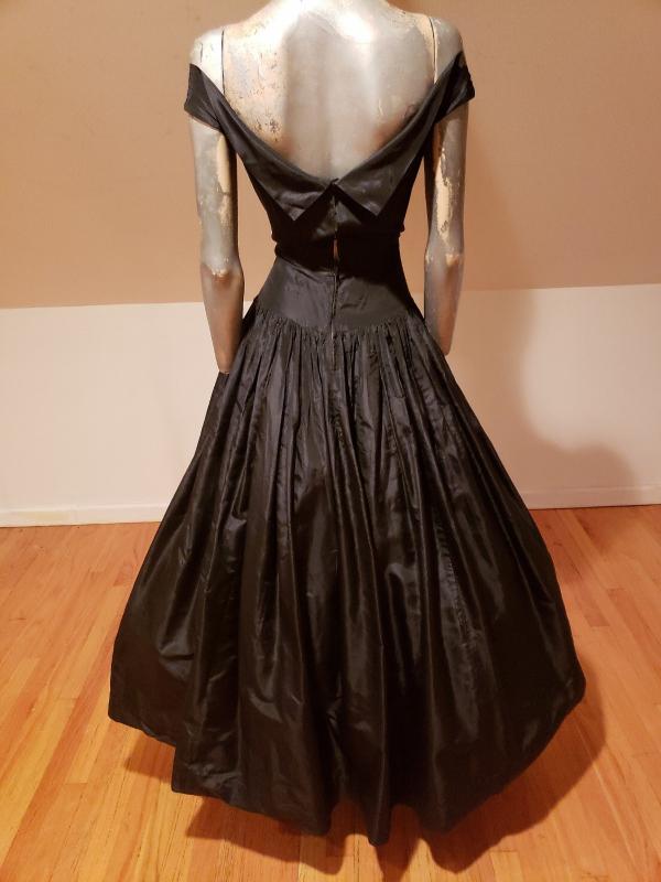 This is an amazing and very rare silk taffeta gown that is worn a bit off shoulder. It is an Original Design that was Registered by a Member of the fashion Originators Guild. It has the number on it. In amazing condition it is a stunner of design and details.