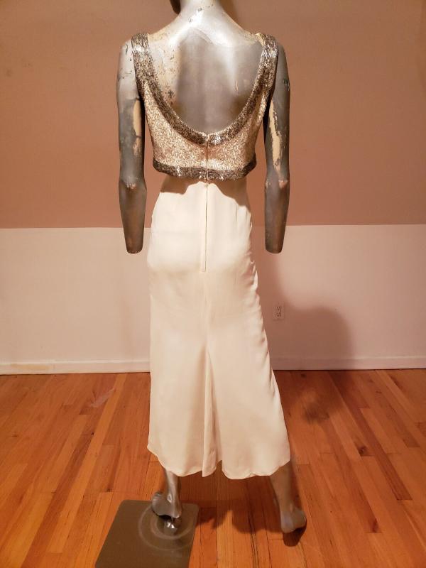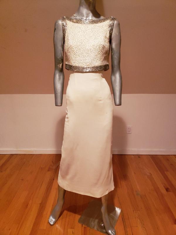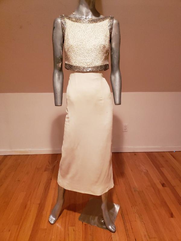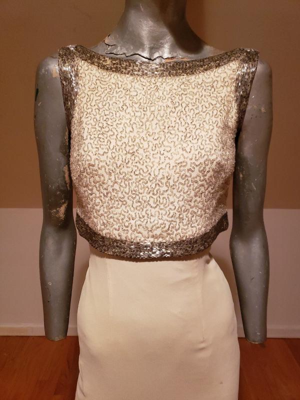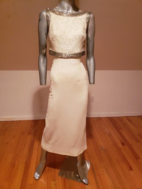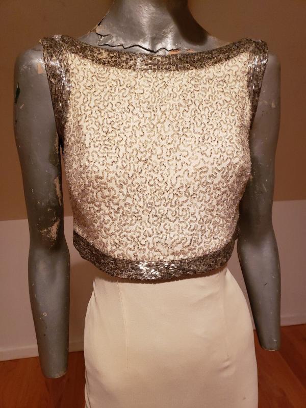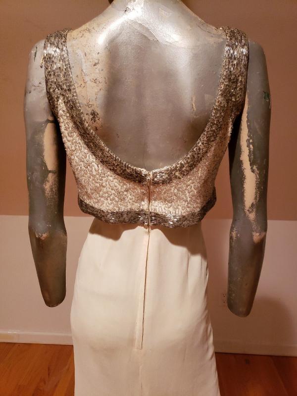 What an amazing Hostess maxi dress/gown this one is ,Circa late 1940's all lined with sher organza and couture finished the bodice is attached and fluids away from the curved dress. and its all elaborately hand beaded with silver bugle glass crystal beads every inch of the top.the beads hav formed a patina that is very attractive.