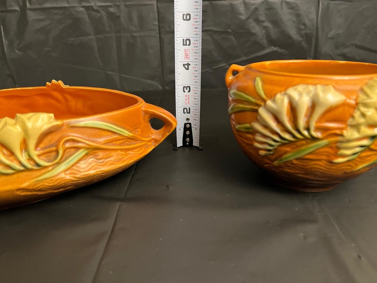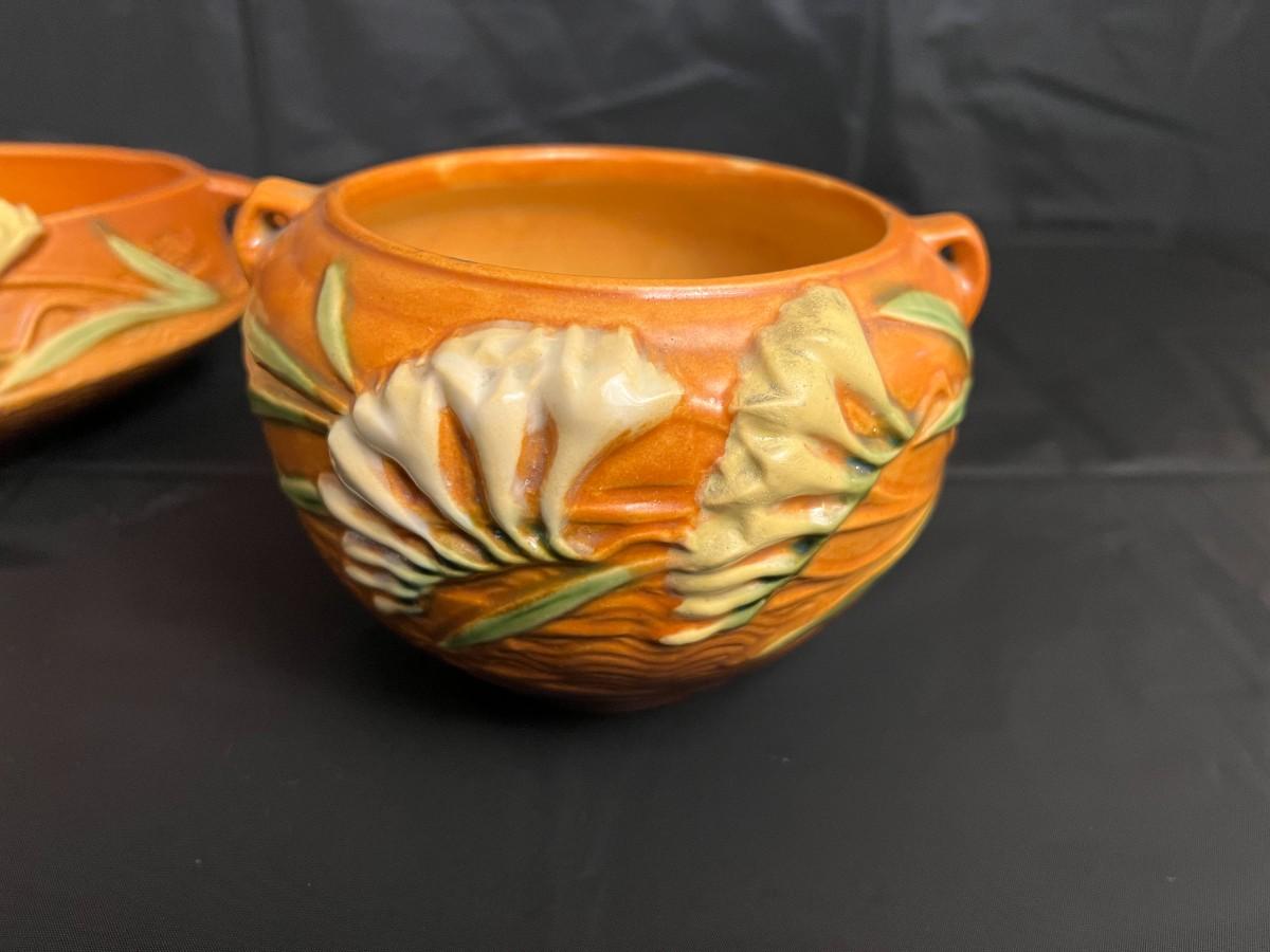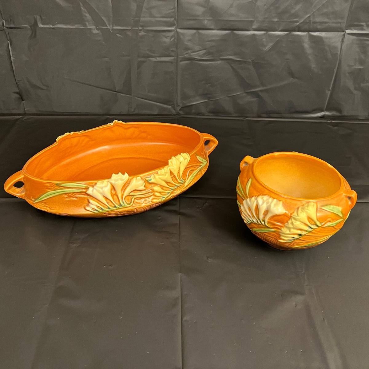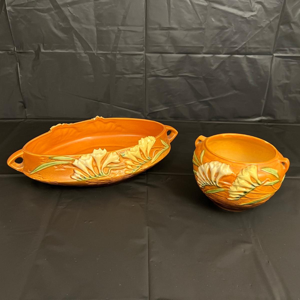Circa 1940s Lot of 2 Roseville U.S.A. Freesia 466-10 and 669-4 Serving Bowls with handles. In good condition, as shown in images.