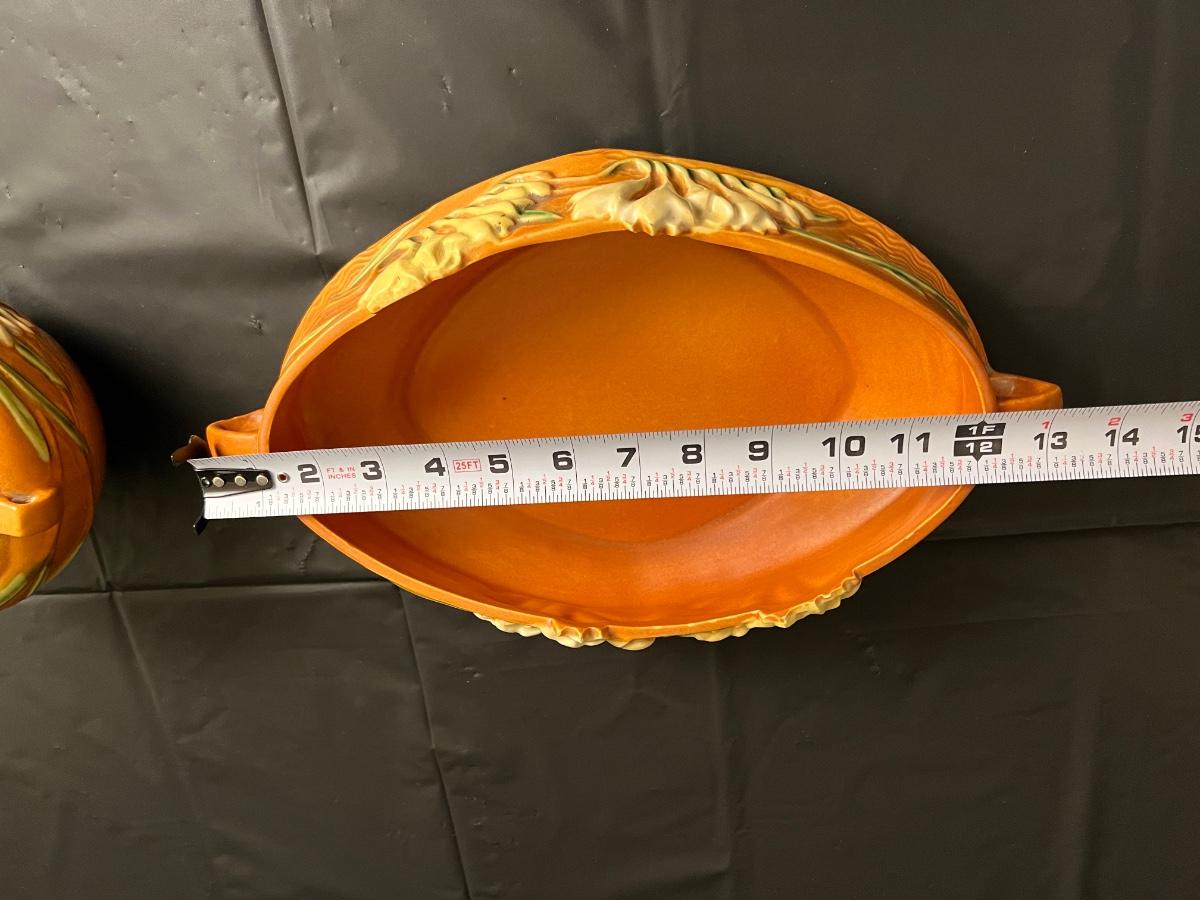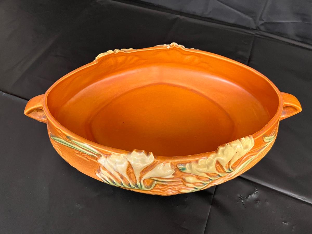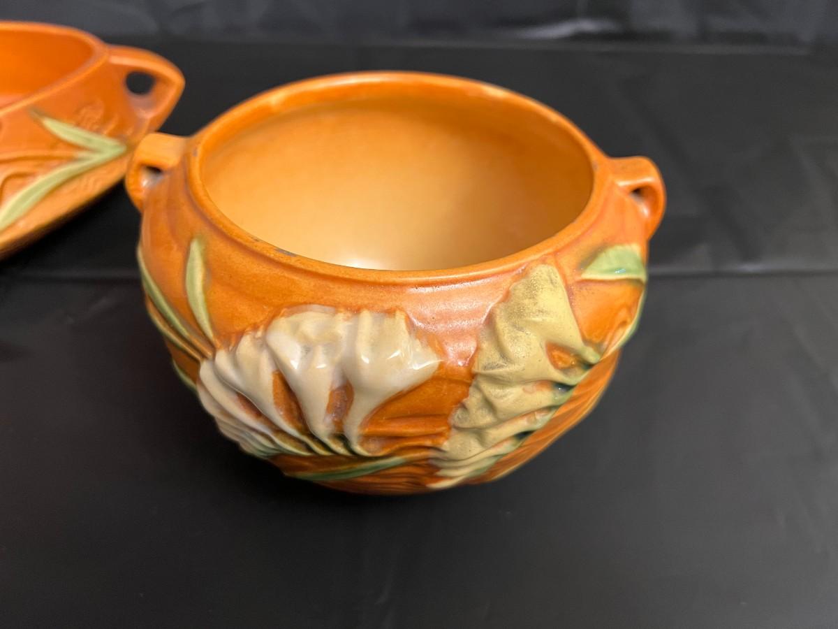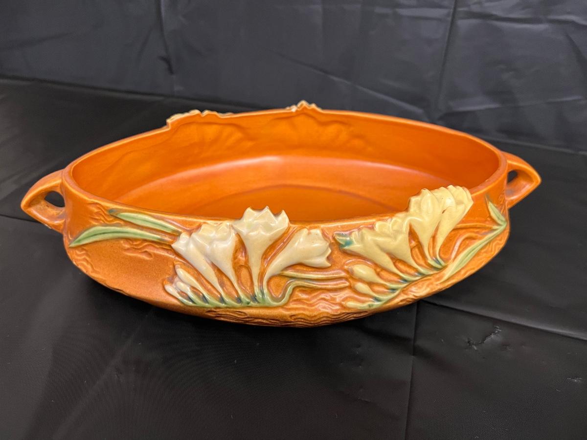 Circa 1940s Lot of 2 Roseville U.S.A. Freesia 466-10 and 669-4 Serving Bowls with handles. In good condition, as shown in images.
