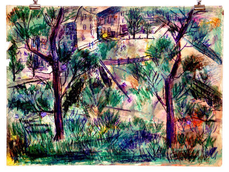 Original painting signed by artist Vincent Drennan. Medium: Pastel/Watercolor, Support: Paper, Artist: Vincent Drennan, Signature: Yes - twice, lower left, Approximate Work size: 24" x 18", Date of creation: 1940's, Country of Origin: American, Condition: good - as seen on pictures