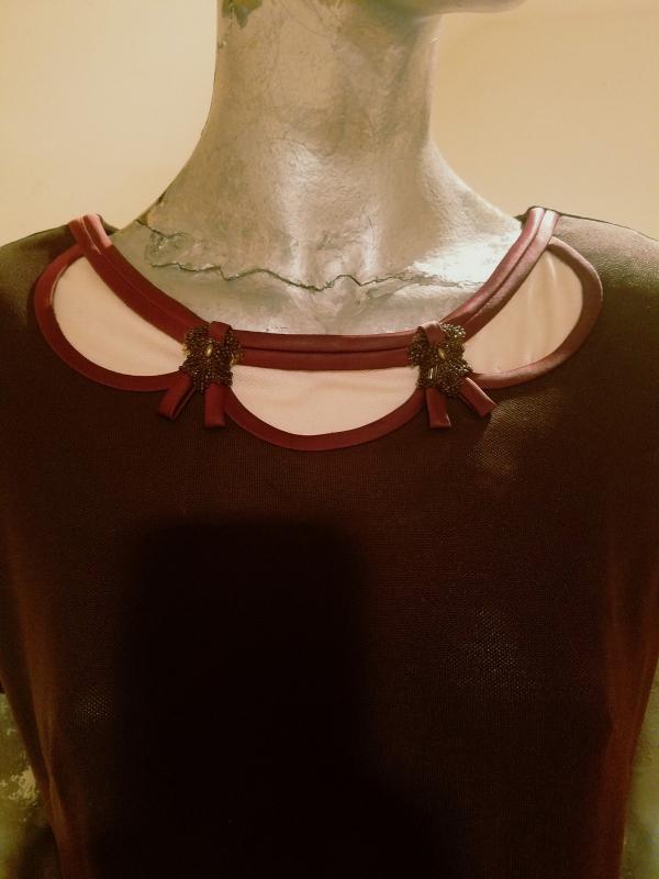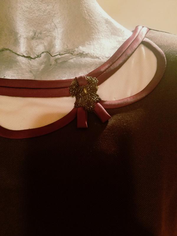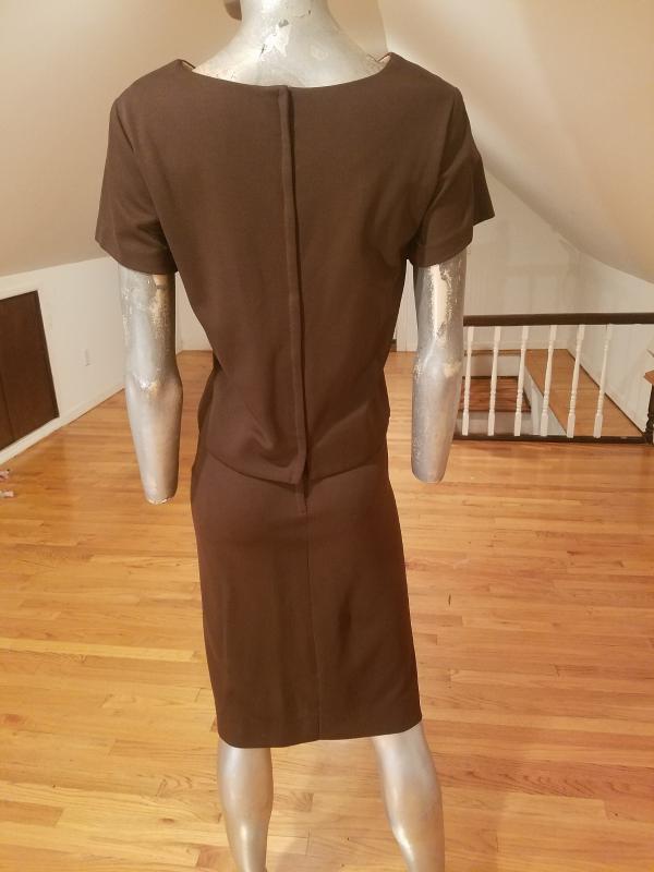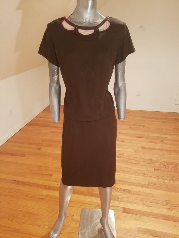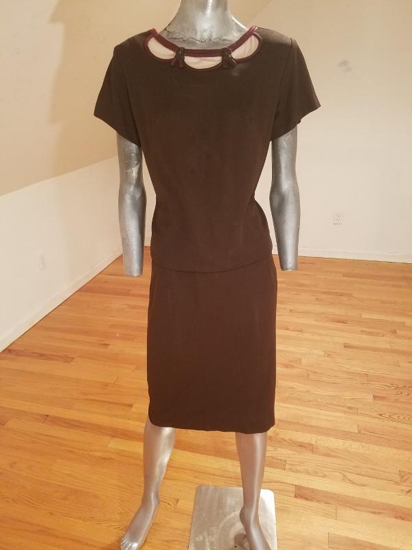 Beautiful 2 pc skirt ensemble from the 1940's .Great bodice satin piping details and beads in a scoop design. The top has a metal zipper and so does the skirt . The fabric is an acetate jersey in cocoa brown. In very good vintage condition.
