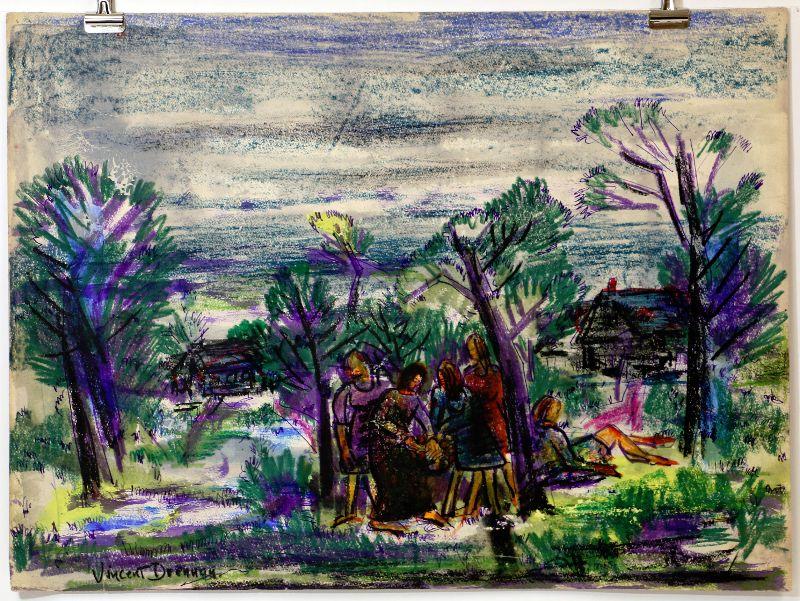 Original painting signed by artist Vincent Drennan. Medium: Pastel/Watercolor, Support: Paper, Artist: Vincent Drennan, Signature: Yes - 3 times, lower left plus twice on the back of the painting, Approximate Work size: 24" x 18", Date of creation: 1942, Country of Origin: American, Condition: good/very good - as seen on pictures.