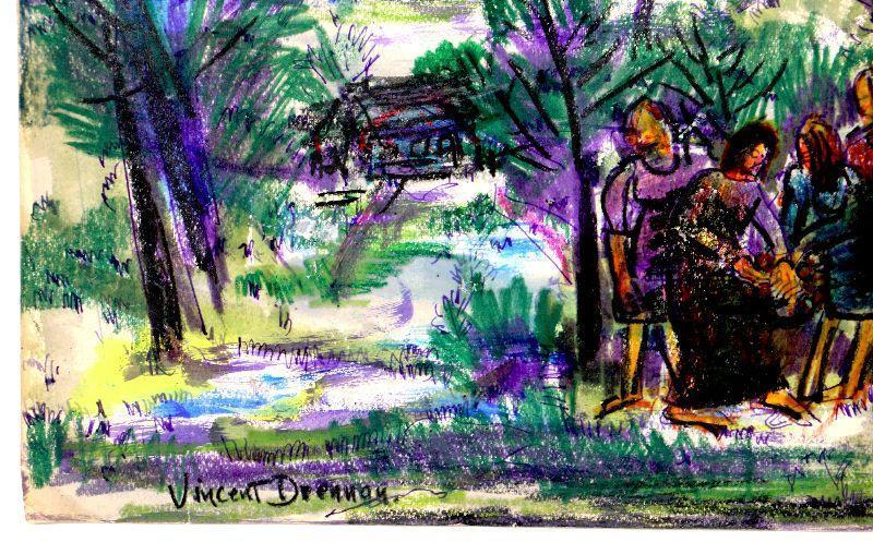 Original painting signed by artist Vincent Drennan. Medium: Pastel/Watercolor, Support: Paper, Artist: Vincent Drennan, Signature: Yes - 3 times, lower left plus twice on the back of the painting, Approximate Work size: 24" x 18", Date of creation: 1942, Country of Origin: American, Condition: good/very good - as seen on pictures.