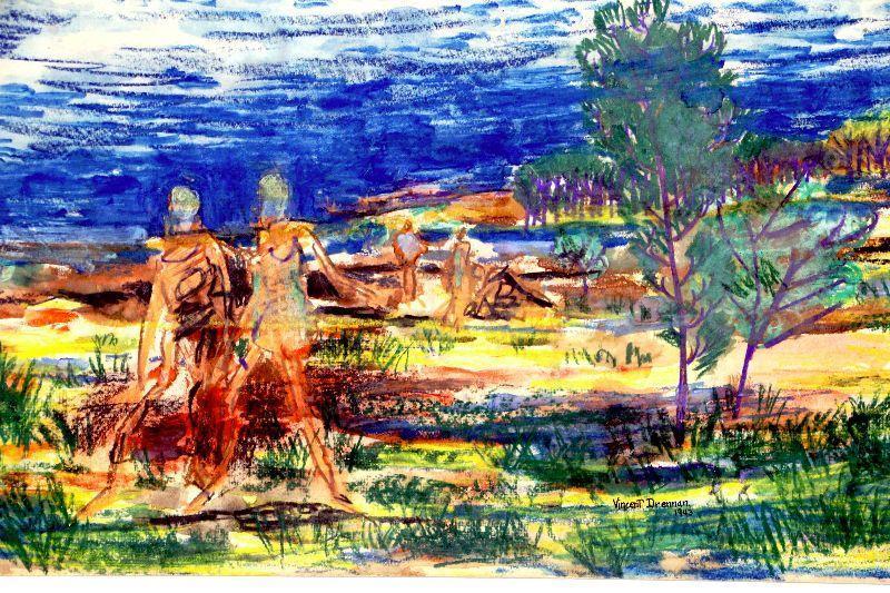 Original painting signed by artist Vincent Drennan. Medium: Watercolor/Goach/Pastel, Support: Paper, Artist: Vincent Drennan, Signature: Yes, lower right, Approximate Work size: 24" x 18", Date of creation: 1943, Country of Origin: American, Condition: good/very good - as seen on pictures.