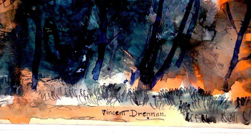 Original painting signed by artist Vincent Drennan. Medium: Watercolor/Goach, Support: Paper, Artist: Vincent Drennan, Signature: Yes, lower right, Approximate Work size: 24" x 18", Date of creation: 1950's, Country of Origin: American, Condition: good - as seen on pictures.