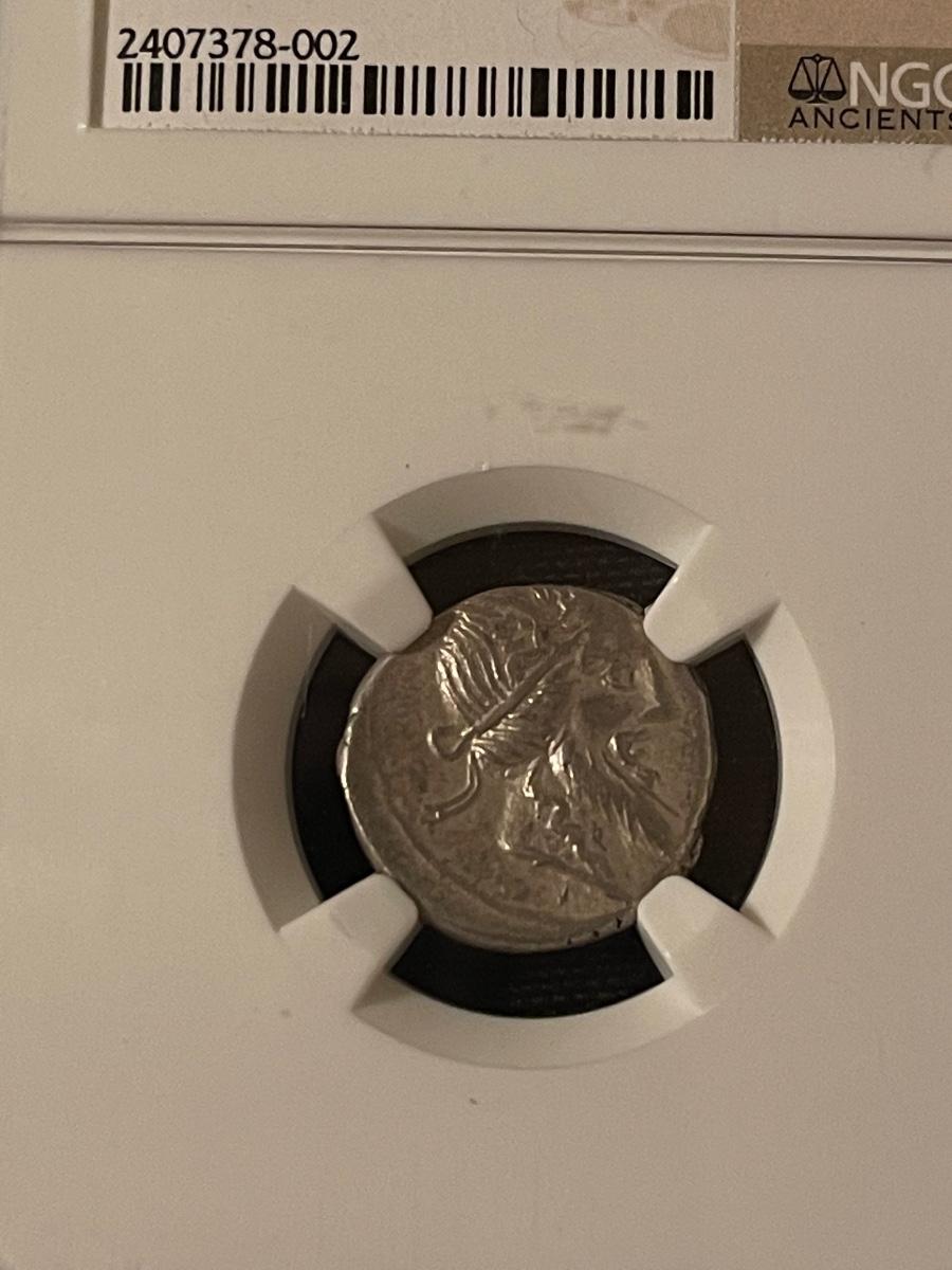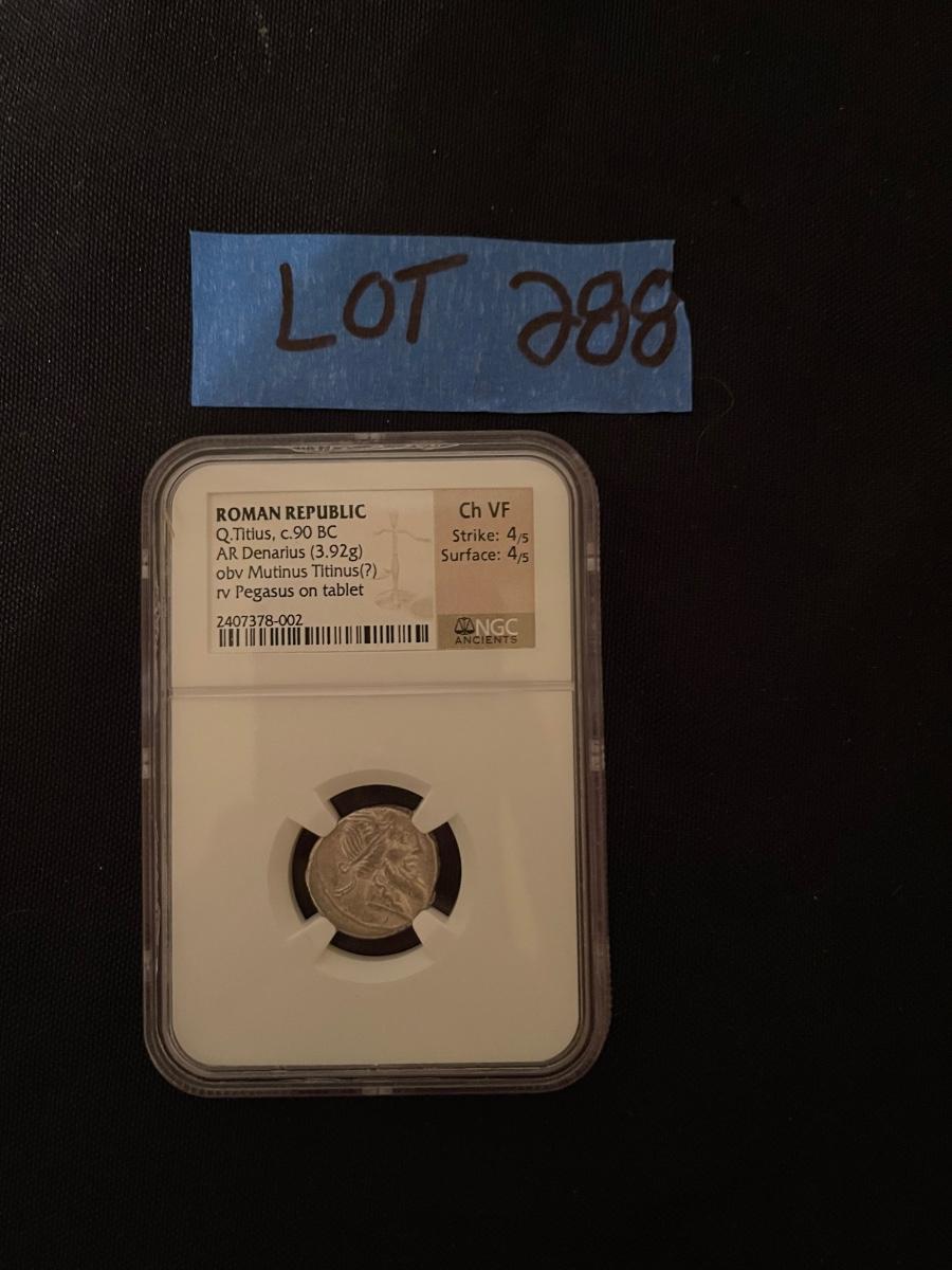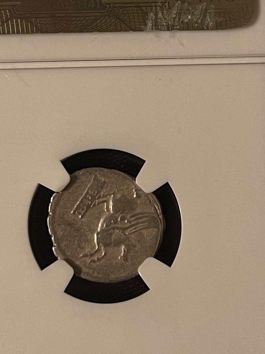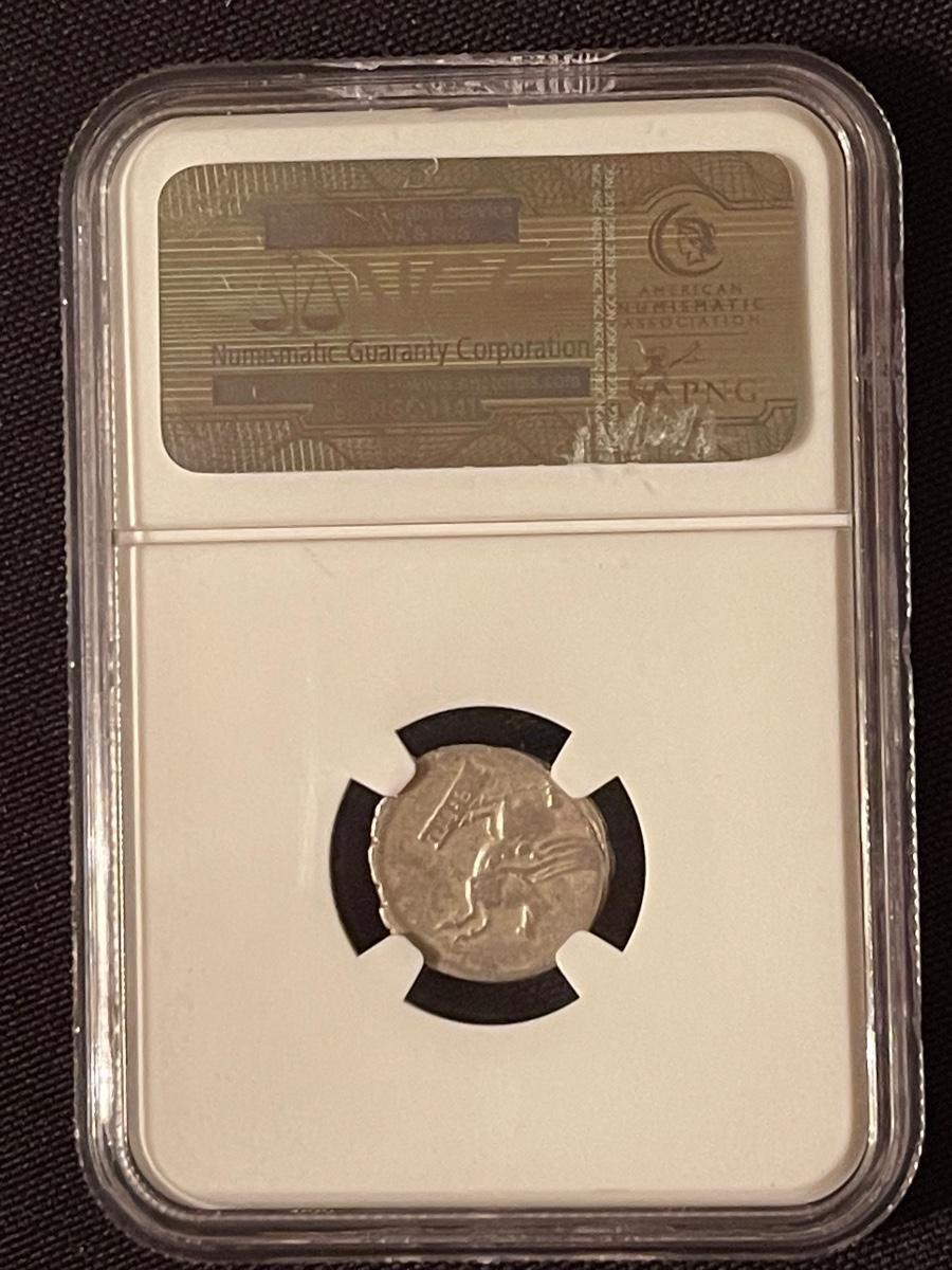 Circa 90 B.C. Roman Republic Q.Titius pegasus on tablet NGC certified VF strike 4/5 surface
