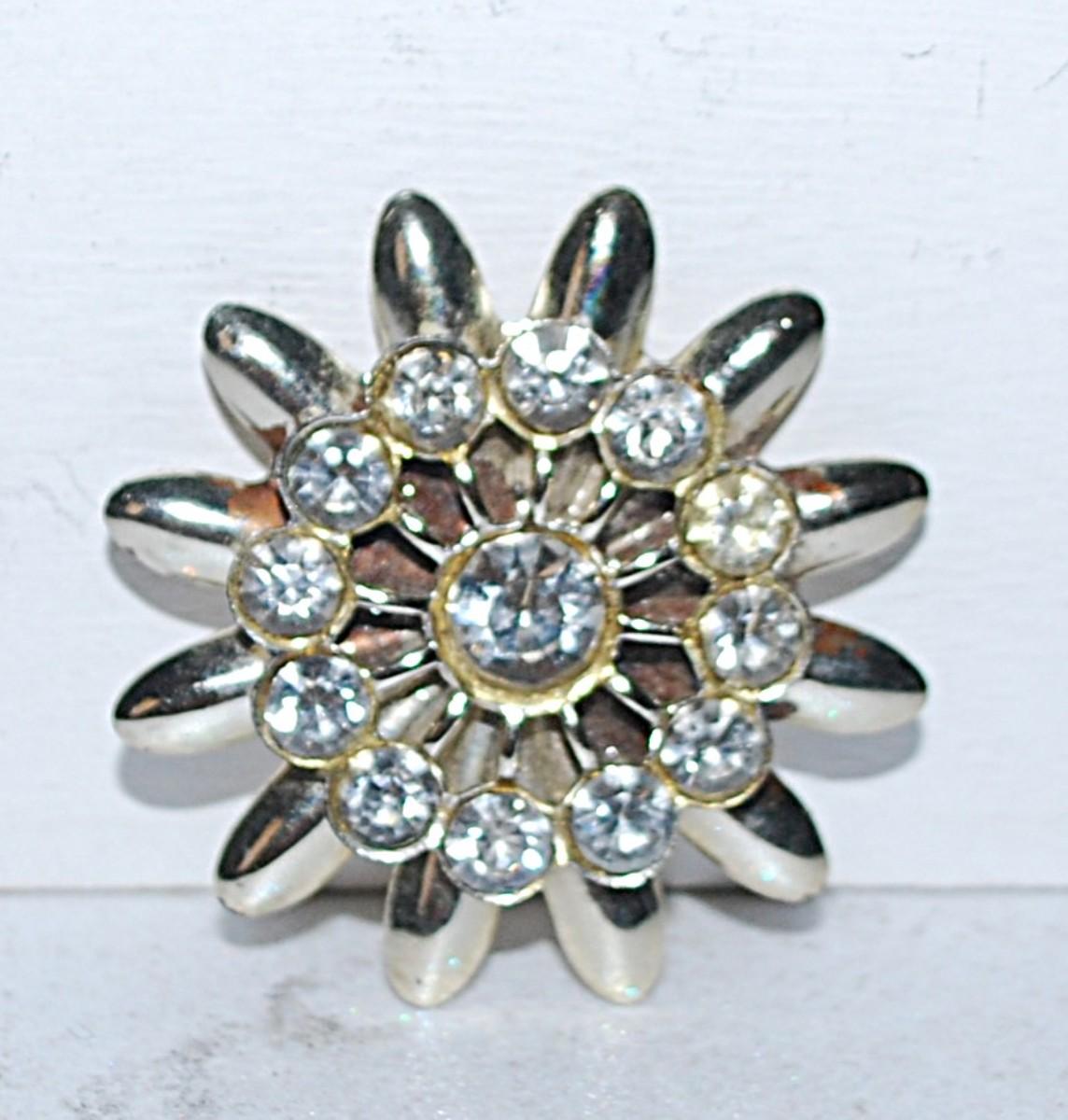 Circle Designed Dozen of Round Clear Beveled Stones BROOCH (1¾" Diam.) with 12 Metal Flower Petals on a Silver Tone Setting