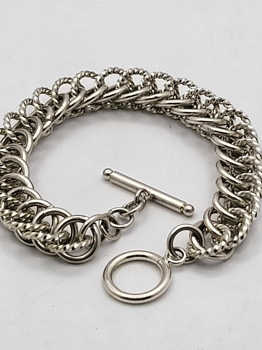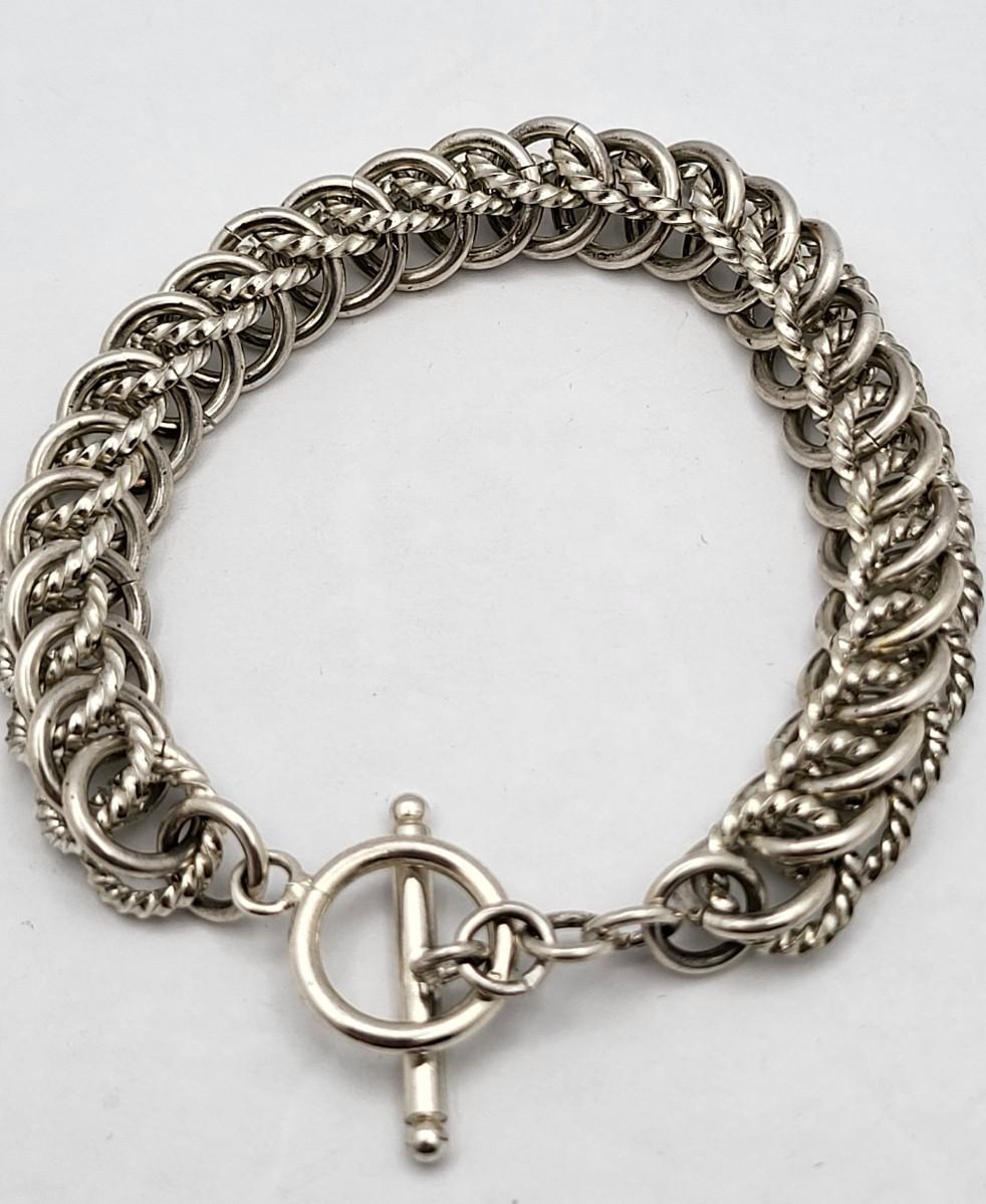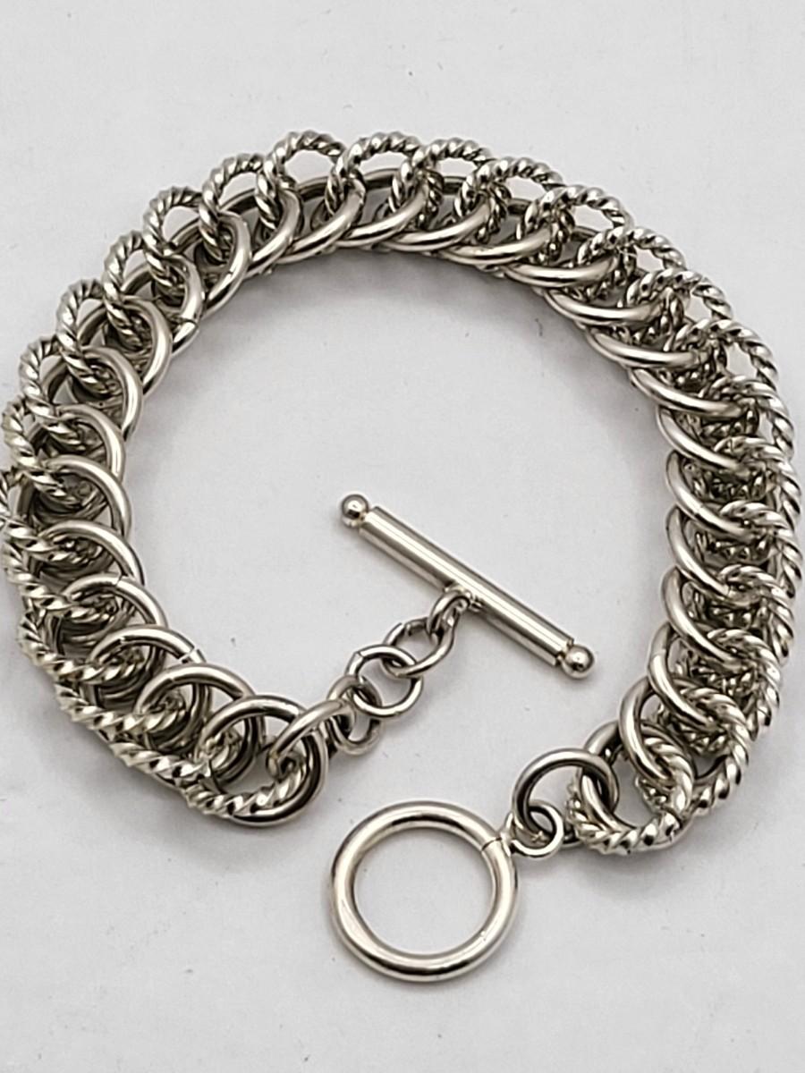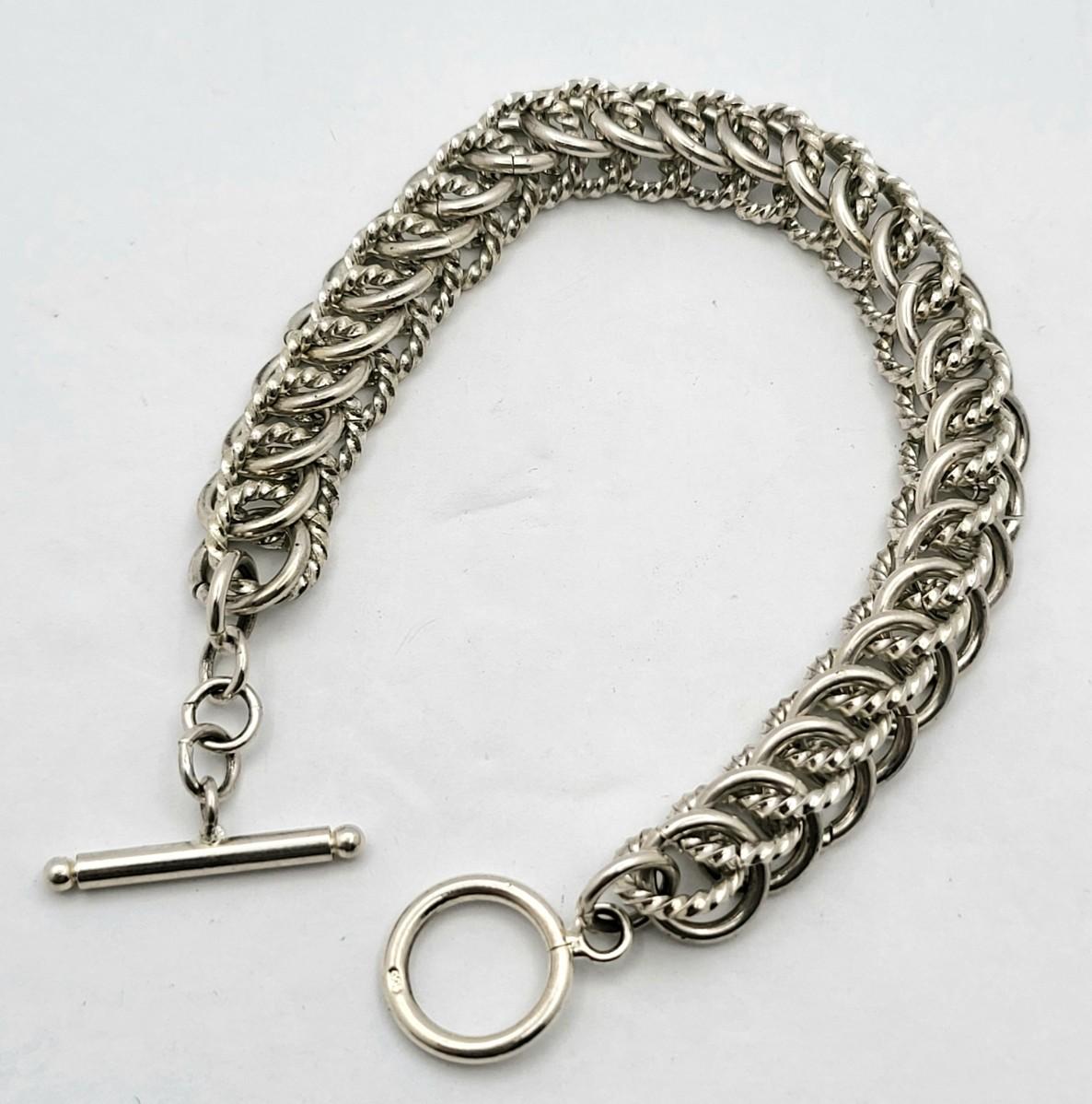 Sterling silver, interlocking circles, link bracelet, 7.25" long with toggle clasp. Weighs 36 grams.