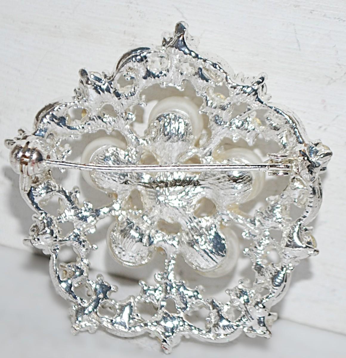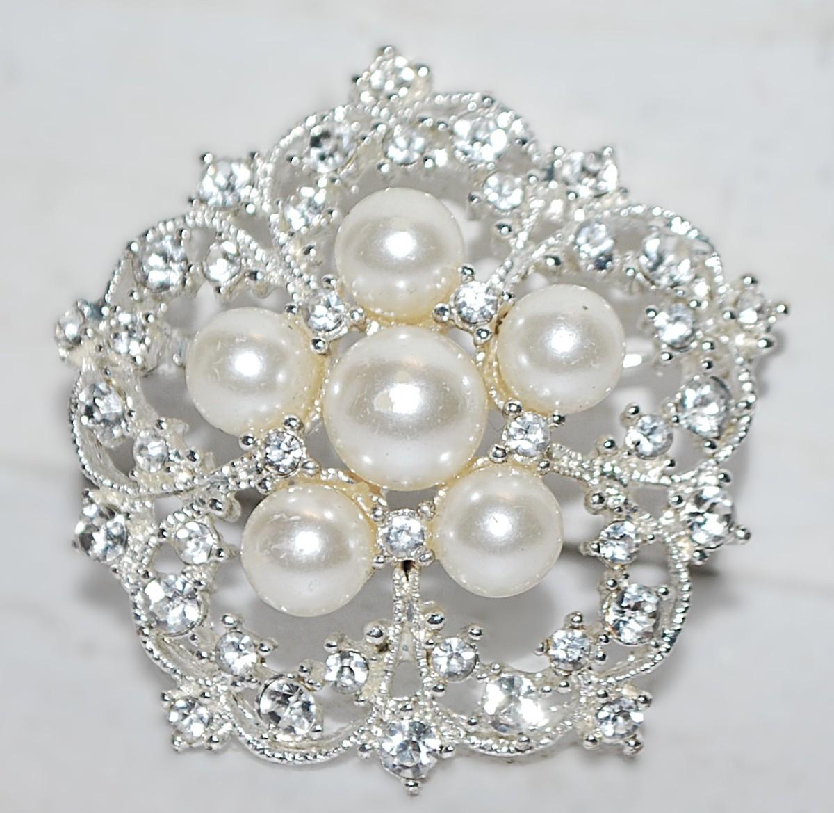 Circle of 6 Faux White PEARLS BROOCH (1¾" Diam.) and a Glitter of Stones Surround on a Silver Tone Wire-Style Setting