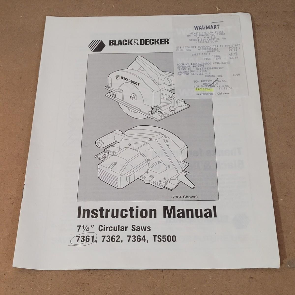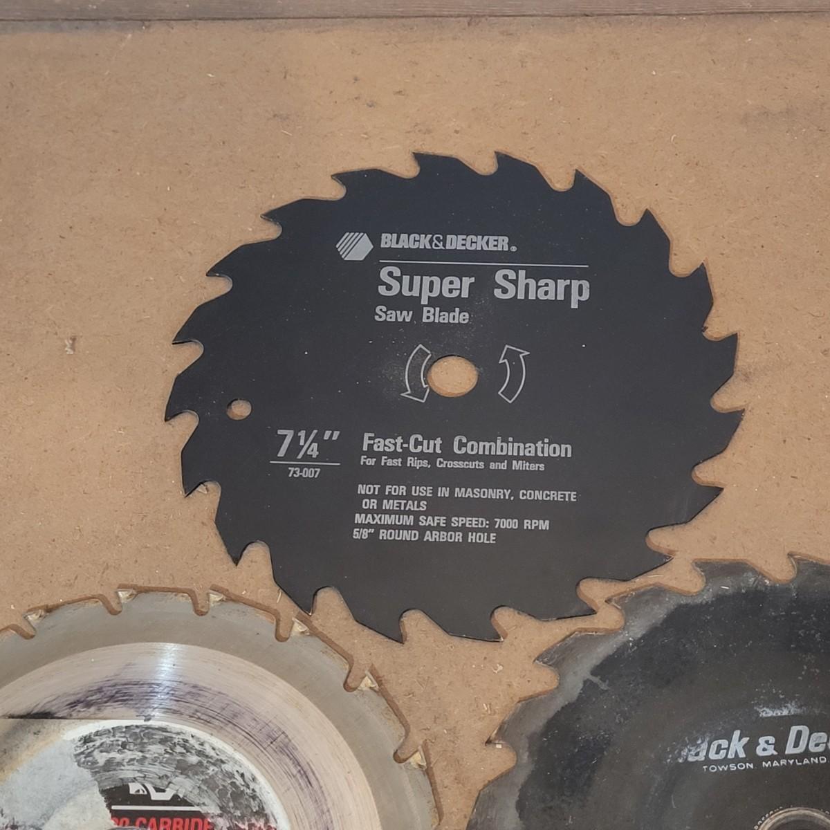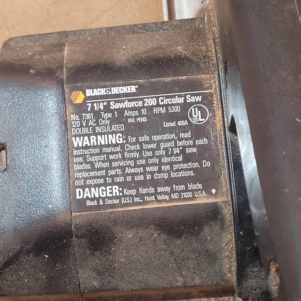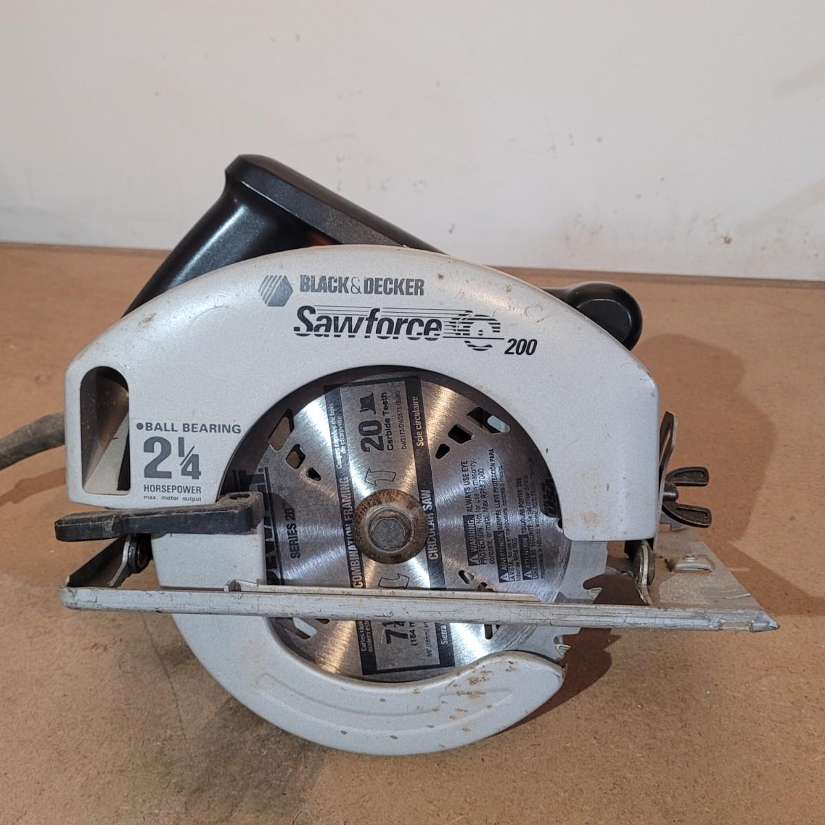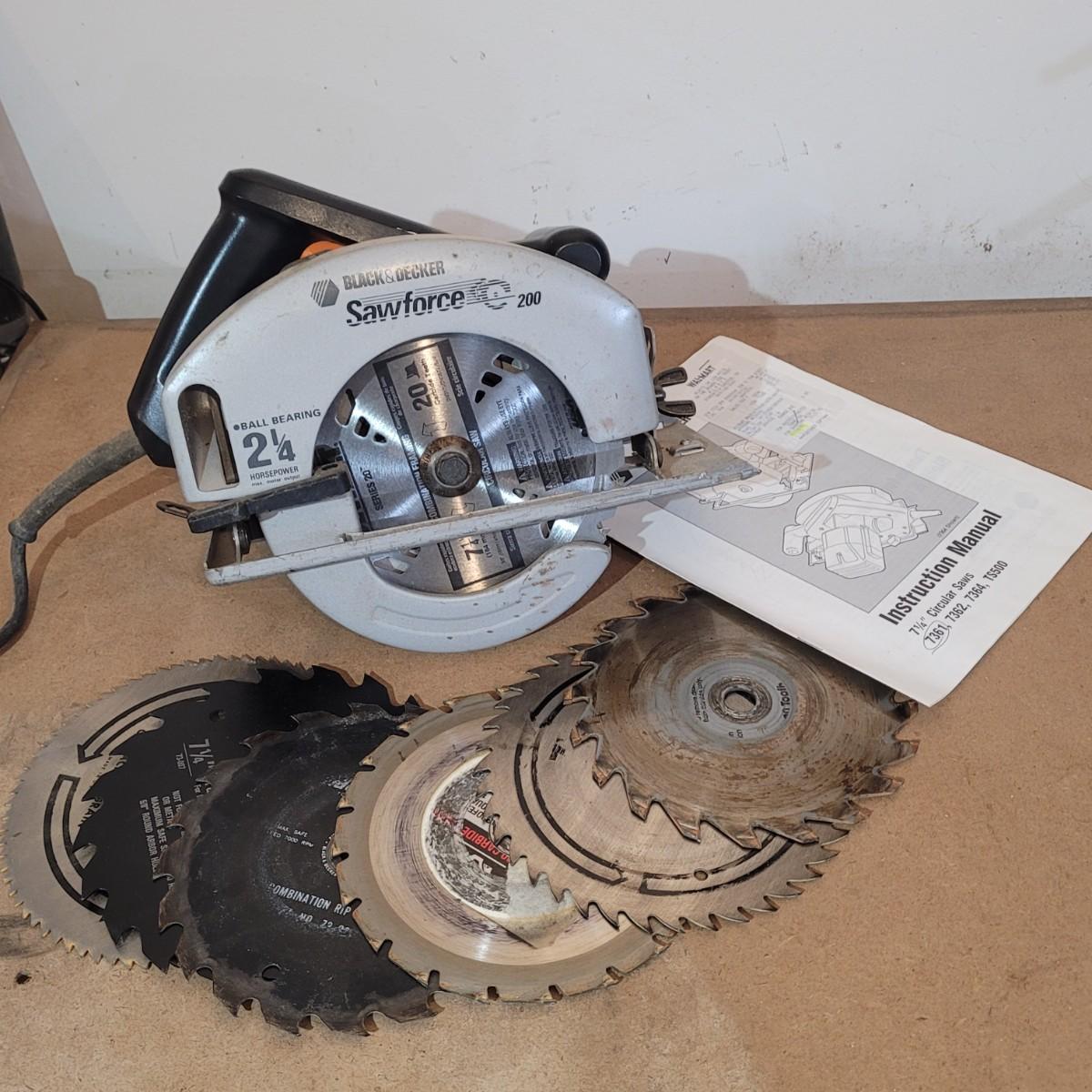 Black and Decker brand 7-1/4" corded circular saw. Sawforce200 model. Powered on when plugged in. Includes seven varying blades. Includes original paperwork. Item measures 11" x 10" x 11"H.