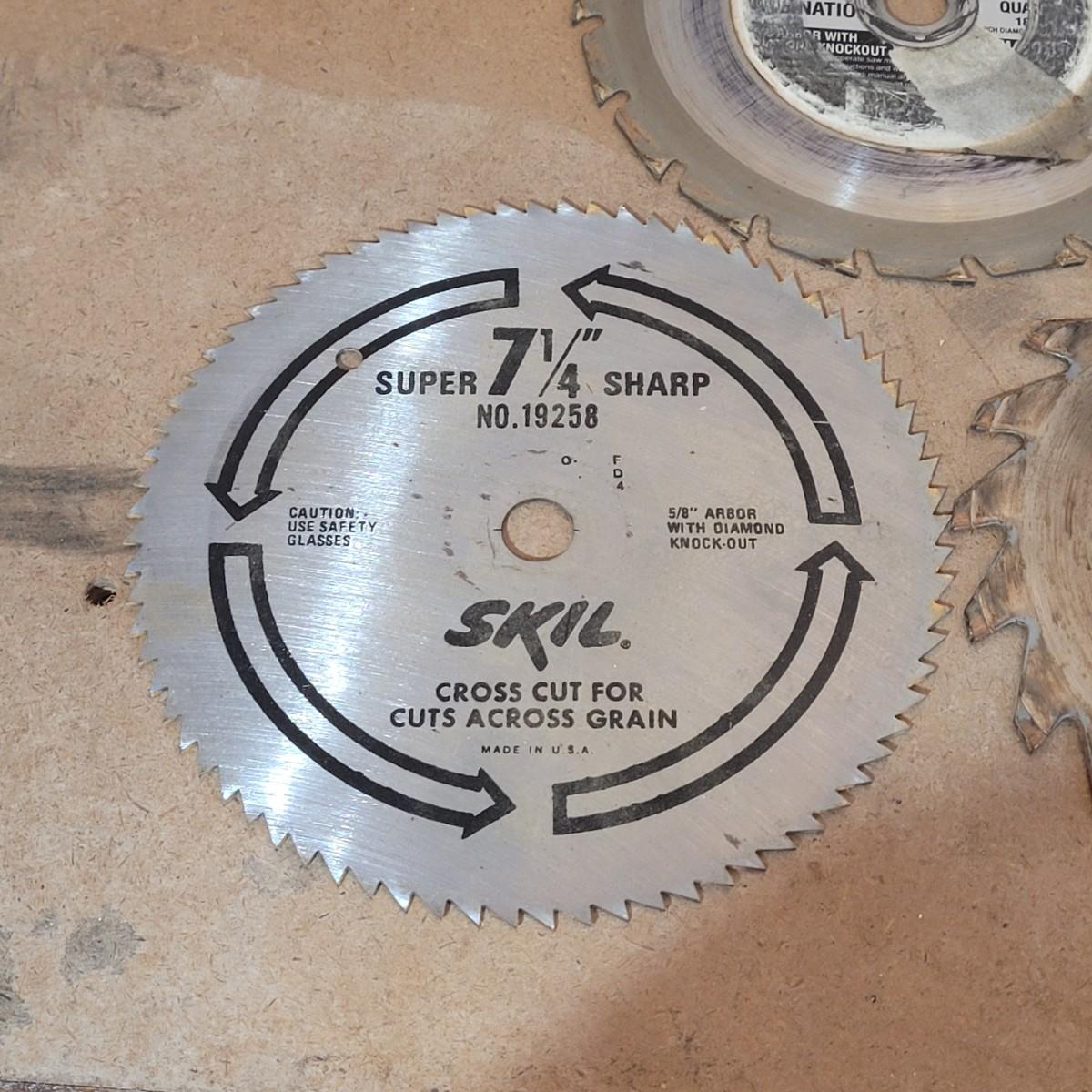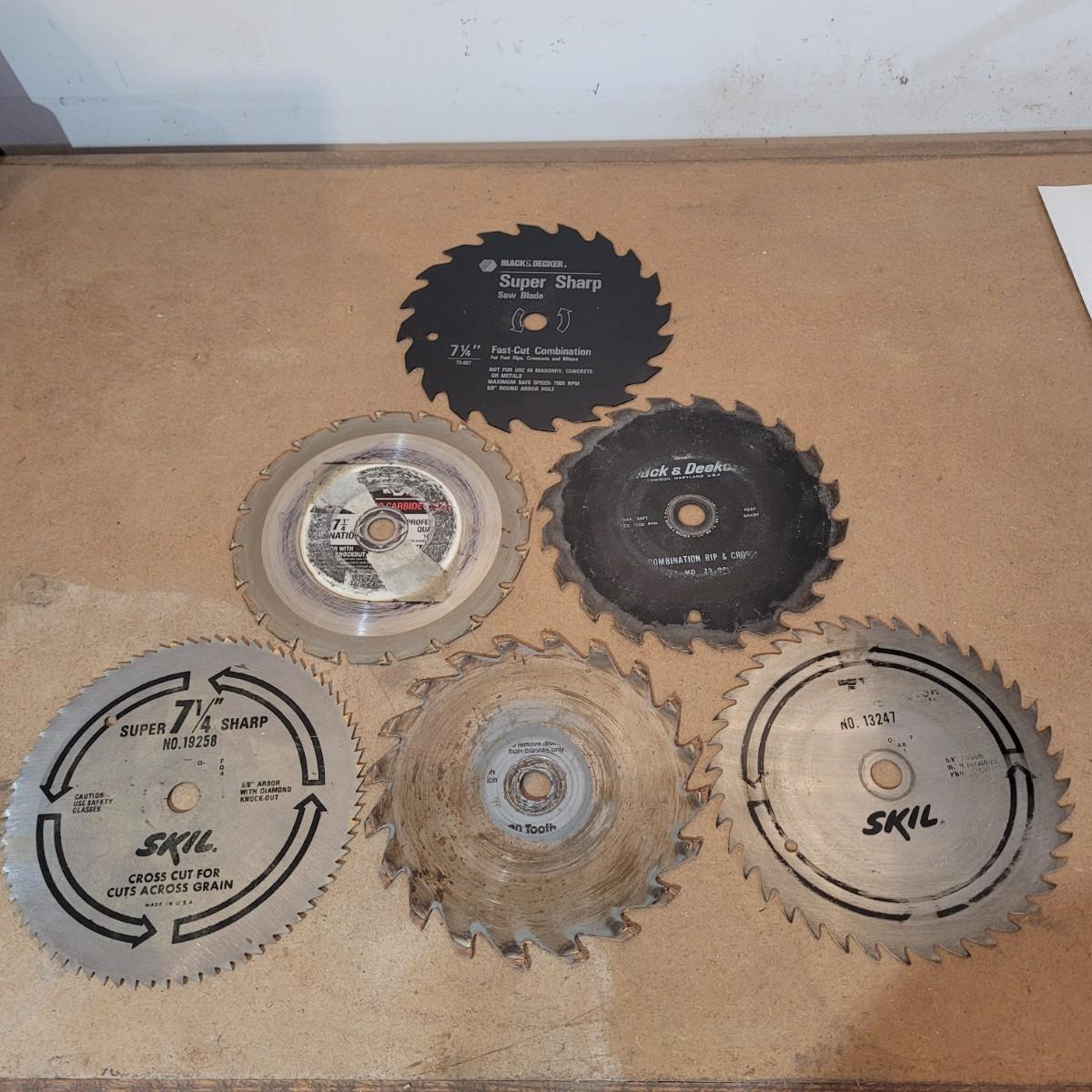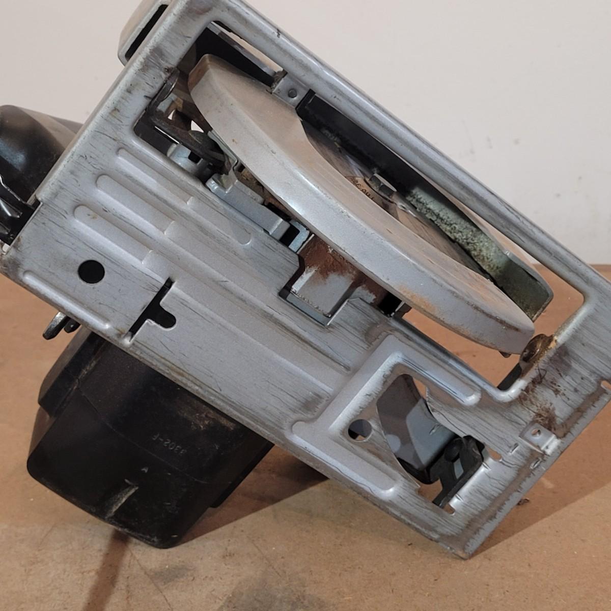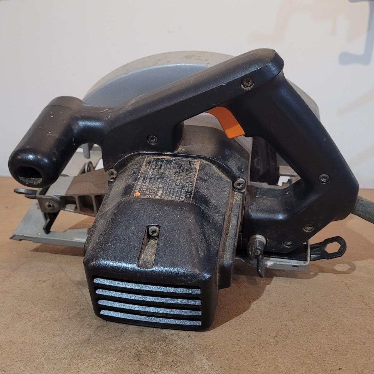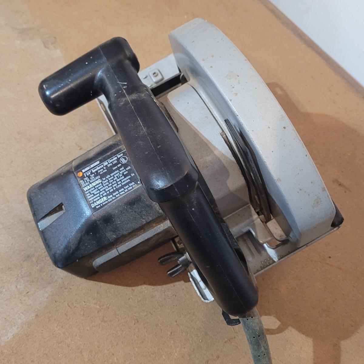 Black and Decker brand 7-1/4" corded circular saw. Sawforce200 model. Powered on when plugged in. Includes seven varying blades. Includes original paperwork. Item measures 11" x 10" x 11"H.