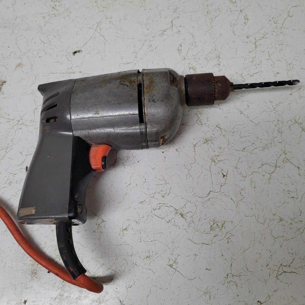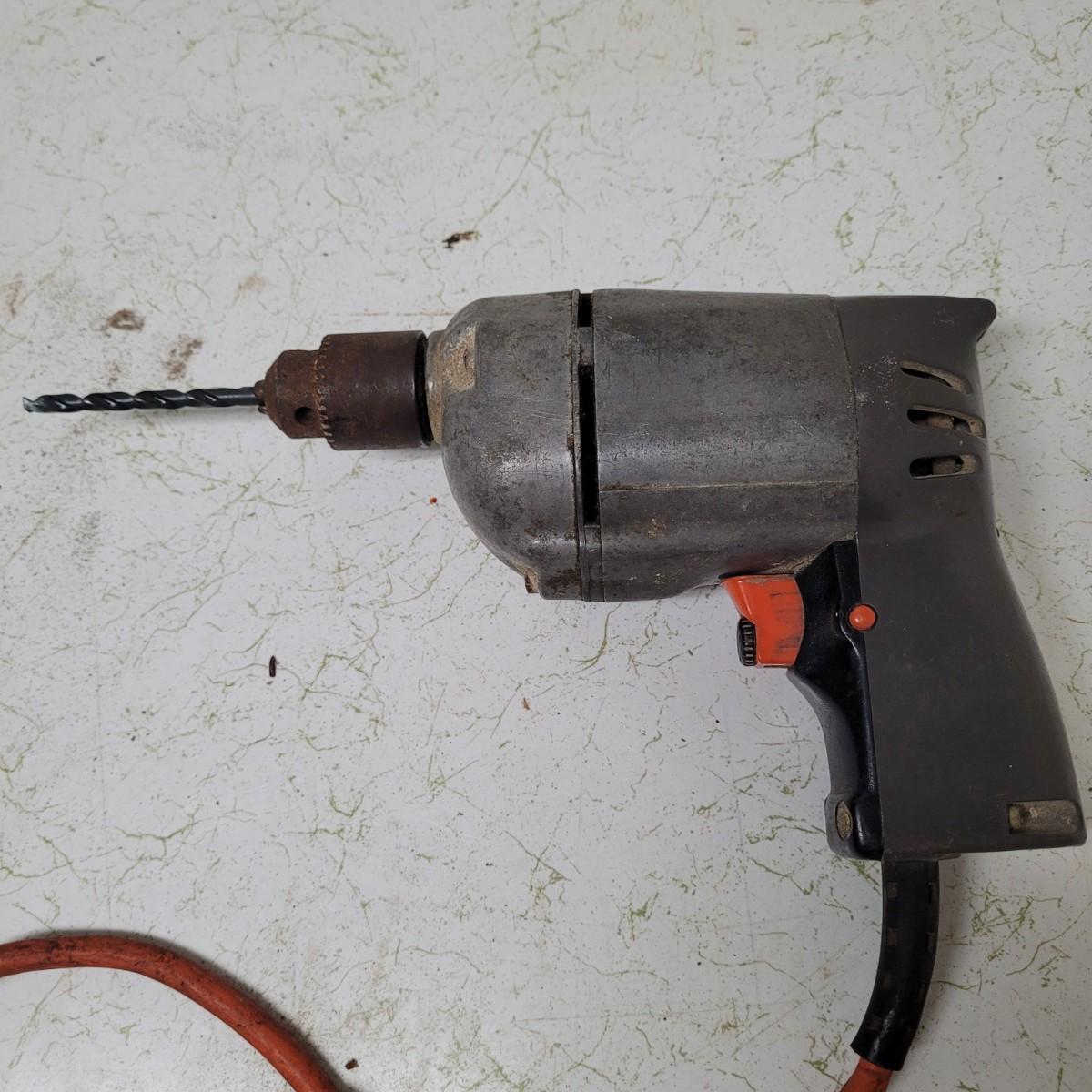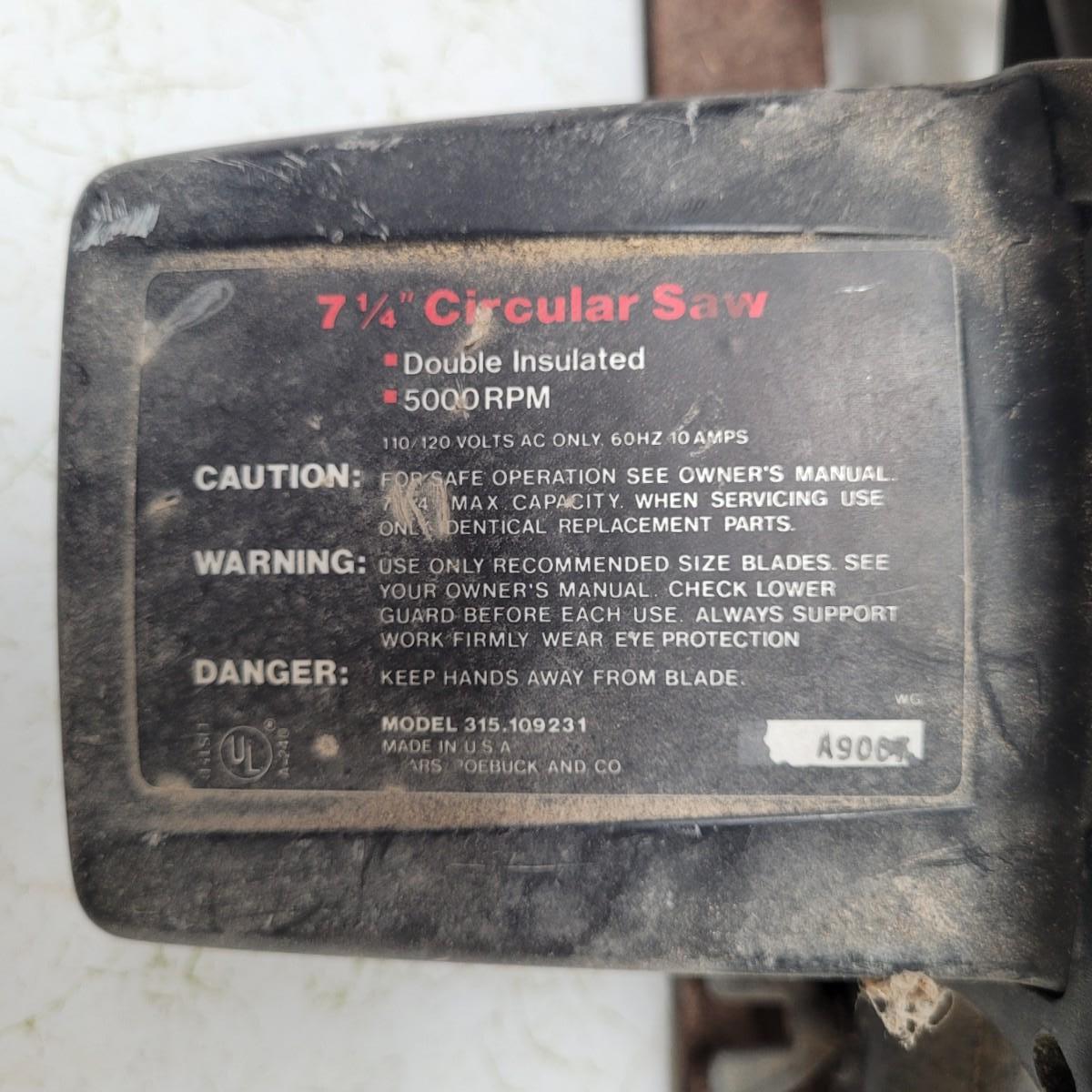 This lot includes a Sears brand circular saw and a power drill. The circular saw is 7-1/4" and 2-1/8 HP. It is corded and powered on when plugged in. The blade is old and needs replaced. The power drill is unmarked. It is corded and powered in when plugged in.