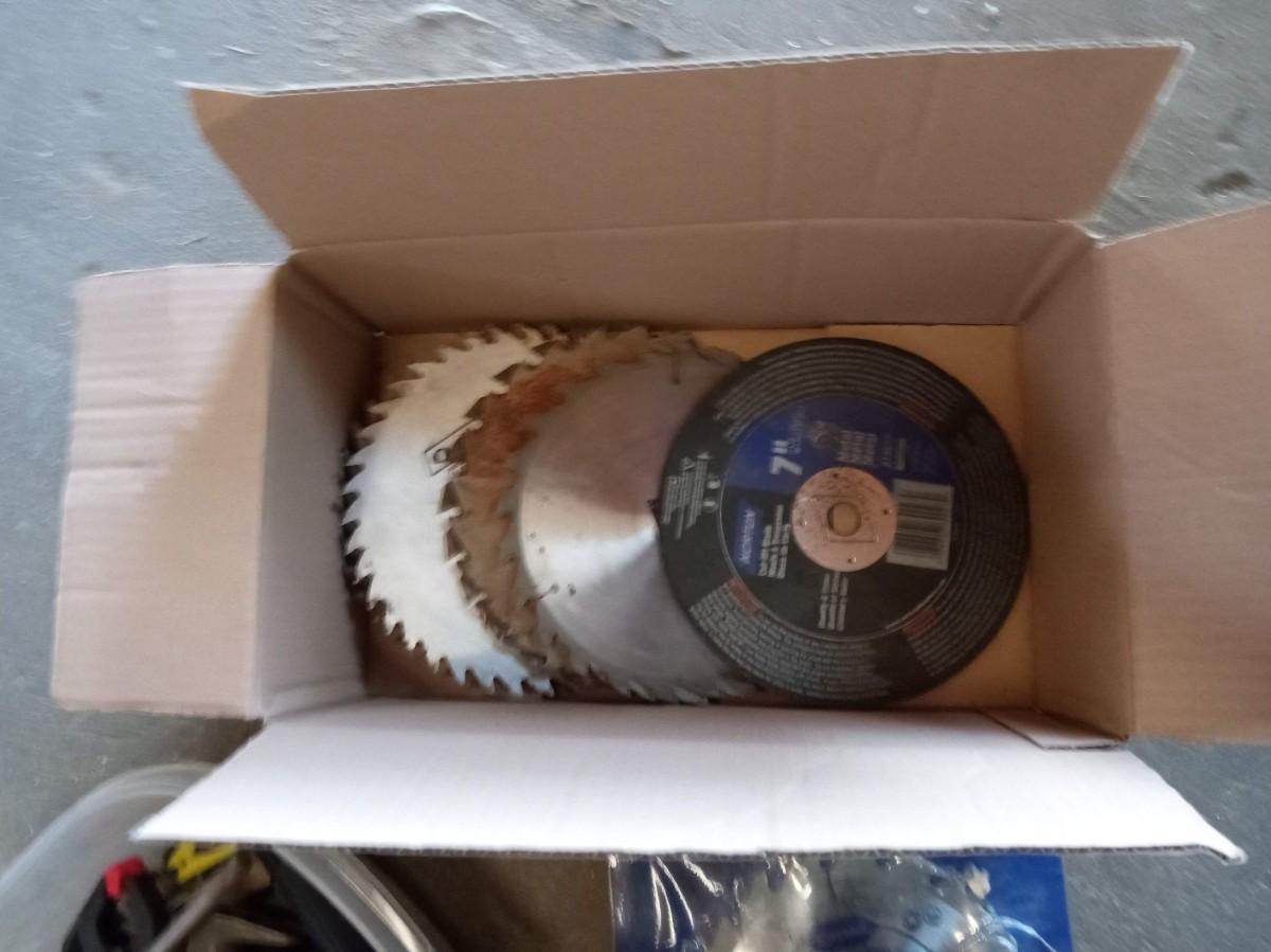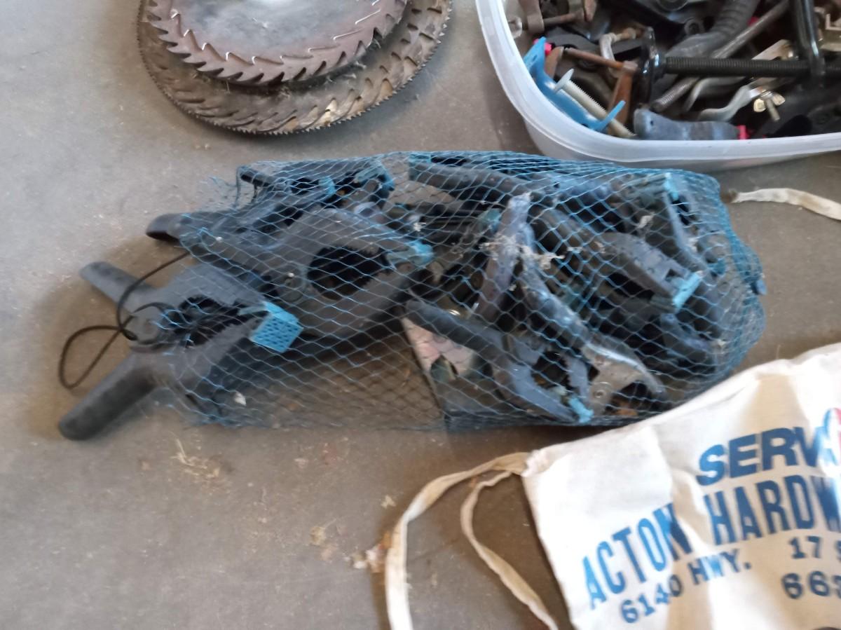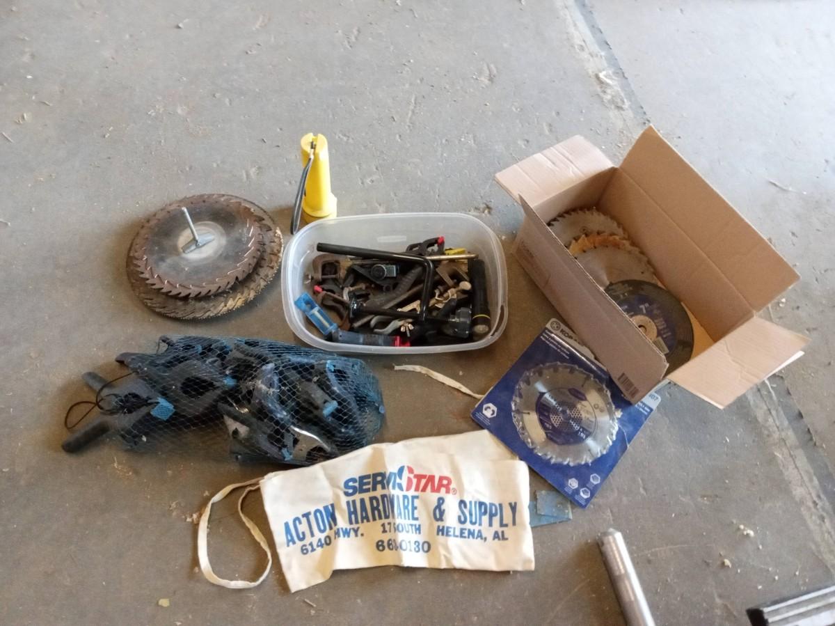 MOSTLY 7 1/4" SAW BLADES, MANY DIFFERENT TYPES OF CLAMPS, APRON AND FLASHLIGHTS
