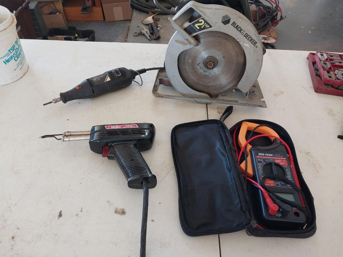 CIRCULAR SAW, VOLTAGE METER, SOLDERING GUN & A DREMEL