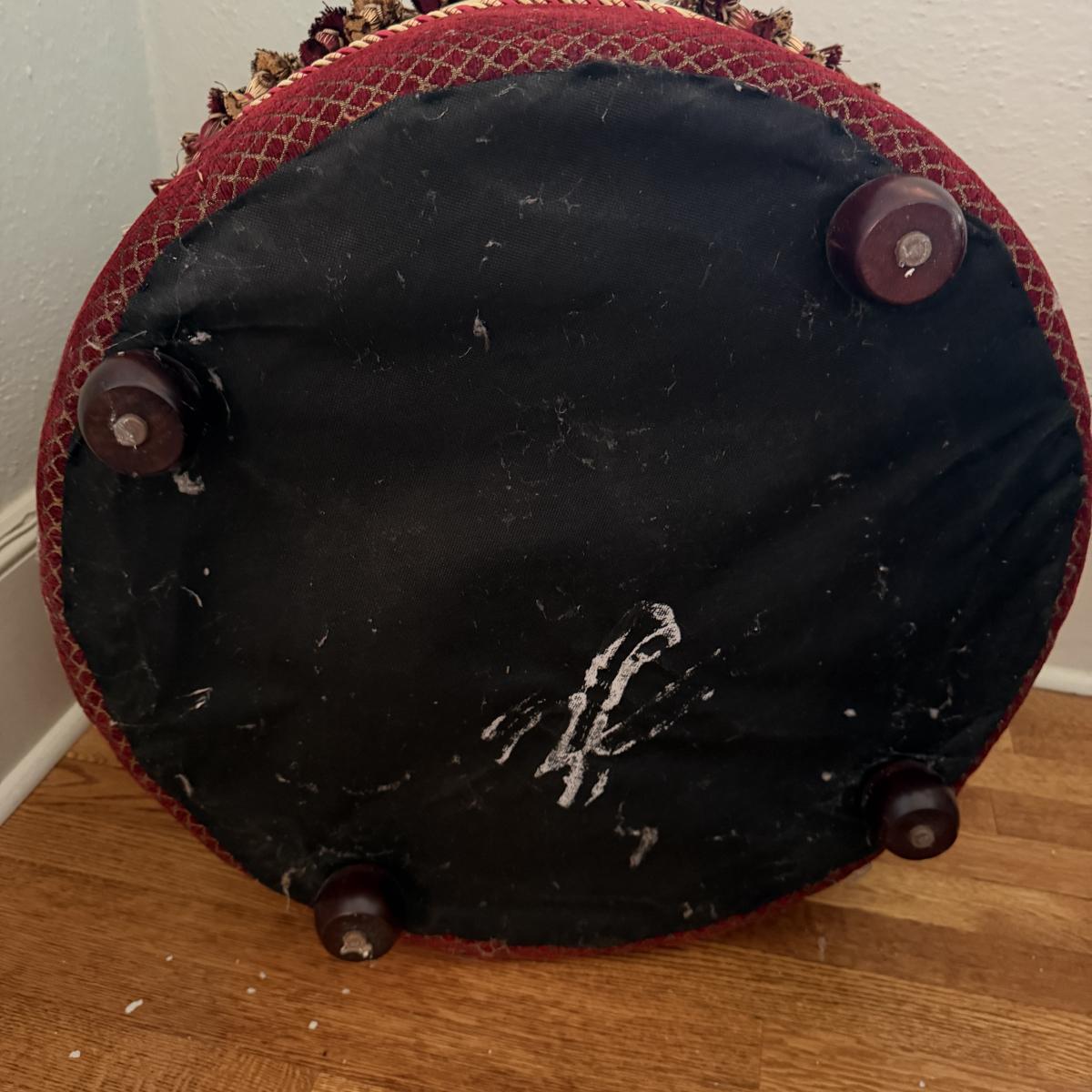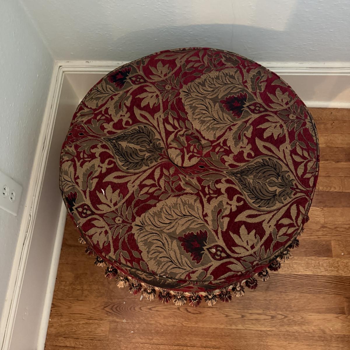 Lot includes a circular upholstered ottoman with fringe on the side. Fabric is a dark red and gold jacquard. Ottoman measures 24”D x 17”H.