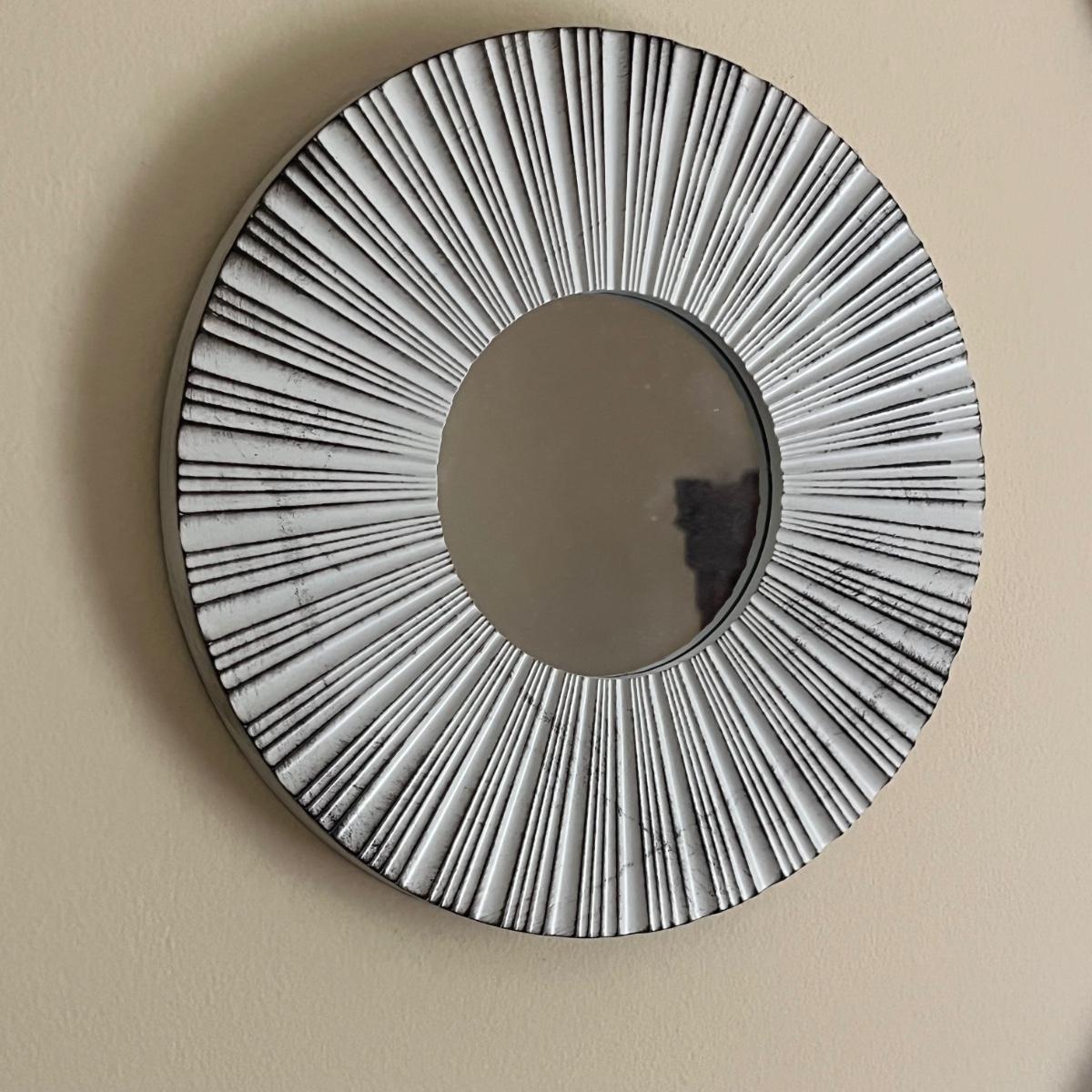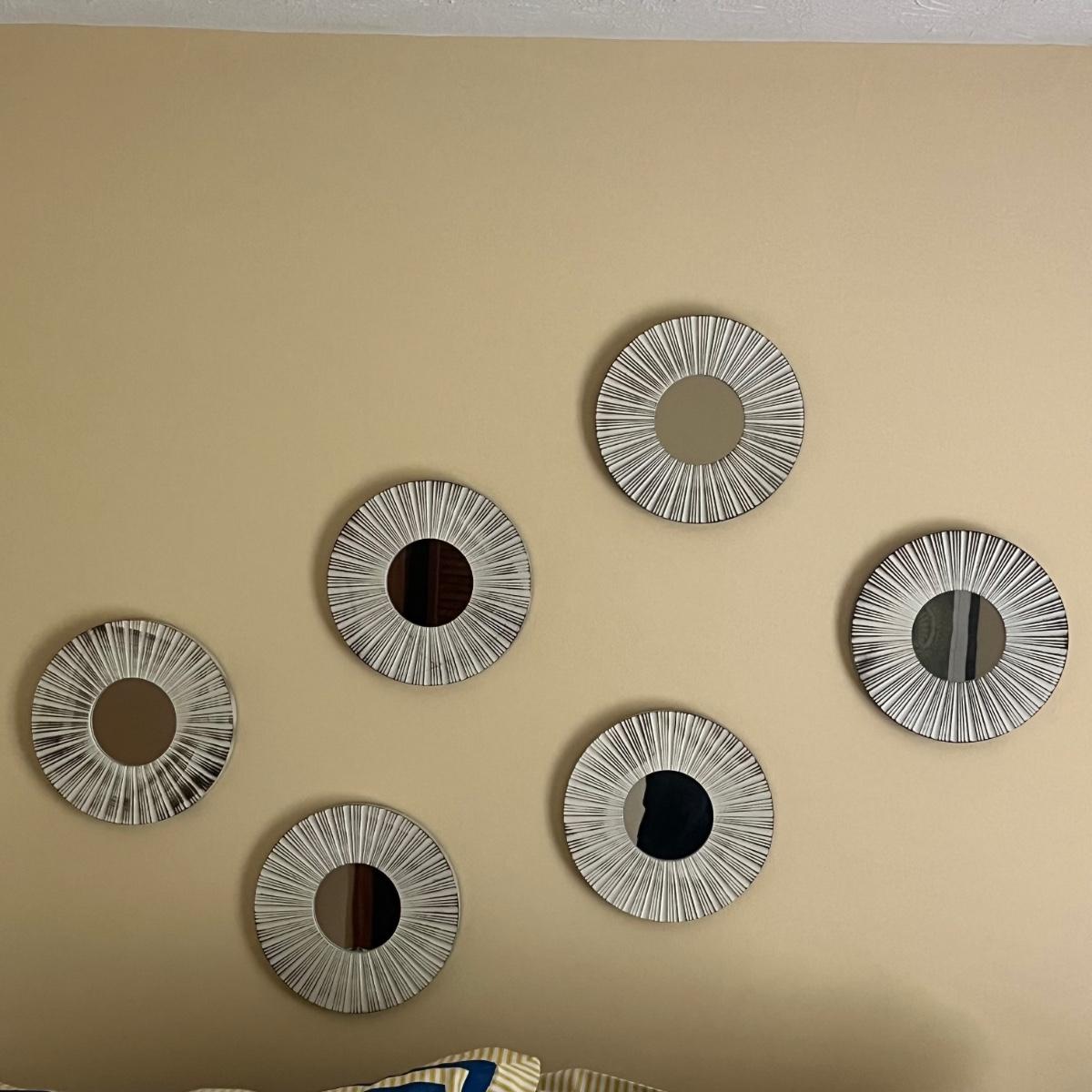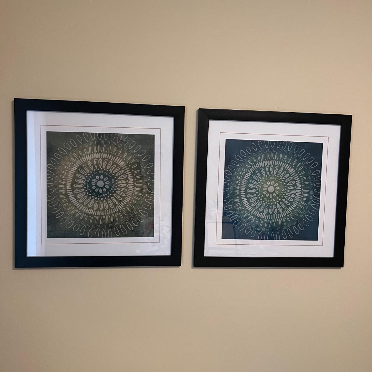 Lot includes two framed and matted prints under glass and six decorative circular mirrors. All frames are plastic. Square frames measure 18” x 18” and round pieces measure 9.75”D.