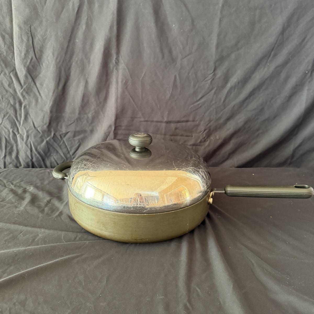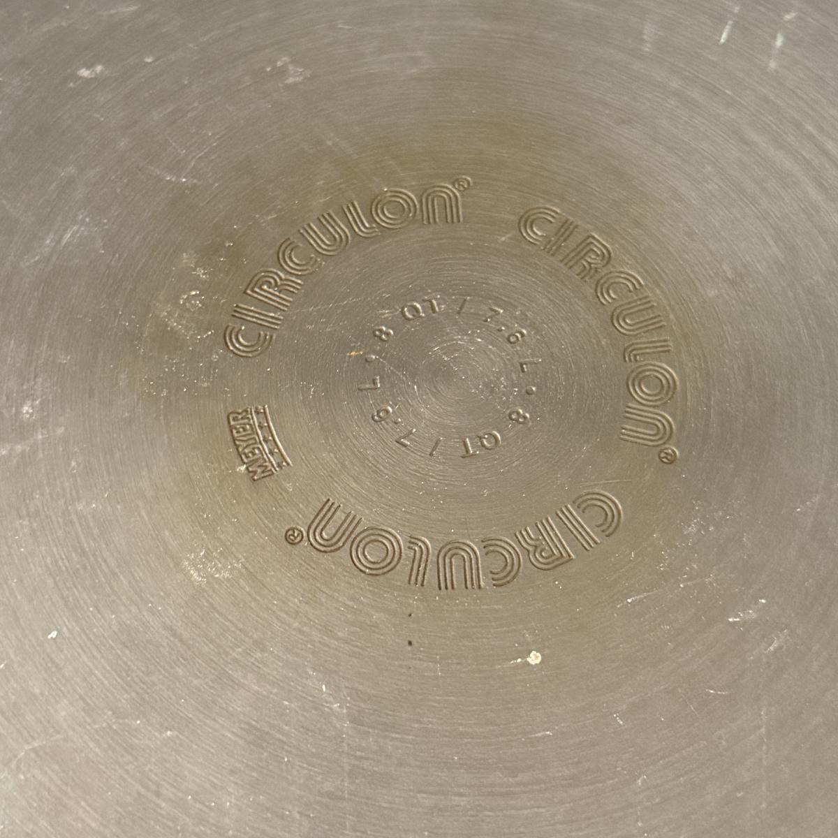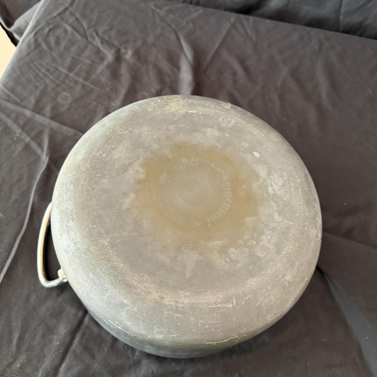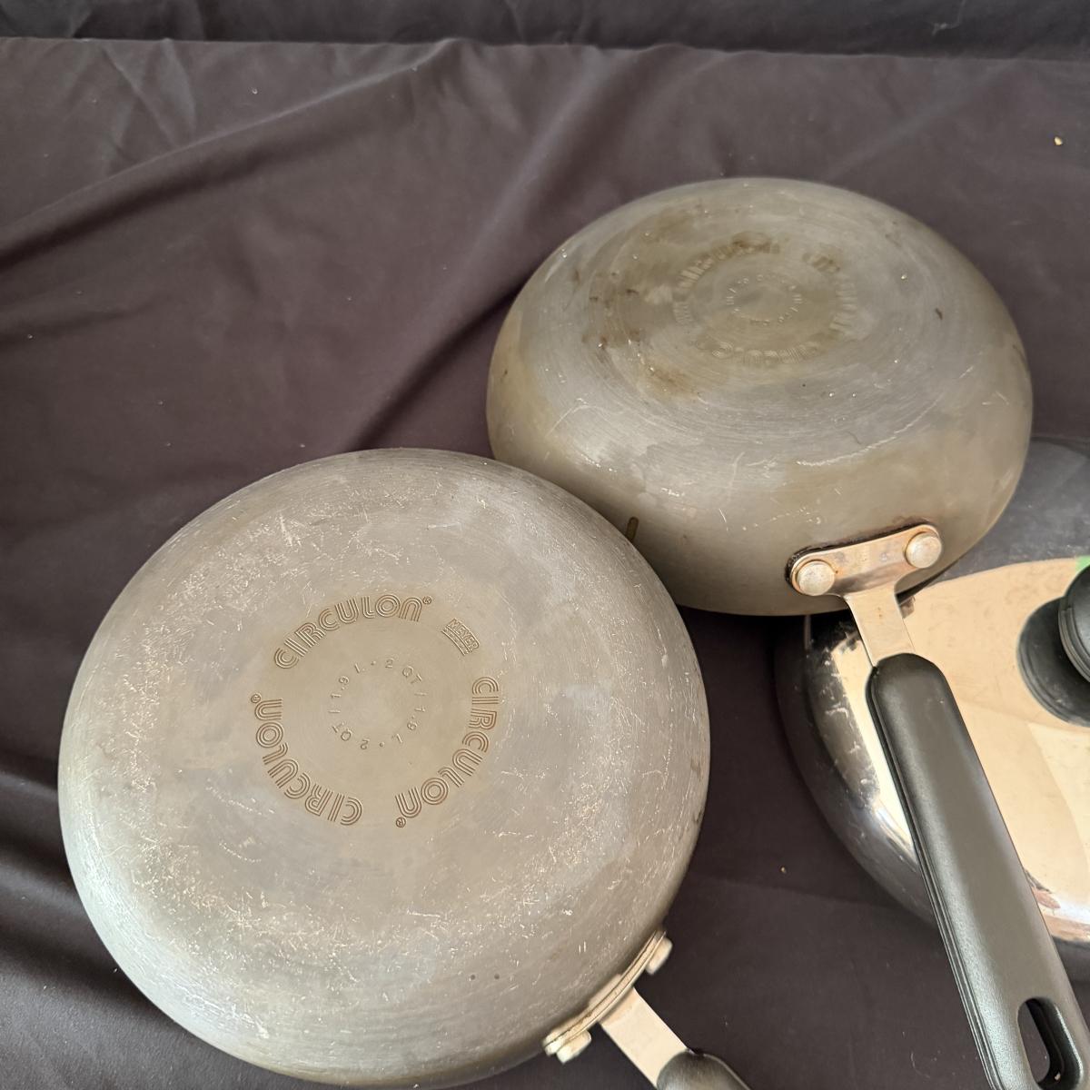 Lot includes three Circulon pans with lids, two Circulon pots with lids and a Circulon pot and pan without lids. Tallest pot with lid measures 9”D x 10.5”H. Tops have scratches, see pictures.