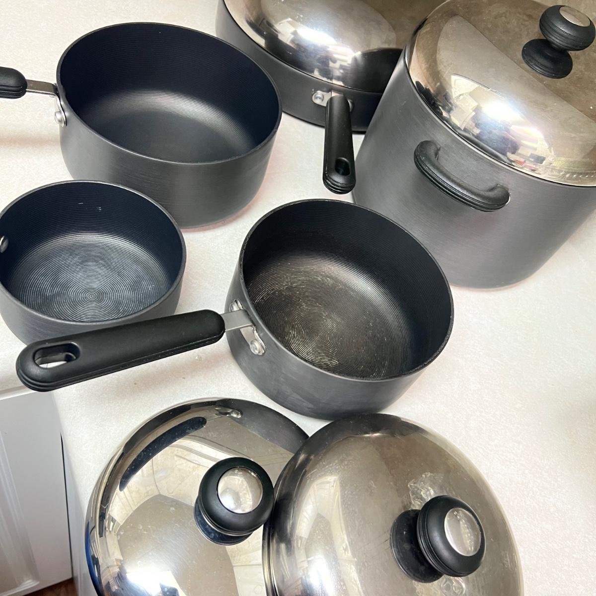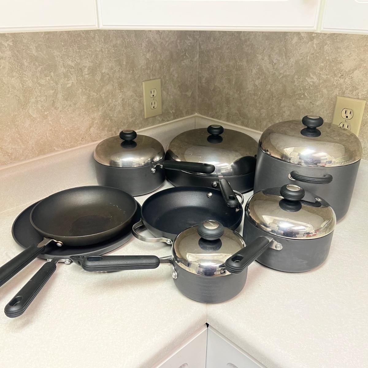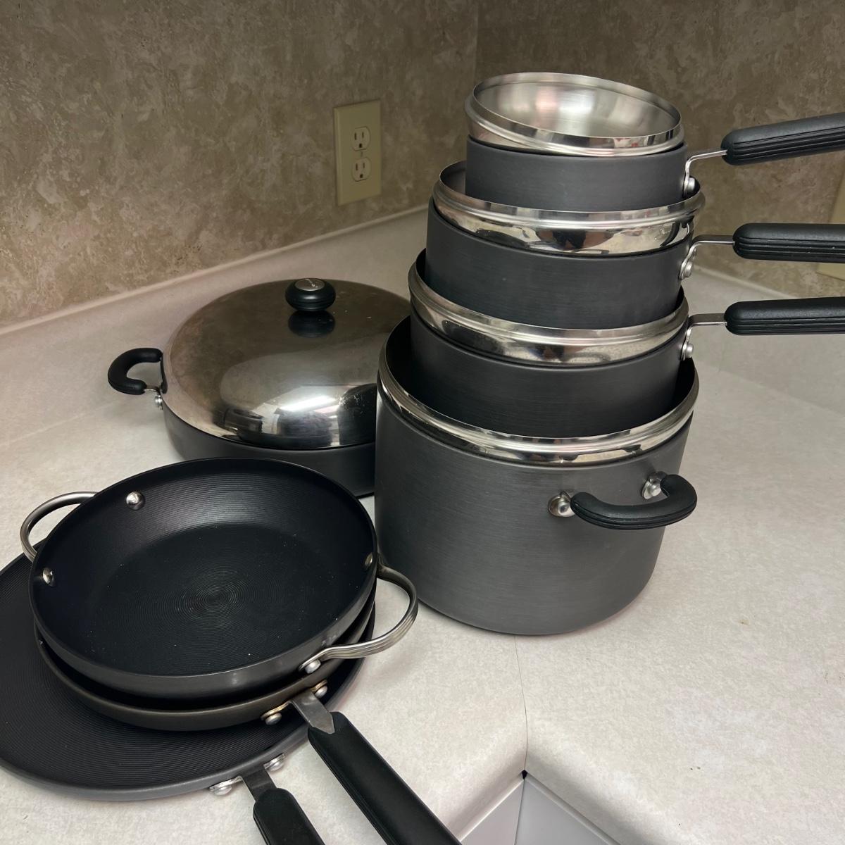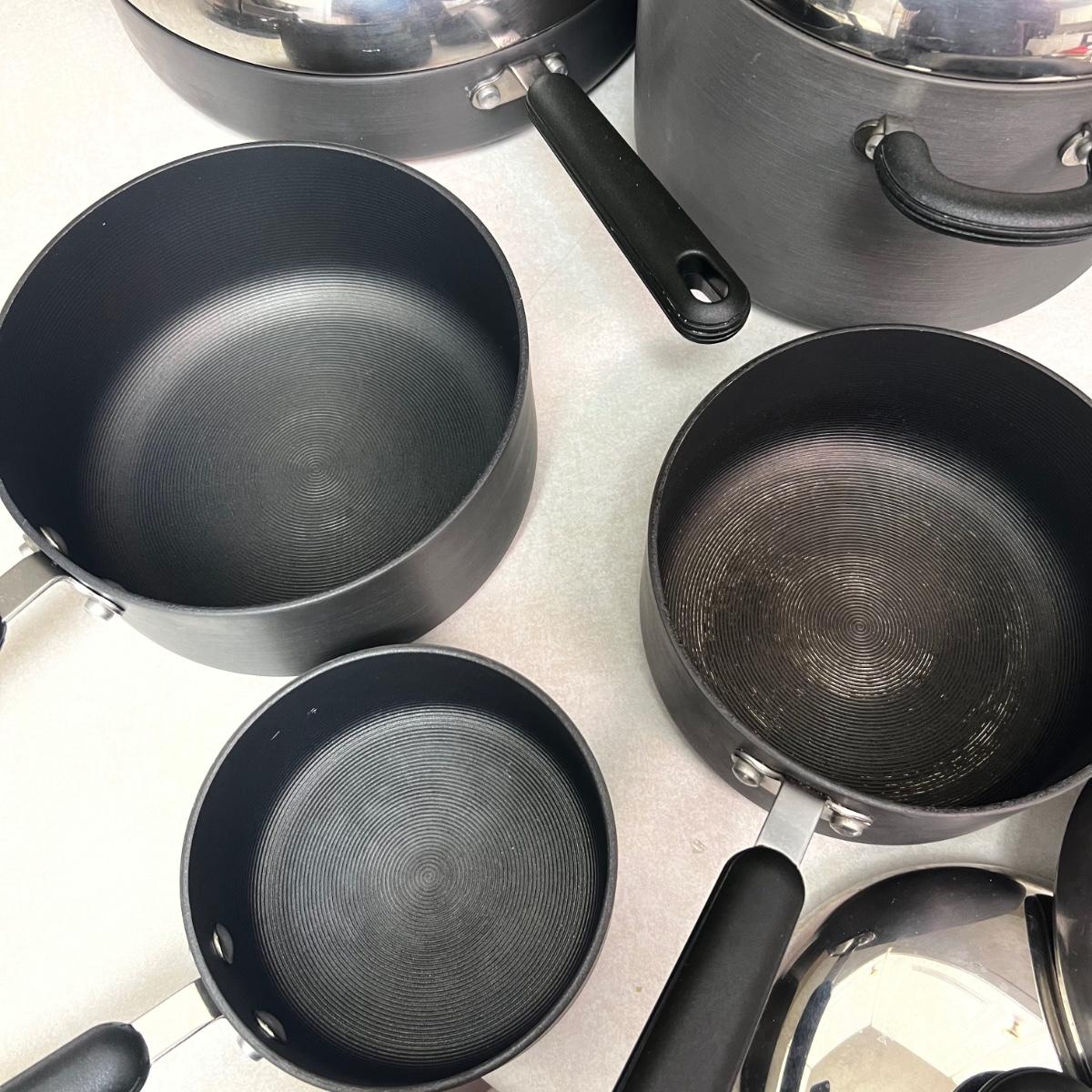 This large set of Circulon pots and pans consists of four lidded pots, a large lidded skillet, two frying pans and a third pot with two handles plus a Circulon slatted spoon.