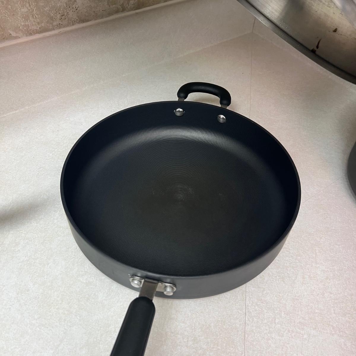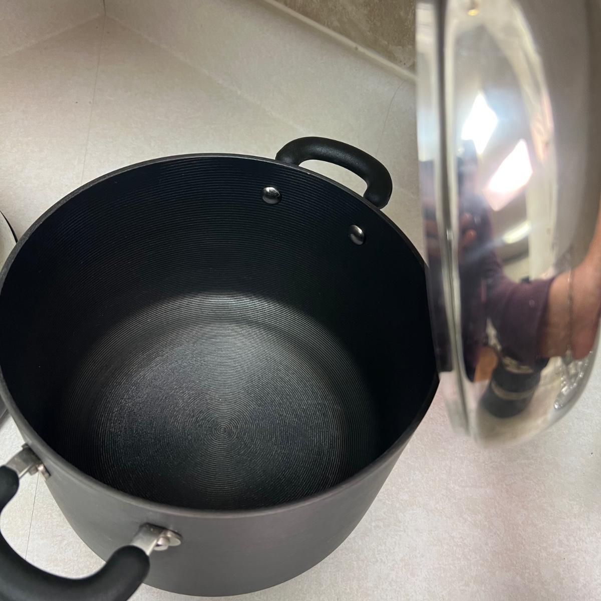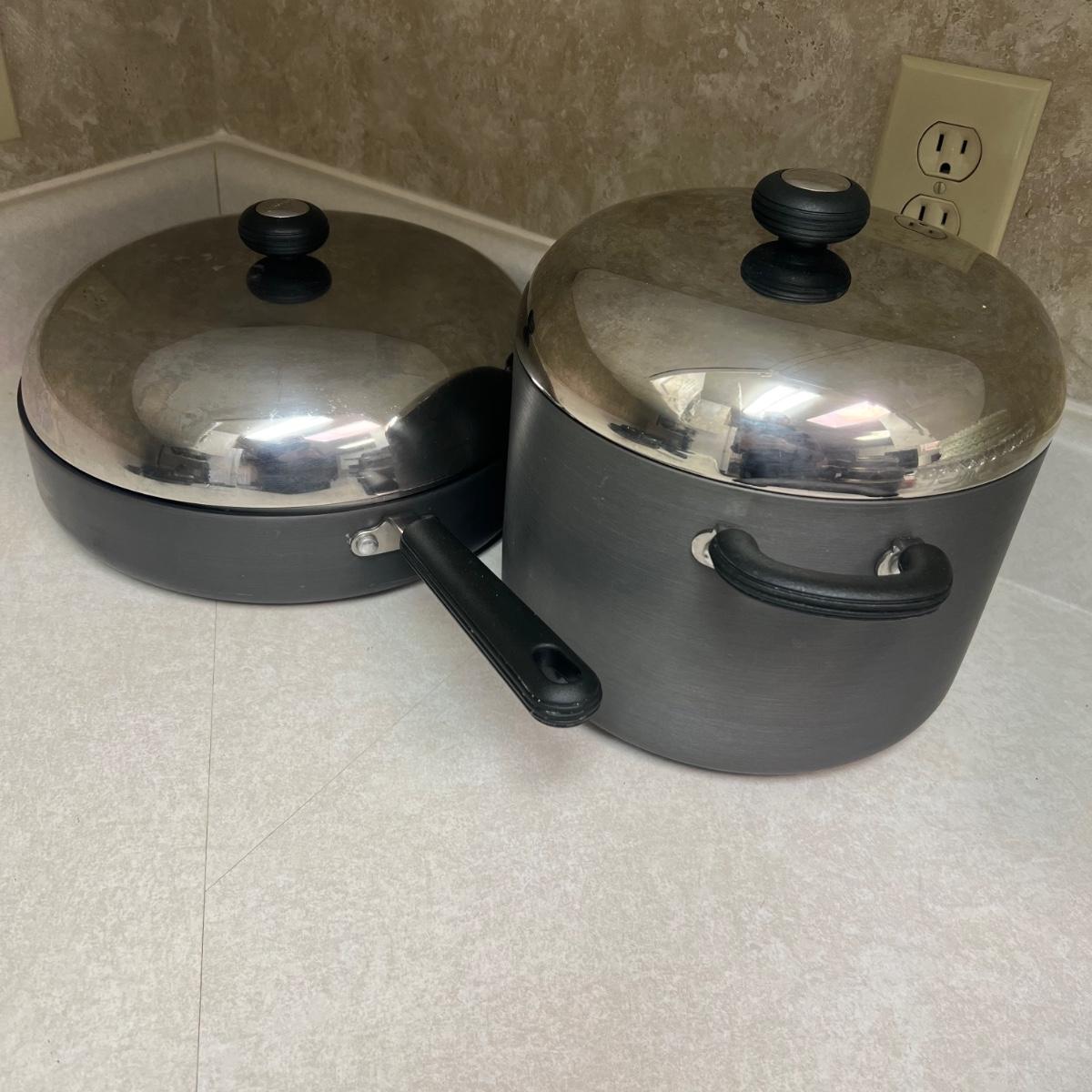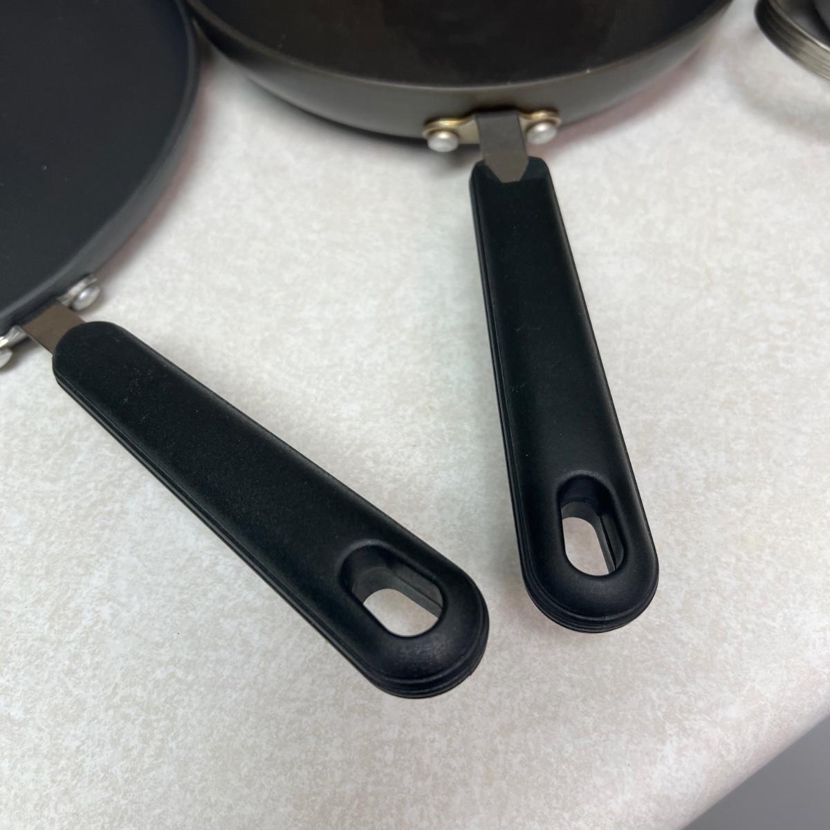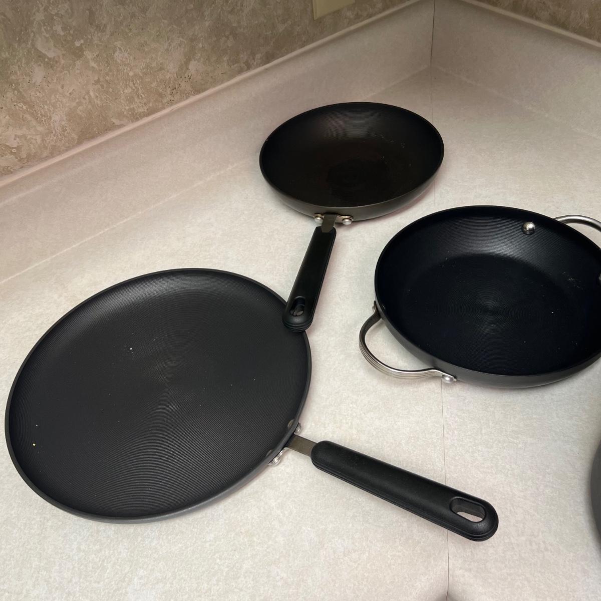 This large set of Circulon pots and pans consists of four lidded pots, a large lidded skillet, two frying pans and a third pot with two handles plus a Circulon slatted spoon.
