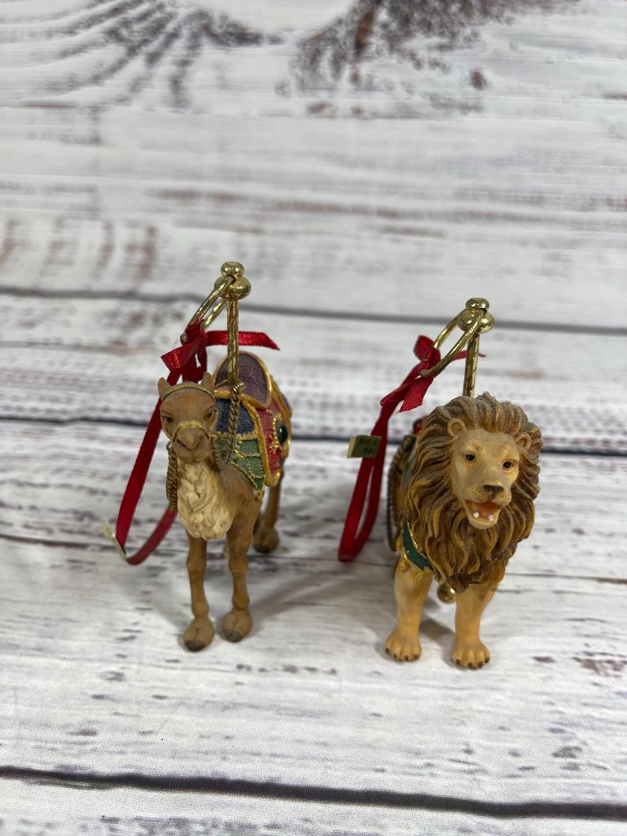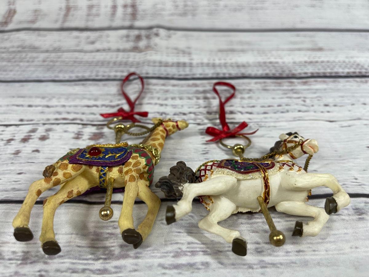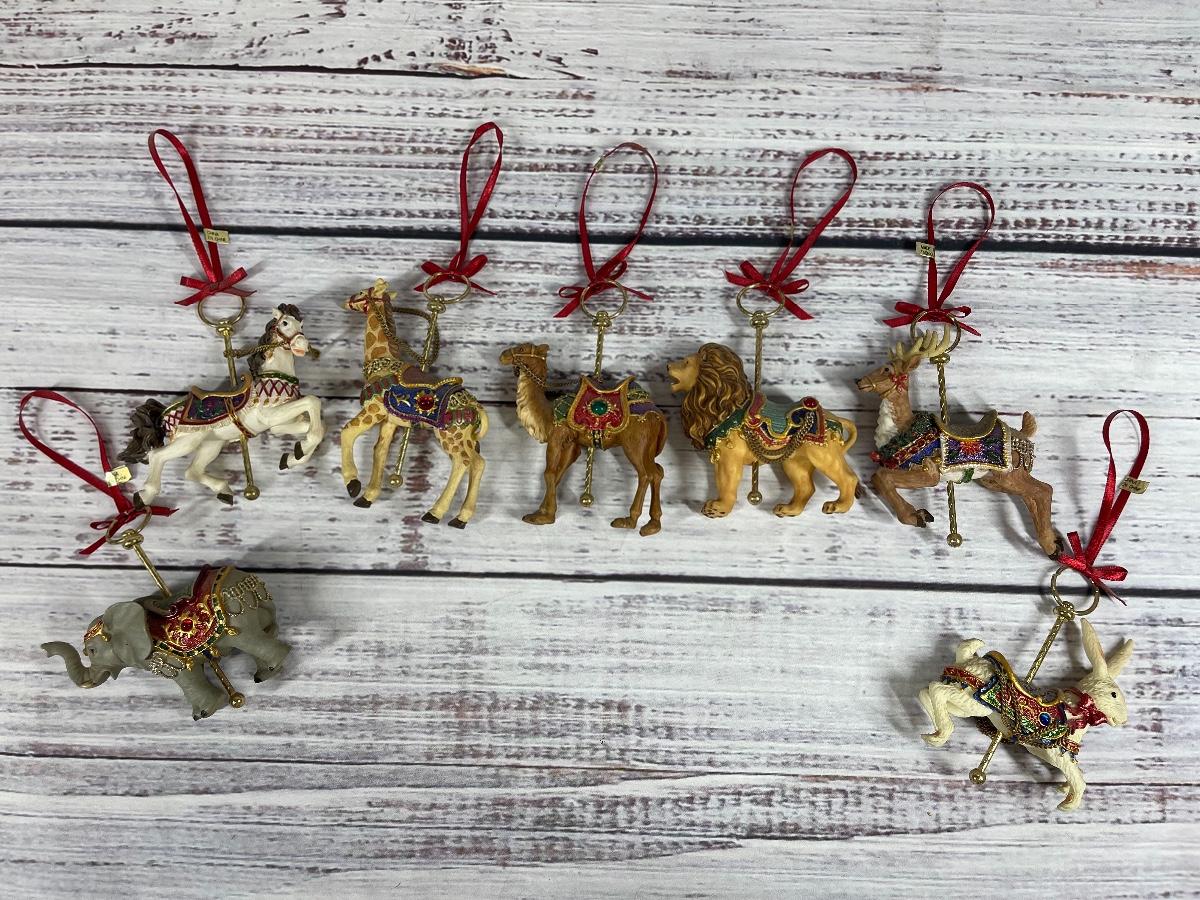 7 circus animal ornaments include: deer, elephant, giraffe, bunny, camel, horse, and lion. Dusty due to years of display. Made in China. Good condition.