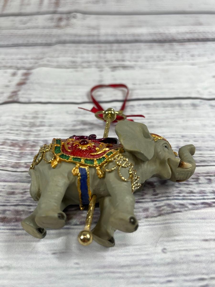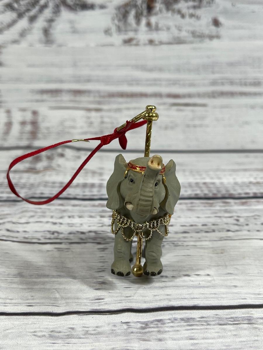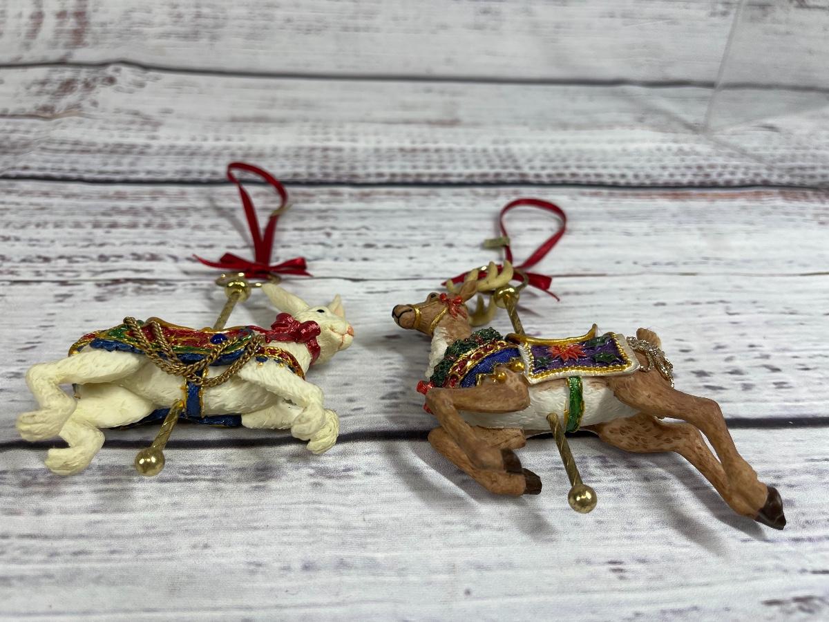 7 circus animal ornaments include: deer, elephant, giraffe, bunny, camel, horse, and lion. Dusty due to years of display. Made in China. Good condition.