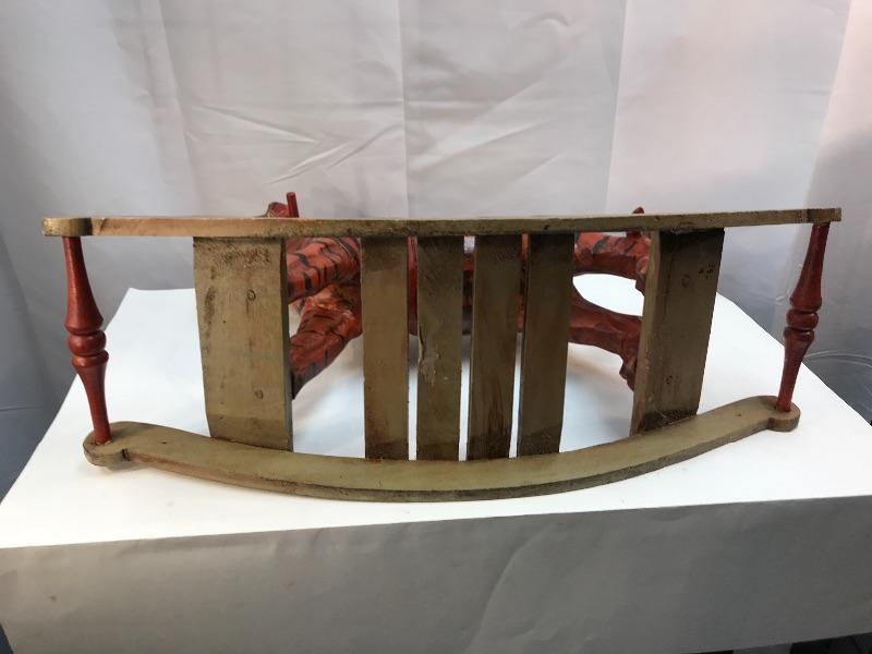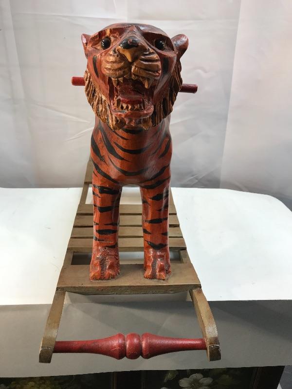 Rustic folk art ride on tiger. Similar to a rocking horse but it is a circus tiger. Great for decor and display. Measures roughly 15"h x 23"l x 9"w. No maker mark.