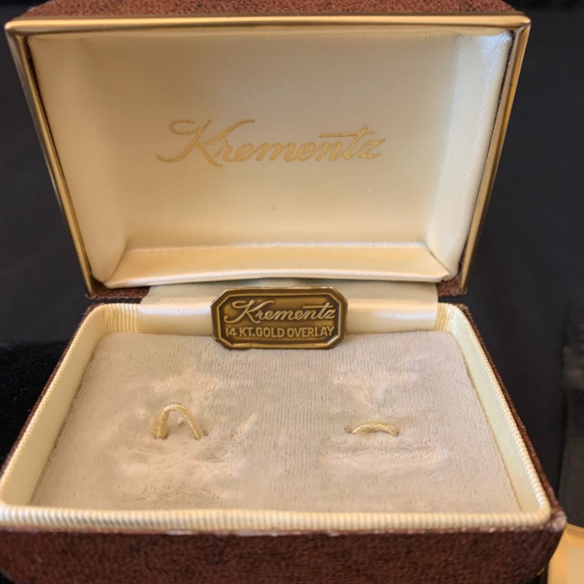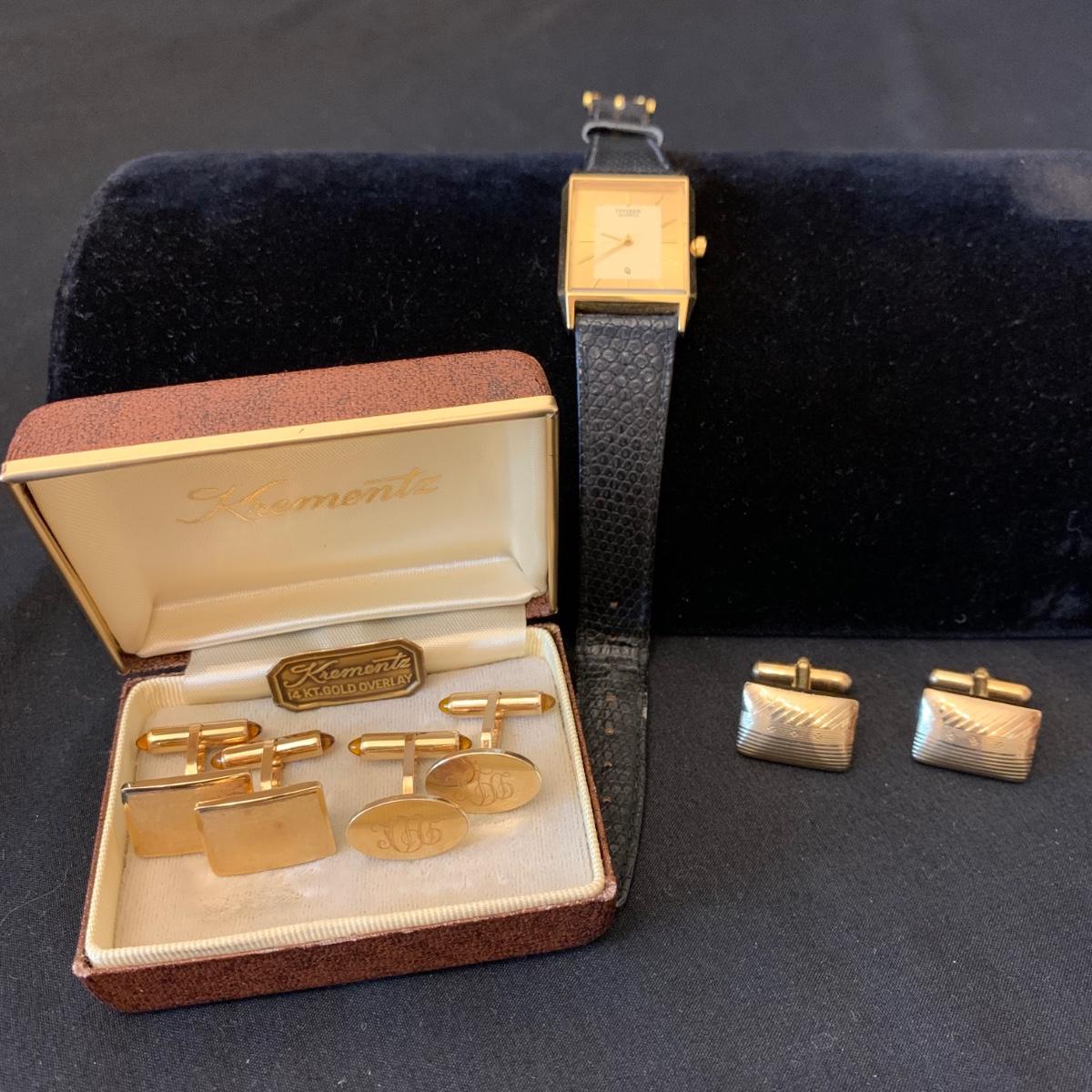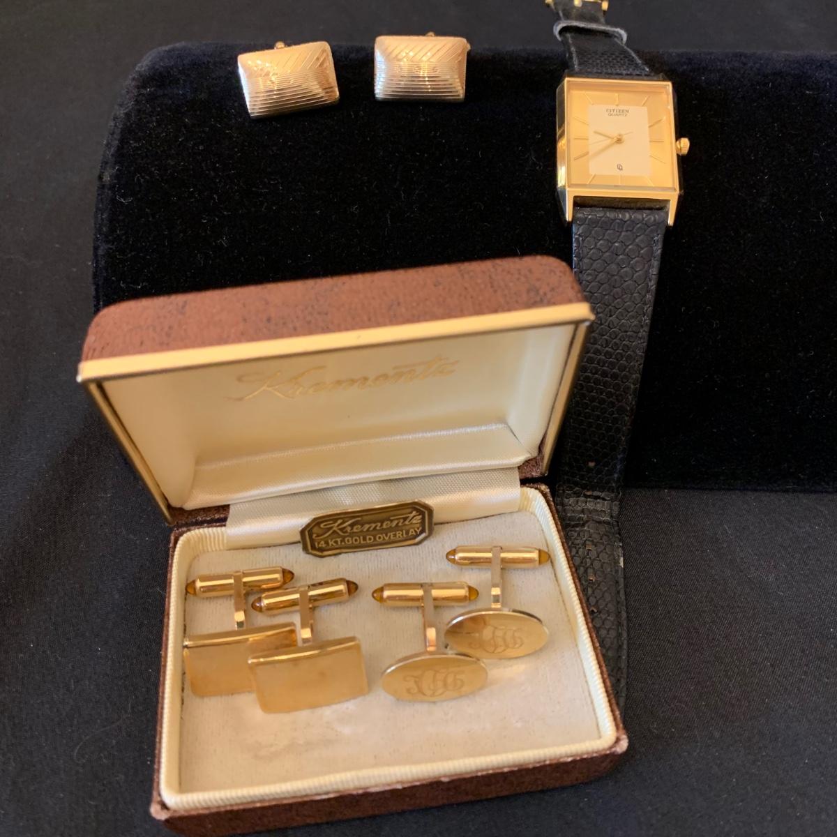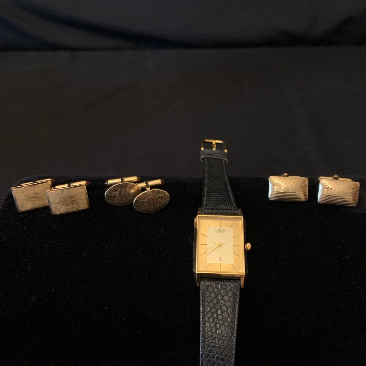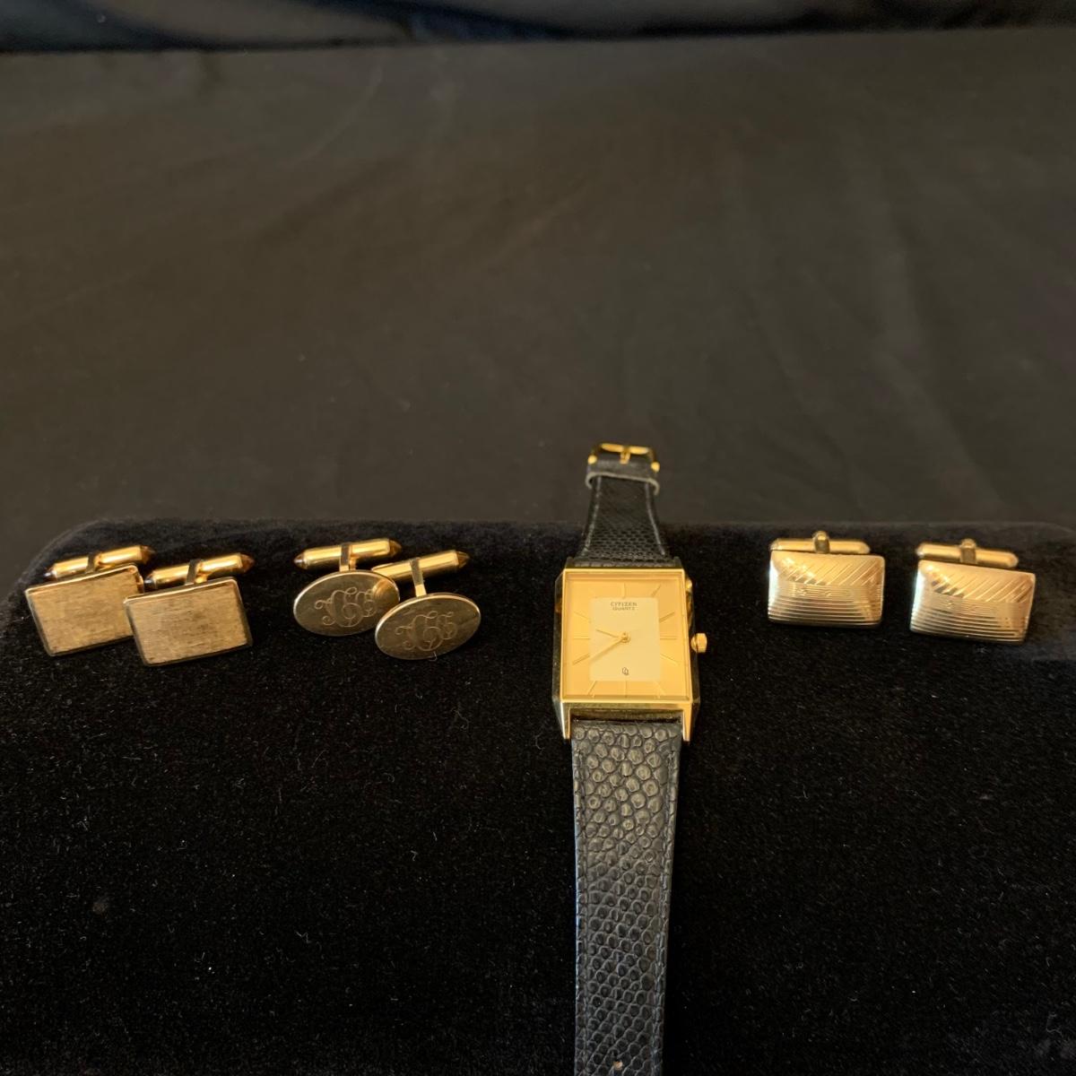 Citizen brand quartz watch with genuine leather black strap. Watch face measures 0.875” x 1”. It is not currently ticking and likely needs a new battery. Watch is marked “˜6031-S06291 SMW”. Two pairs of Krementz cufflinks are included. A Krementz box that is marked 14K Gold Overlay is included, but we cannot verify if one of these pairs or which one of these pairs were originally from this box. The third pair of cufflinks are Flex-Let brand. All three are a gold hued metal.