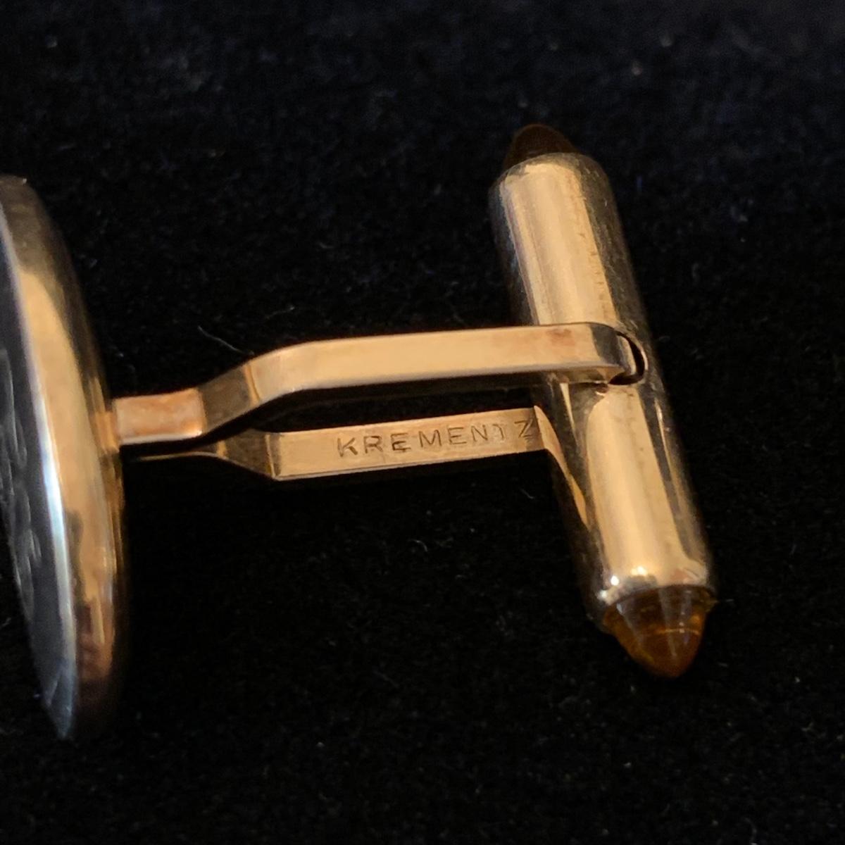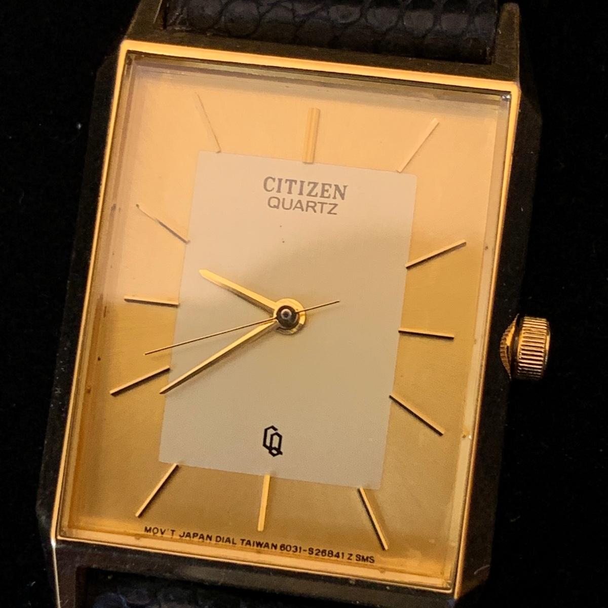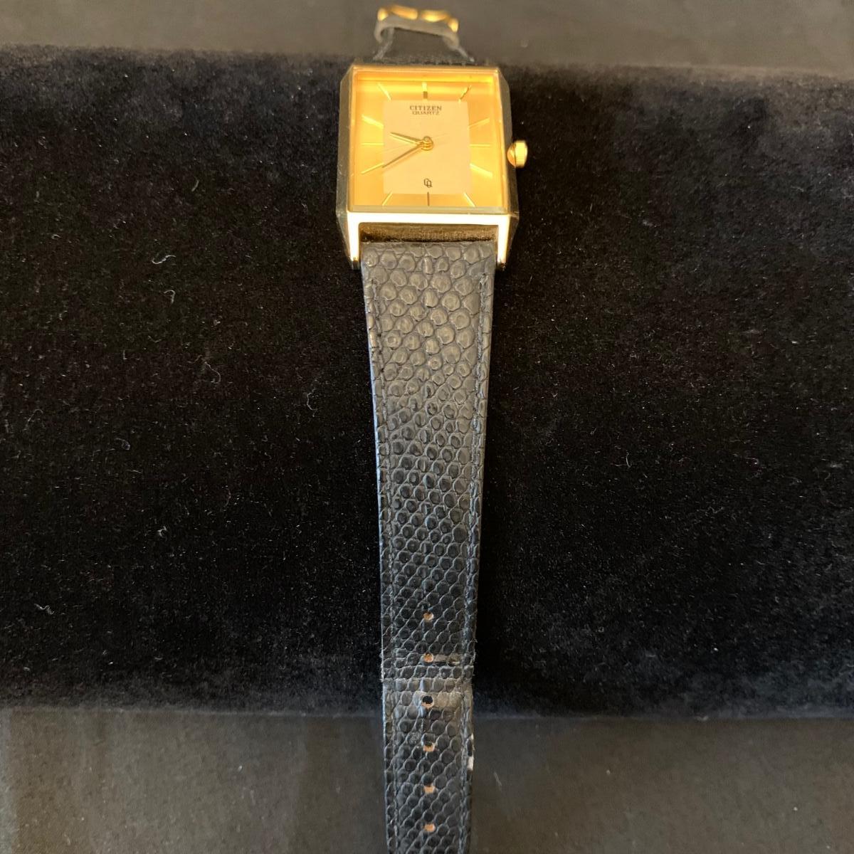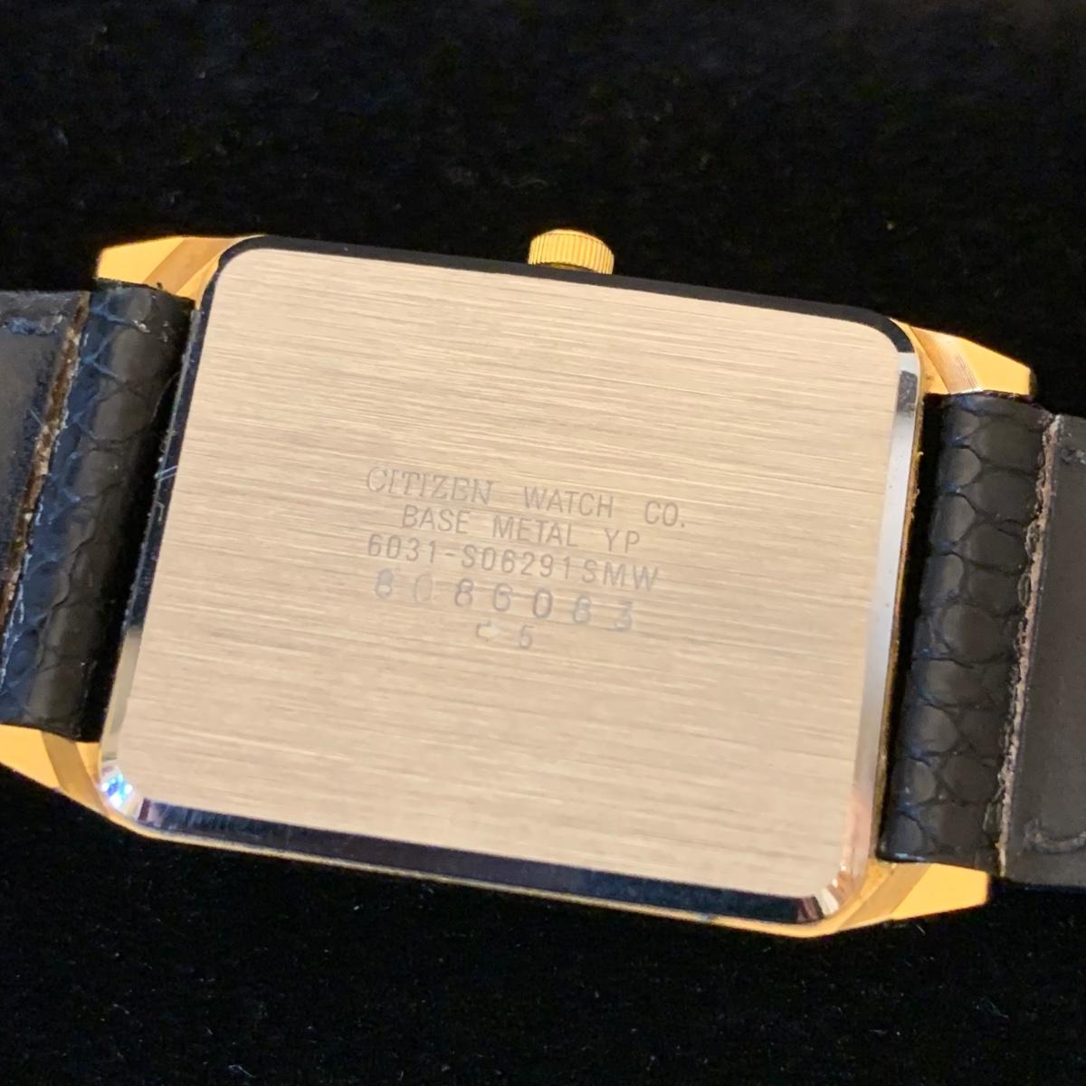 Citizen brand quartz watch with genuine leather black strap. Watch face measures 0.875” x 1”. It is not currently ticking and likely needs a new battery. Watch is marked “˜6031-S06291 SMW”. Two pairs of Krementz cufflinks are included. A Krementz box that is marked 14K Gold Overlay is included, but we cannot verify if one of these pairs or which one of these pairs were originally from this box. The third pair of cufflinks are Flex-Let brand. All three are a gold hued metal.