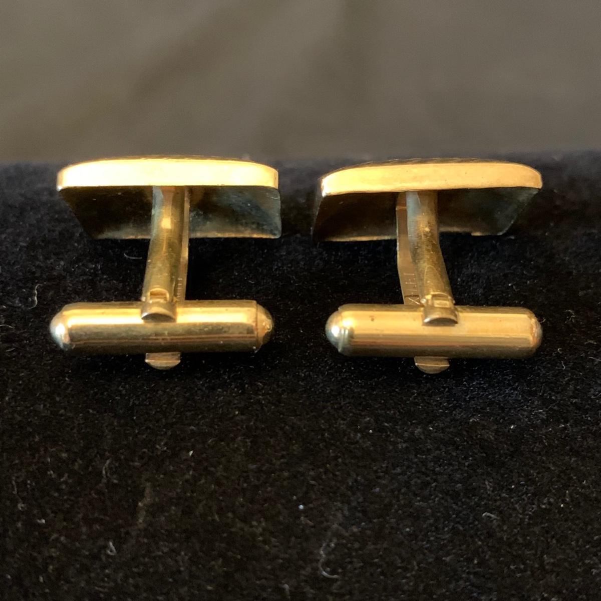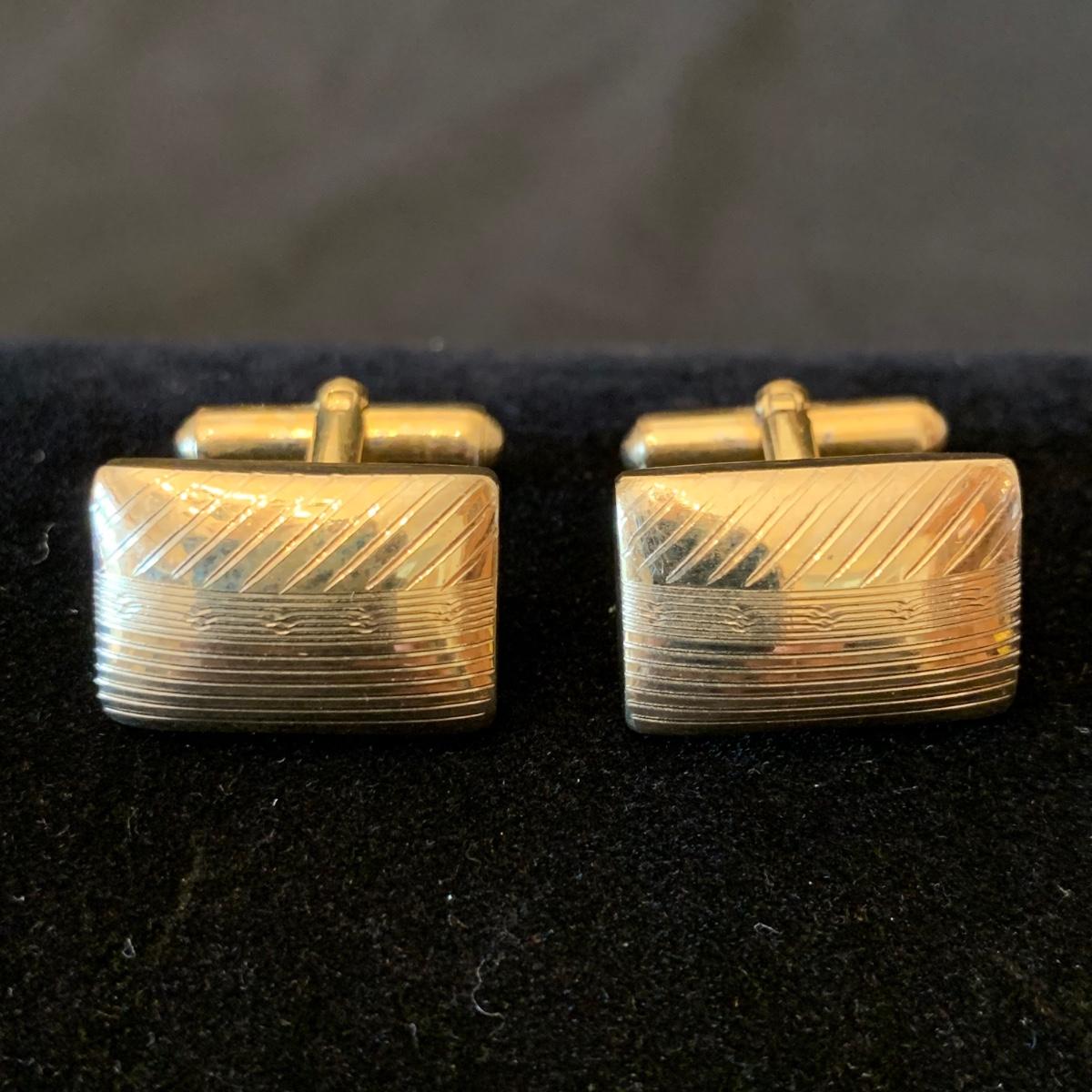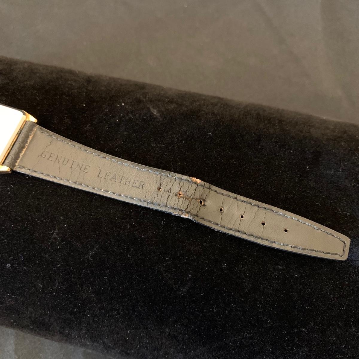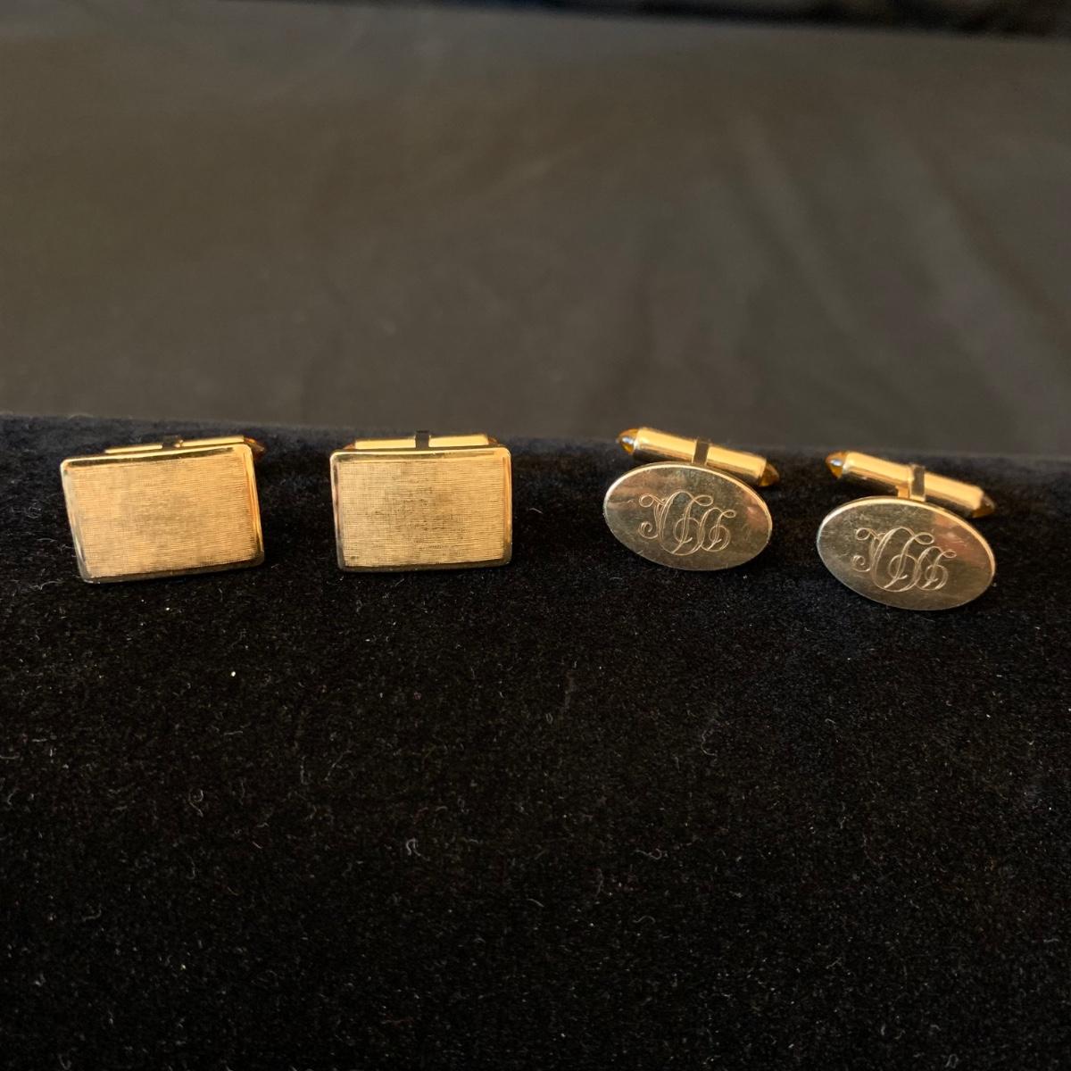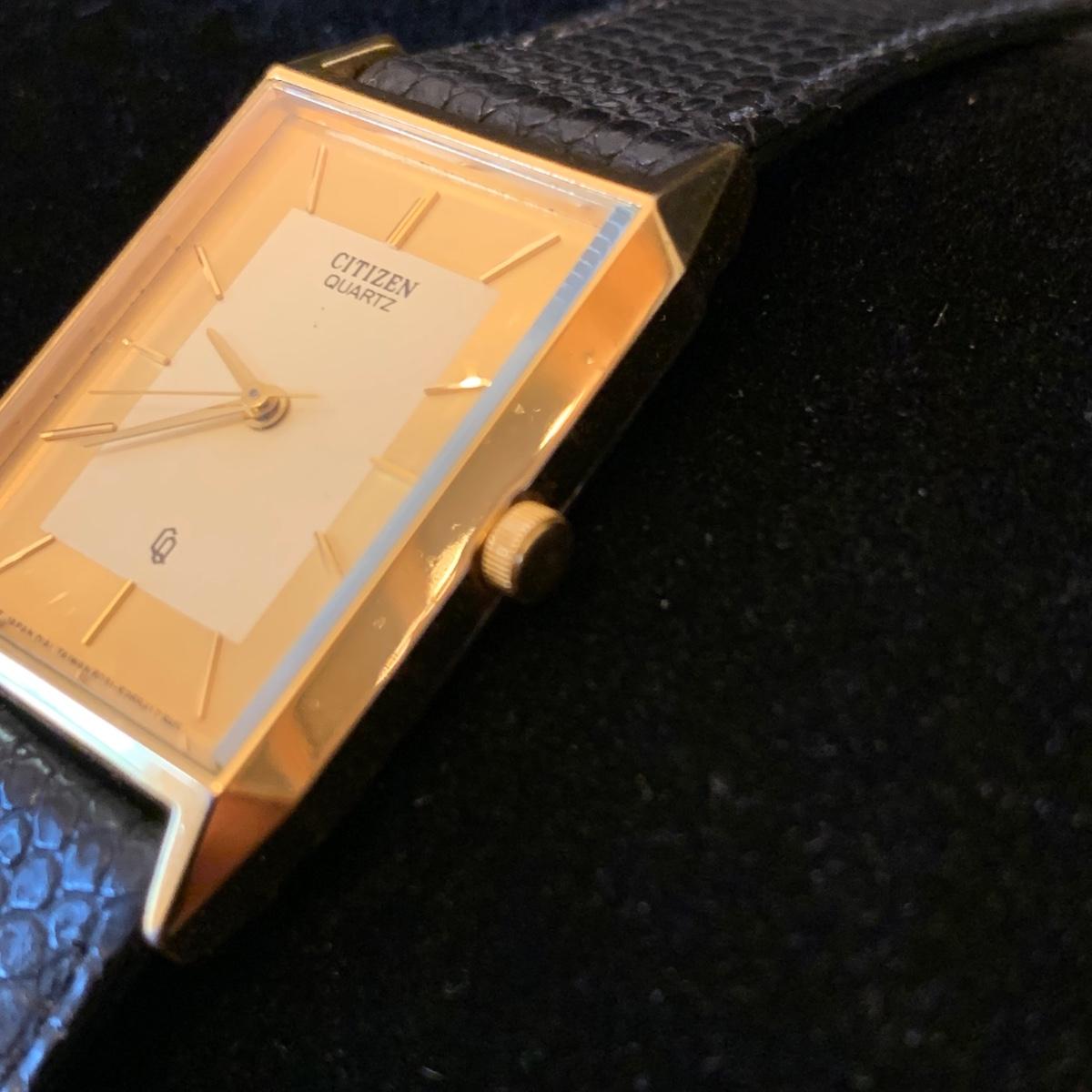 Citizen brand quartz watch with genuine leather black strap. Watch face measures 0.875” x 1”. It is not currently ticking and likely needs a new battery. Watch is marked “˜6031-S06291 SMW”. Two pairs of Krementz cufflinks are included. A Krementz box that is marked 14K Gold Overlay is included, but we cannot verify if one of these pairs or which one of these pairs were originally from this box. The third pair of cufflinks are Flex-Let brand. All three are a gold hued metal.